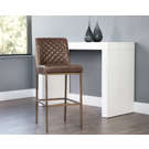 Transform bar and dining spaces with this classic barstool. Stocked in light and dark grey fabric and havana dark brown, coal grey and overcast grey faux leather with diamond stitching on the interior seat back and an antique brass frame steel frame.