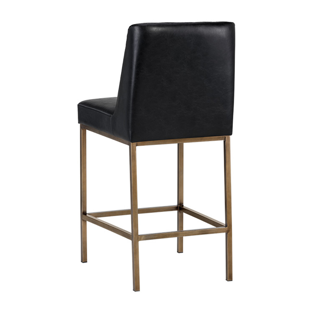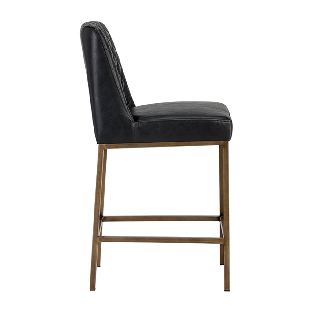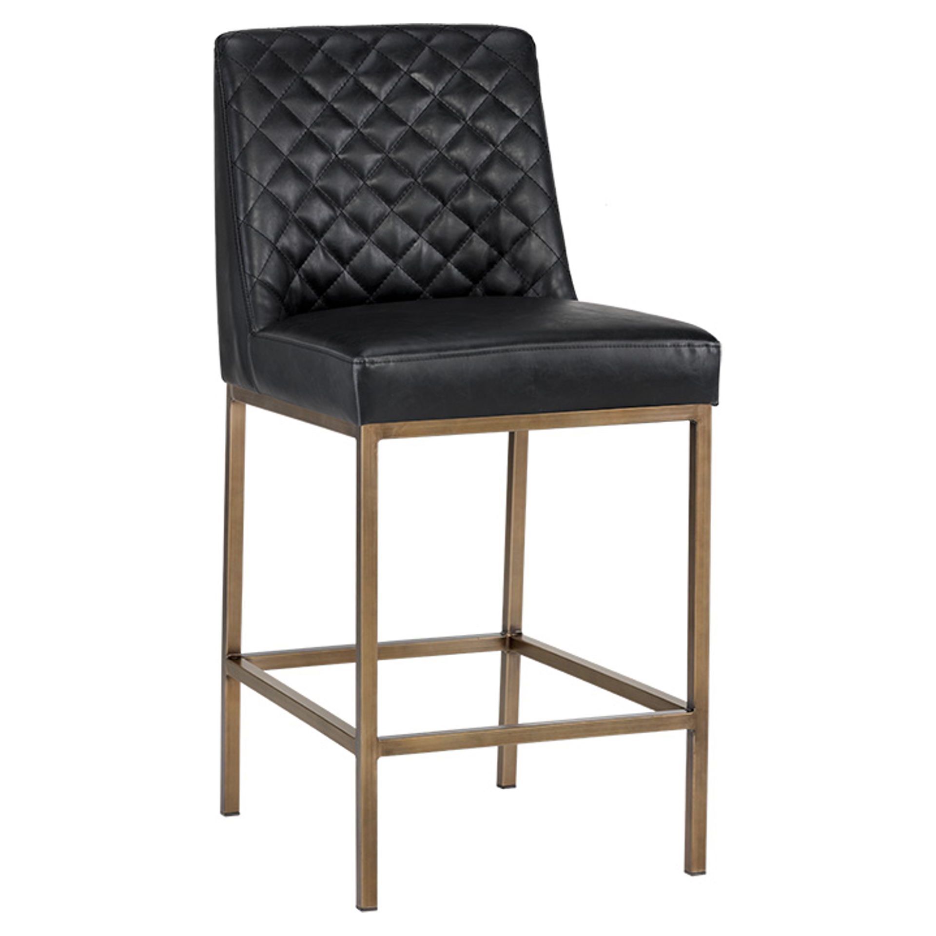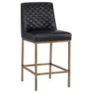 The Leighland Counter Stool will instantly elevate your space. Its padded faux leather seat provides exceptional comfort, while the diamond quilting adds a refined touch of sophistication. The brass-finished metal frame creates a striking contrast with the deep black upholstery.