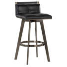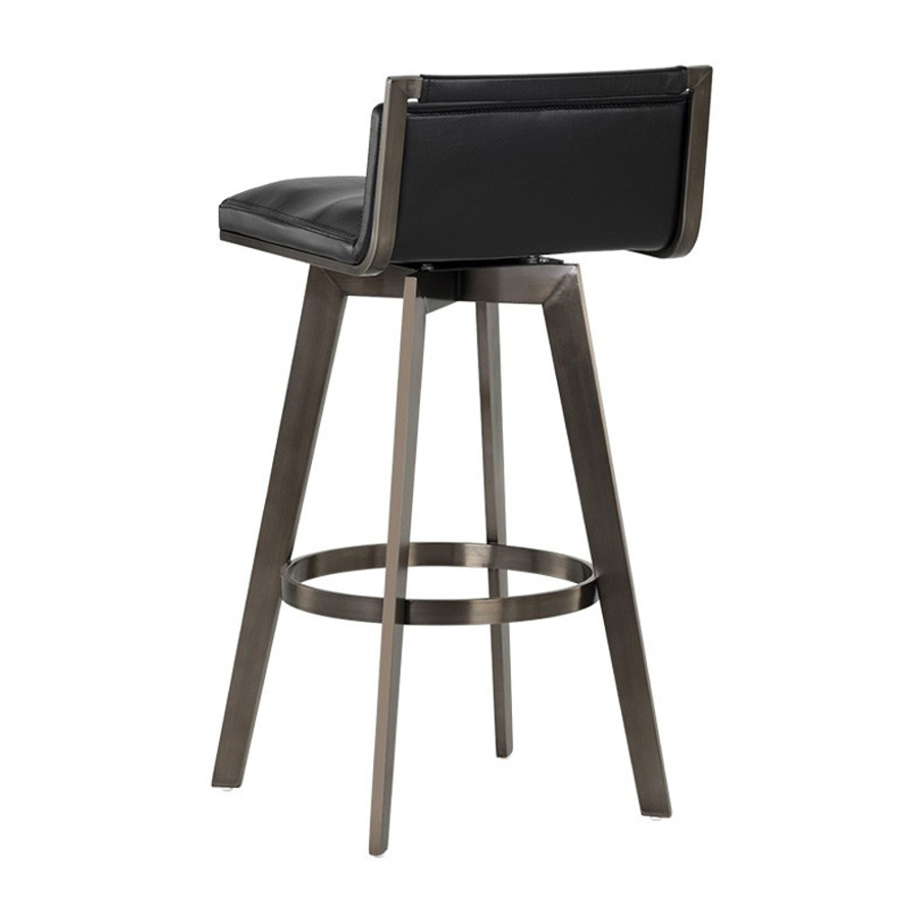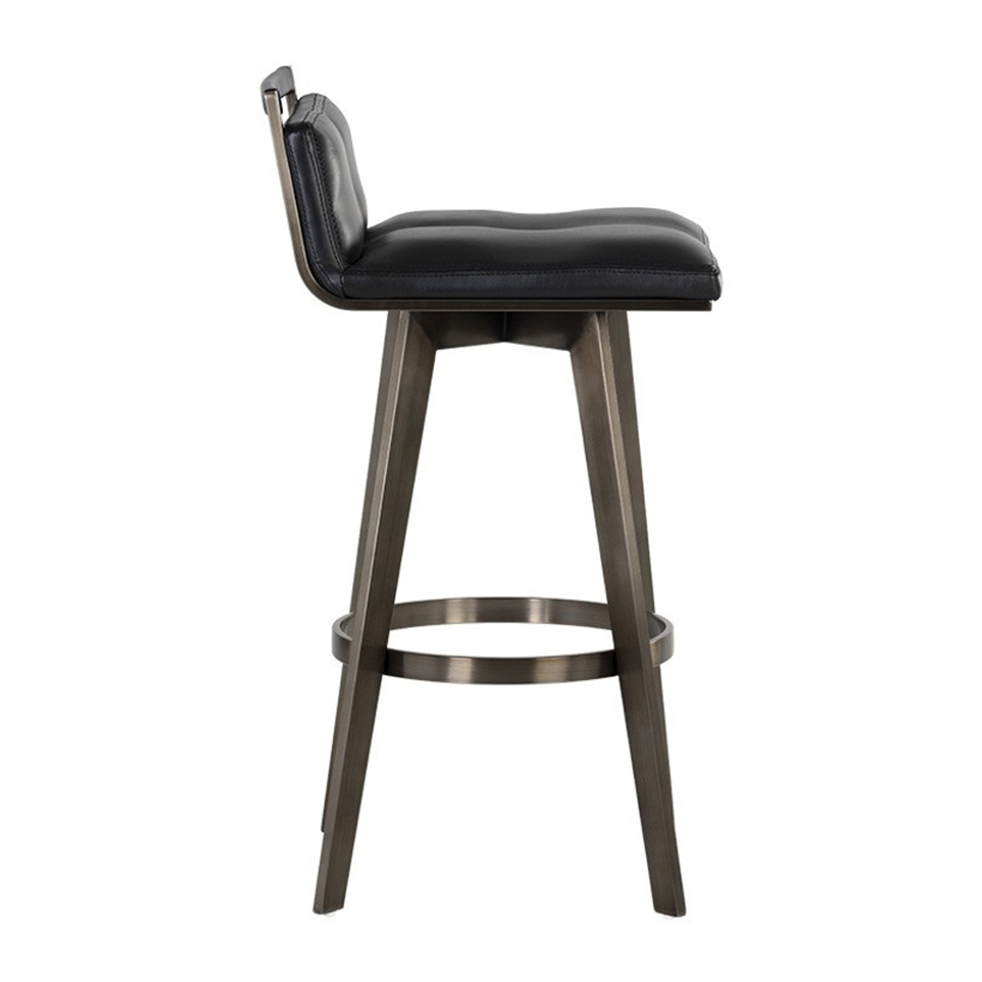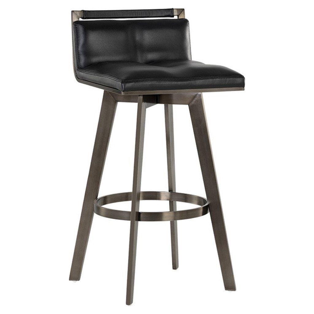 An elegant Art Deco inspired swivel bar stool with a low seat back from the Ikon collection. Features a partially exposed stainless steel frame and legs with an antique brass finish. The seat features a 360 degree swivel.