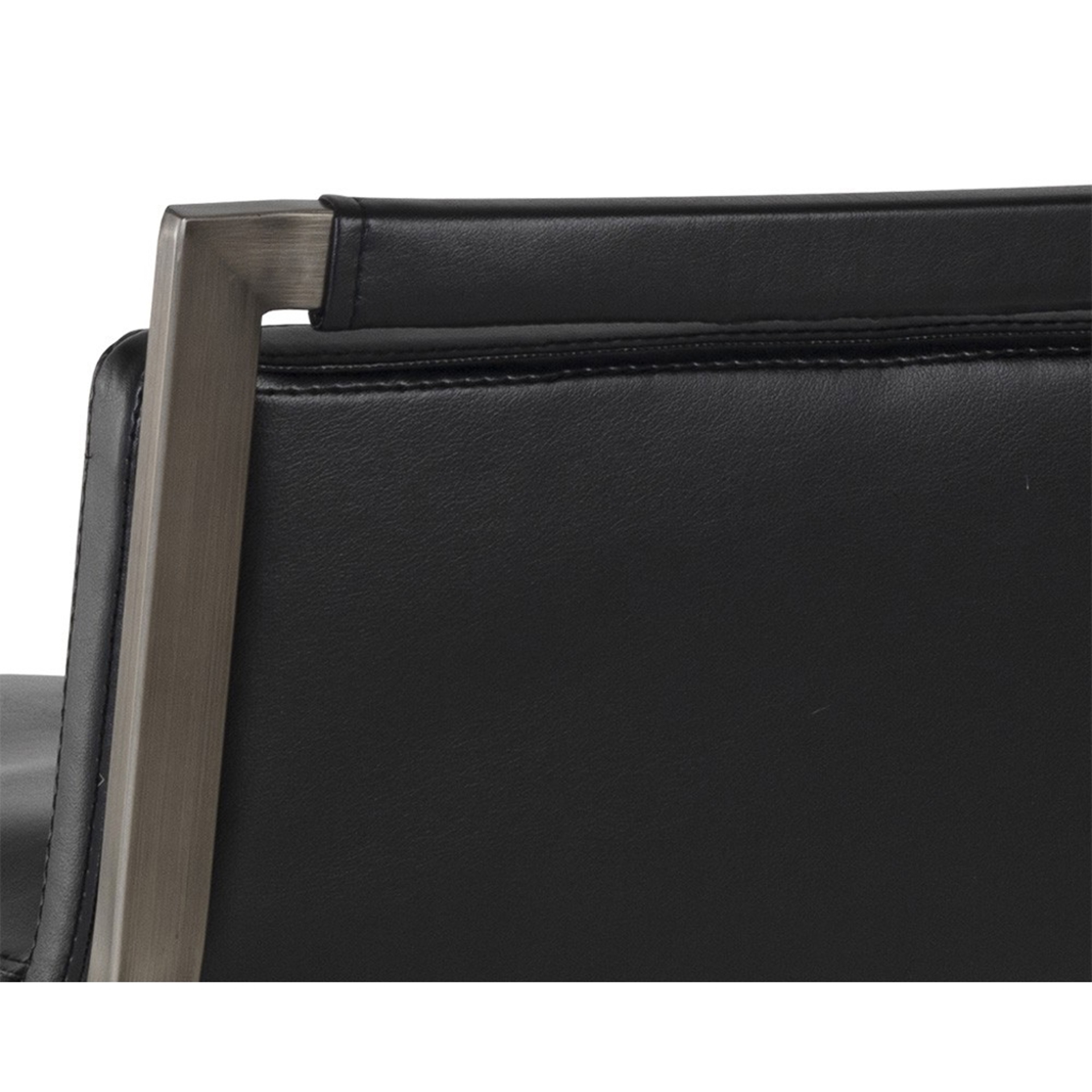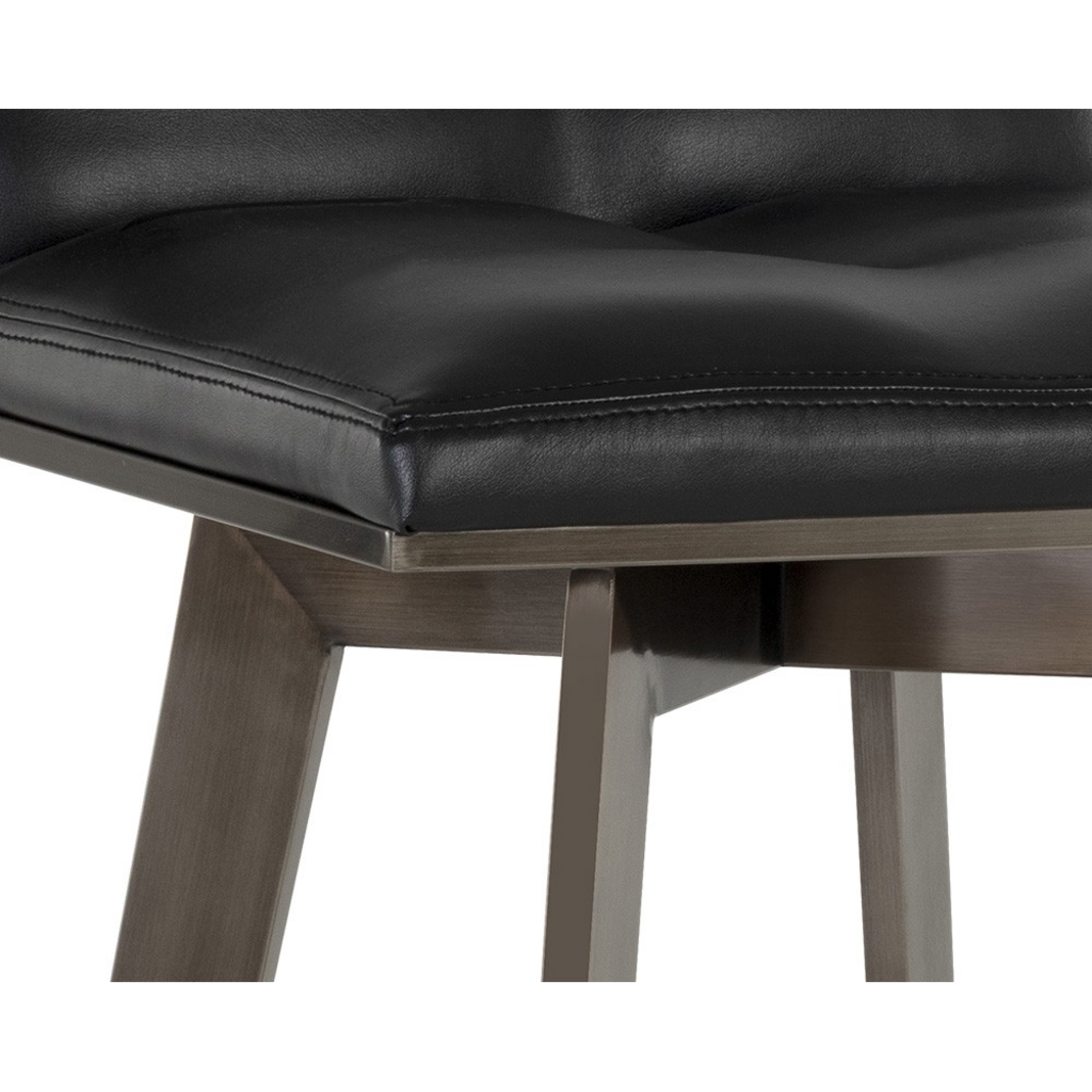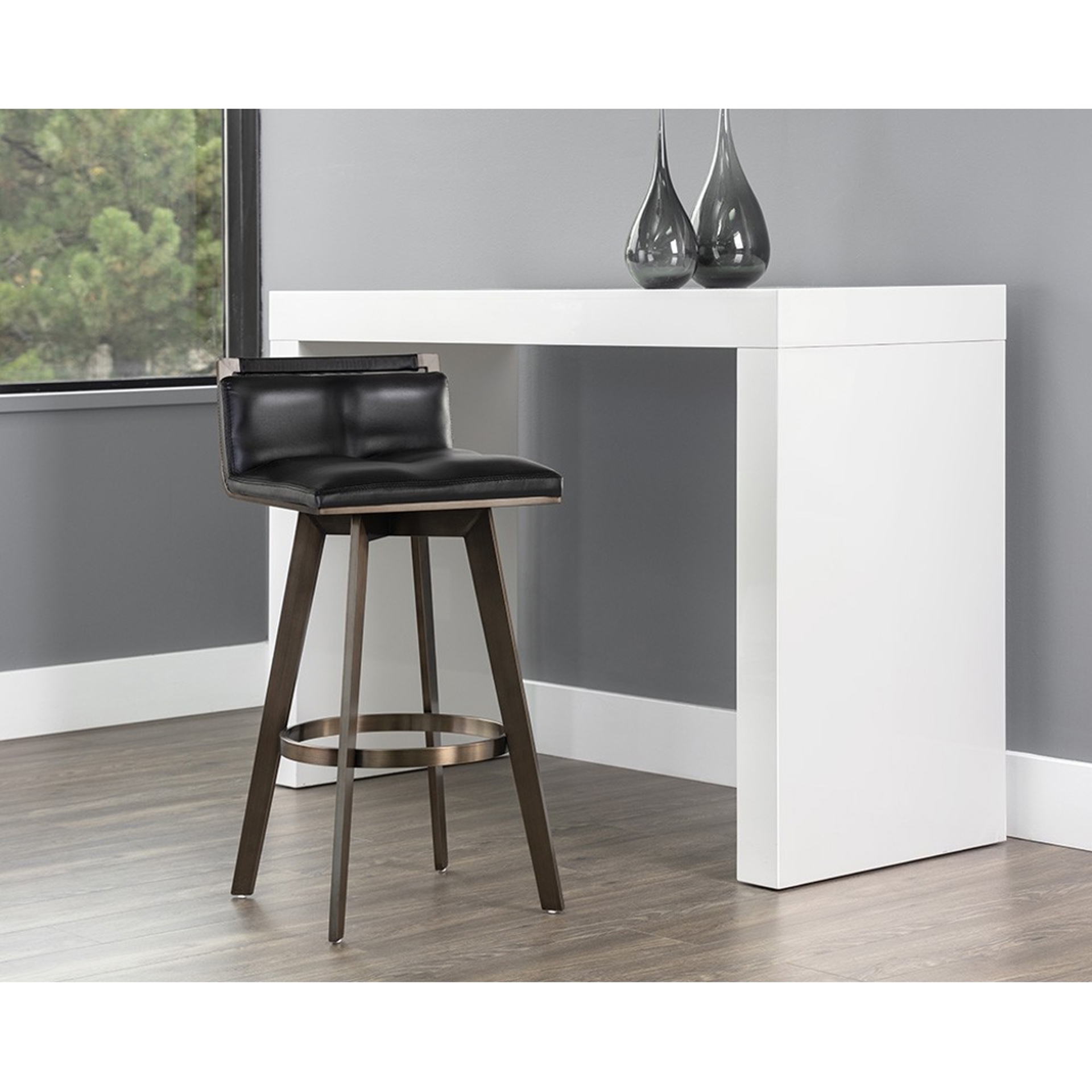 An elegant Art Deco inspired swivel bar stool with a low seat back from the Ikon collection. Features a partially exposed stainless steel frame and legs with an antique brass finish. The seat features a 360 degree swivel.