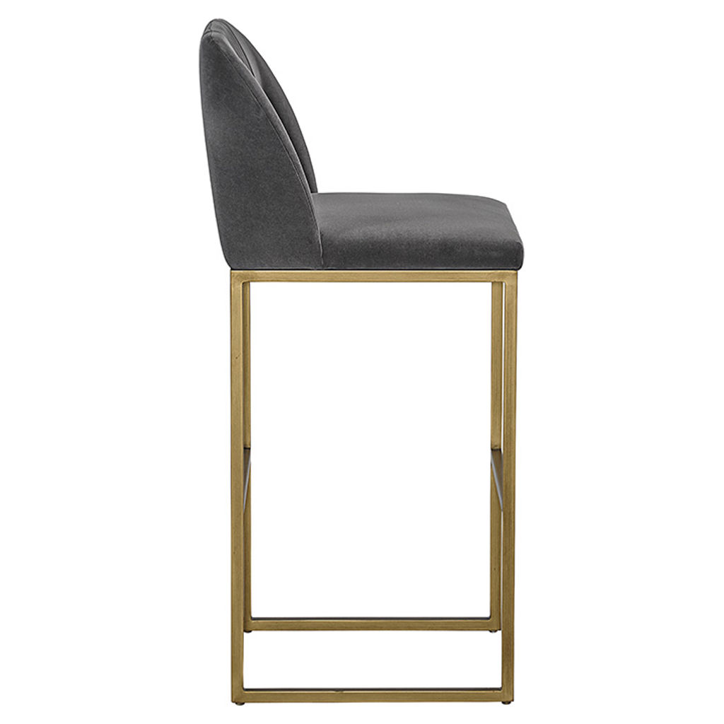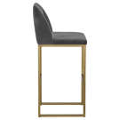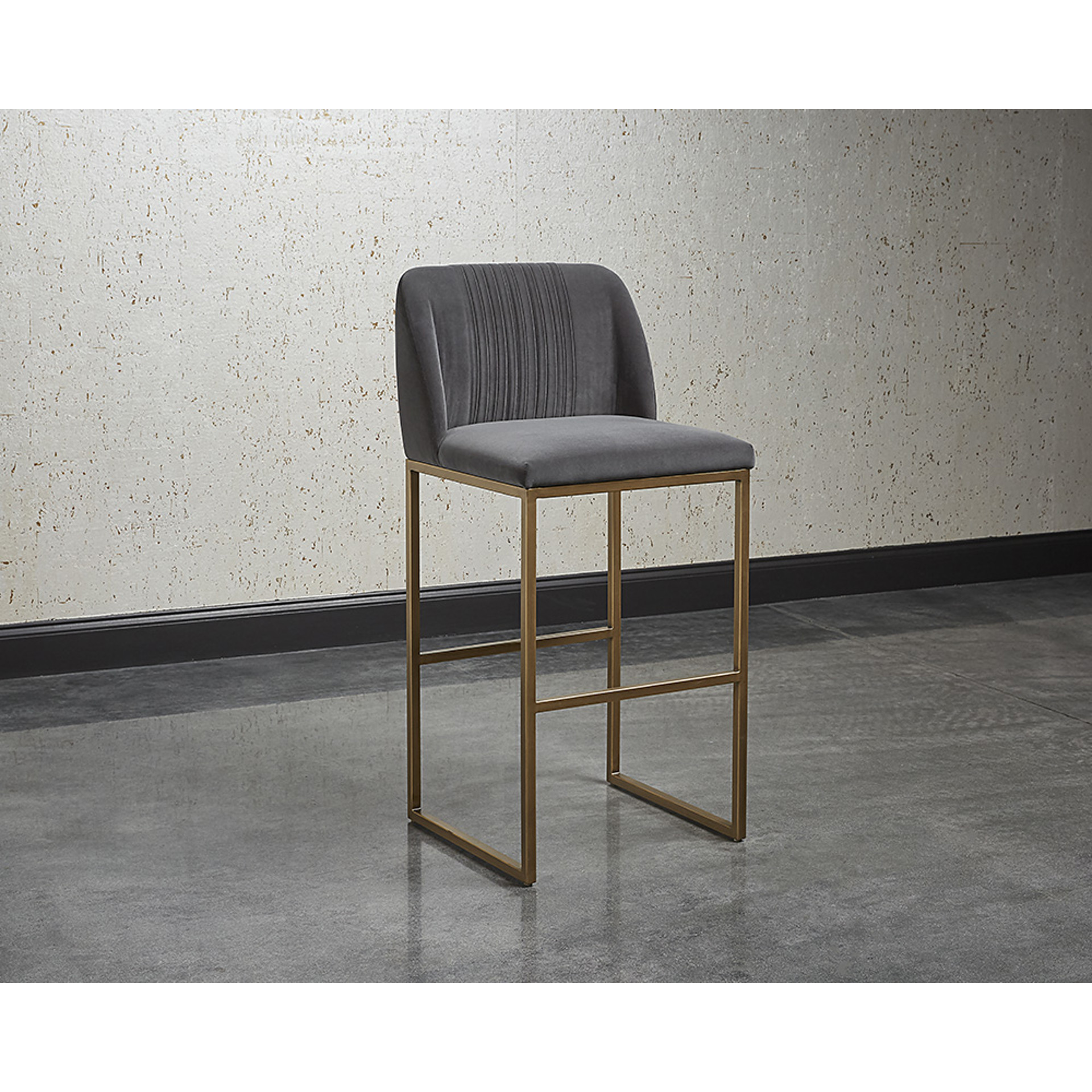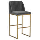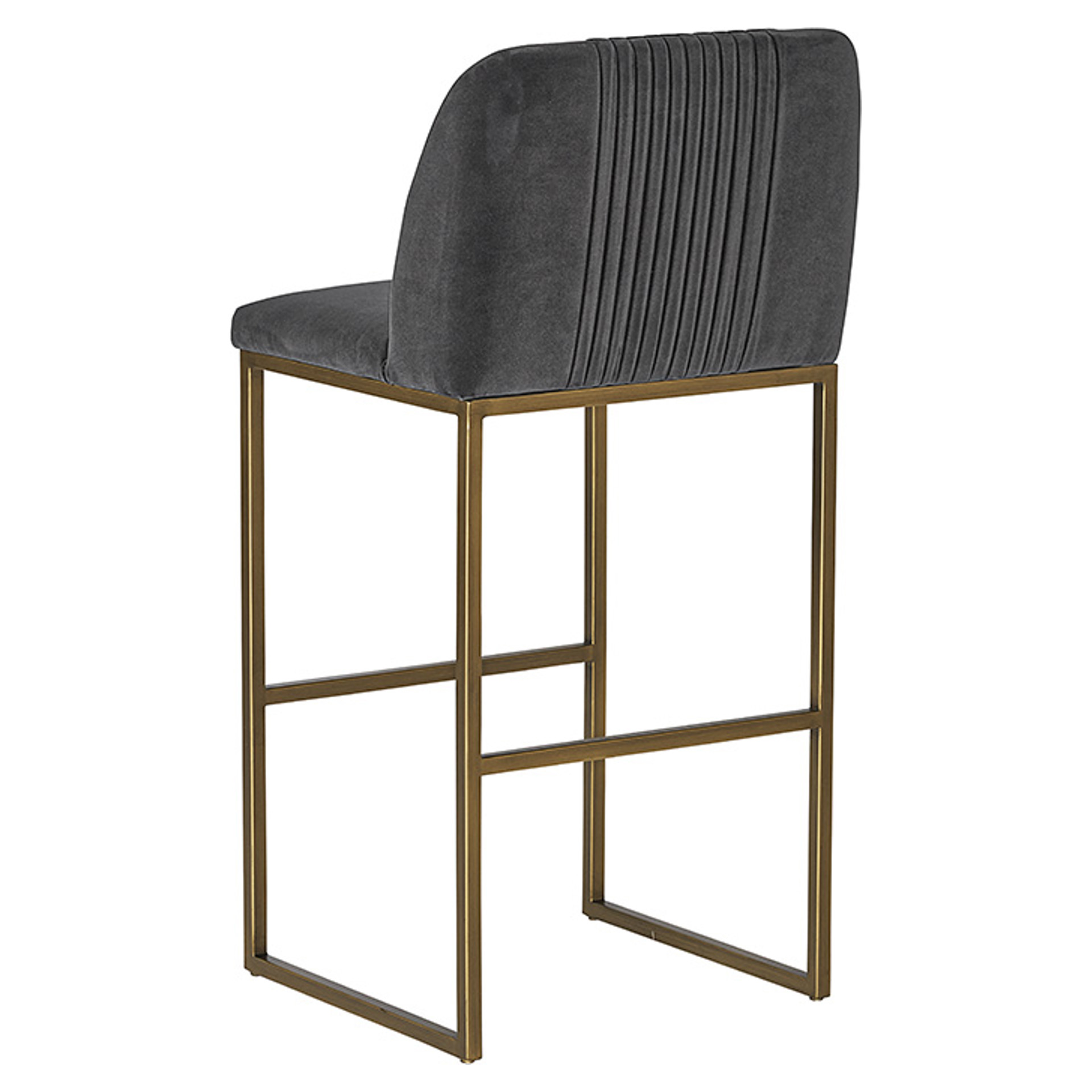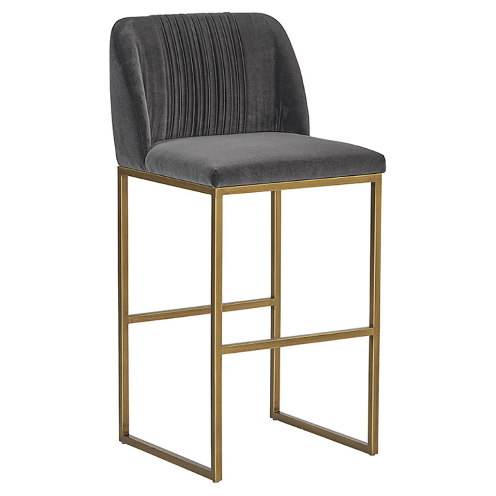 A transitional bar stool from our MIXT collection that offers style and comfort. Features delicate ruching on the rounded back and exposed antique brass legs. Performance fabric is water-repellent, stain-resistant, and easy to clean. Suitable for a variety of dining, kitchen, and bar spaces of all sizes.