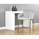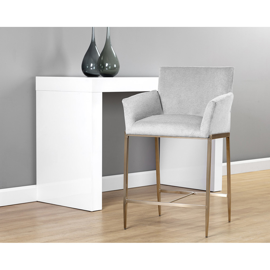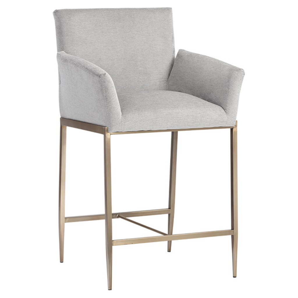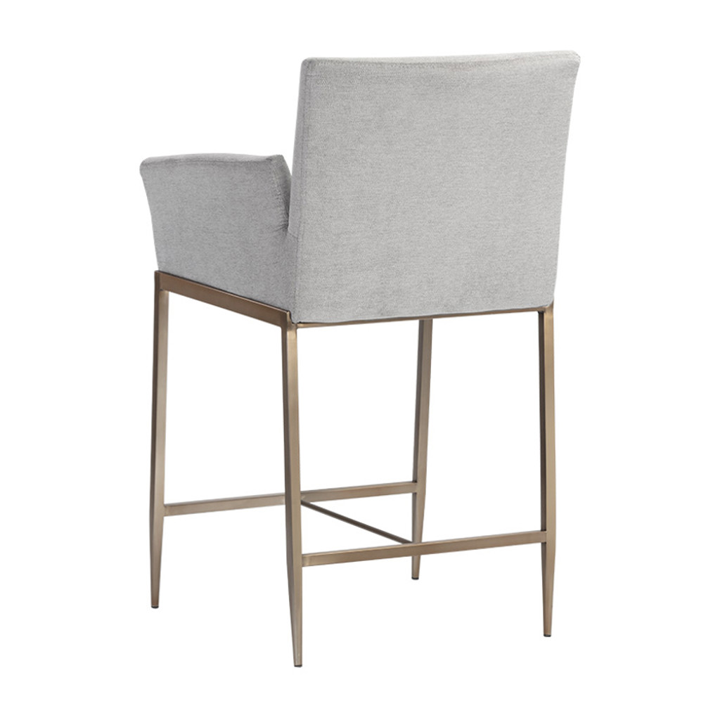 A modern counter stool with contemporary style. This charming stool from the Ikon collection sits comfortably while bringing a touch of elegance to dining spaces. Finished in Club Stone Polo performance fabric with an antique brass frame. Performance fabric is water repellent, stain resistant and easy to clean. Suitable for a variety of dining, kitchen and bar spaces of all sizes.