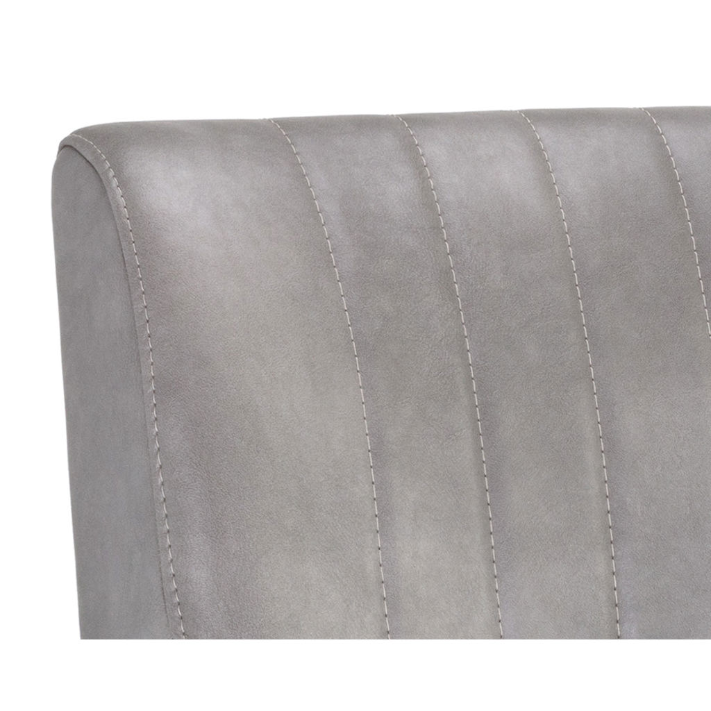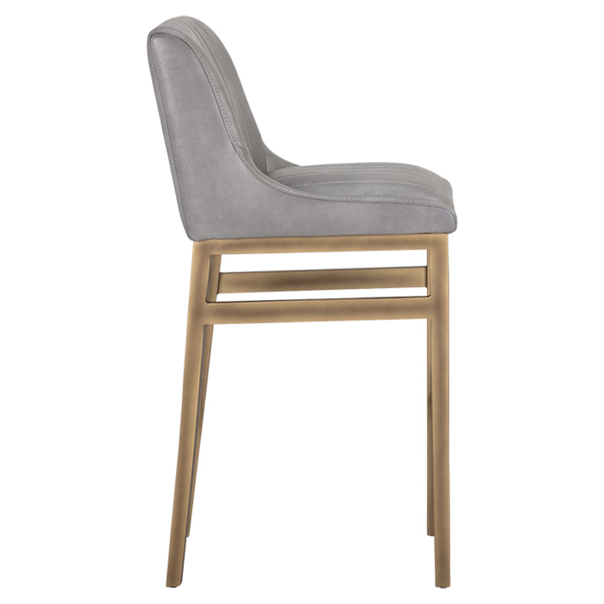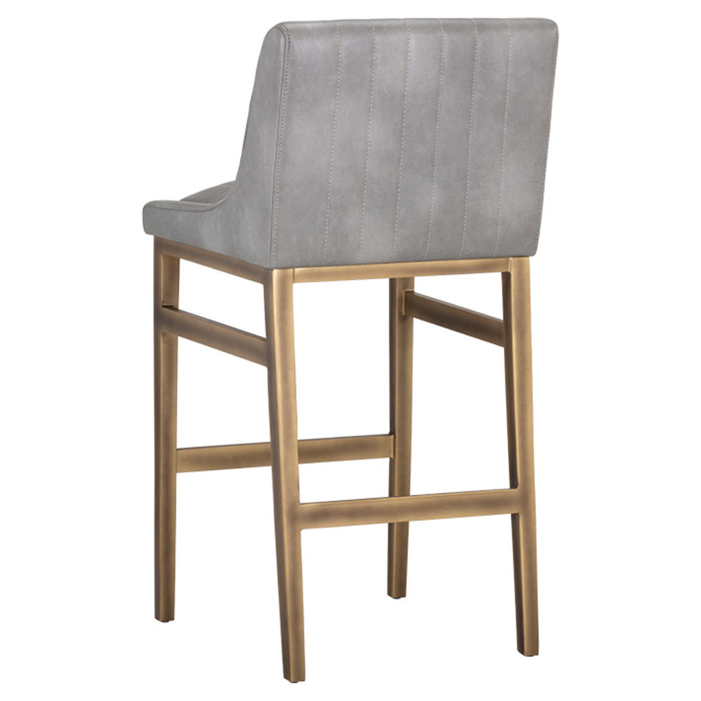 An urban design stool with bold vertical channel upholstery on the seat and back in vintage faux leather. Finished with a rustic bronze steel frame and stretchers. Ideal for residential and commercial environments. Suitable for a variety of dining, kitchen and bar spaces of all sizes.