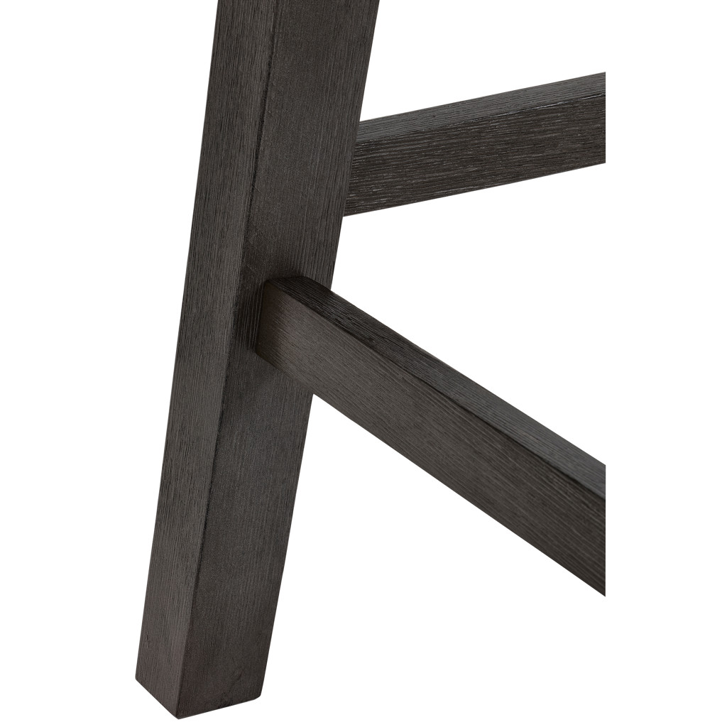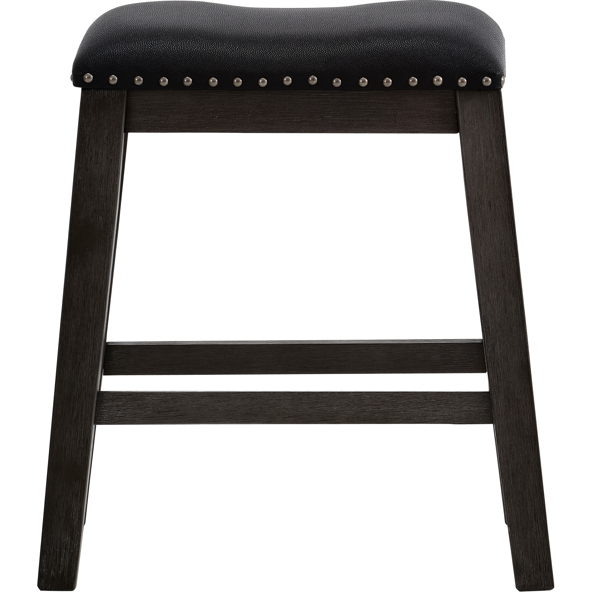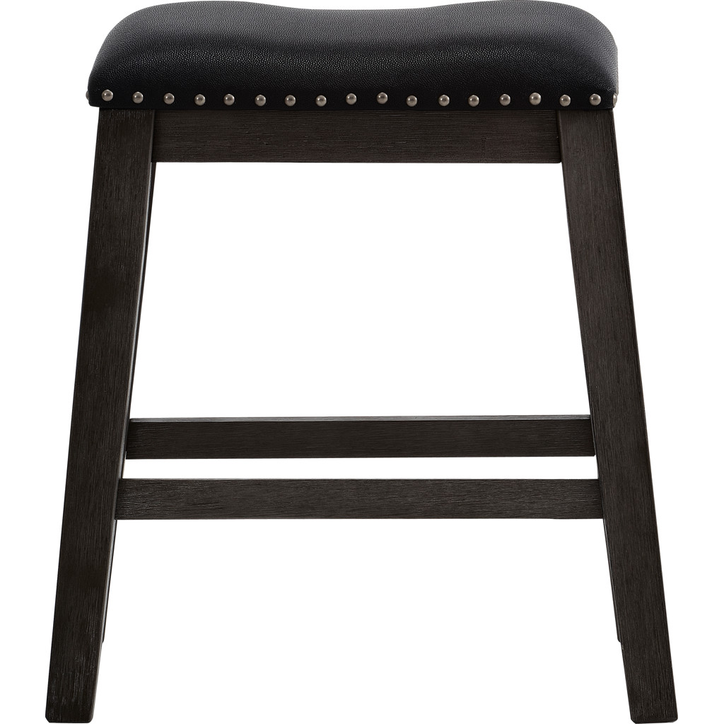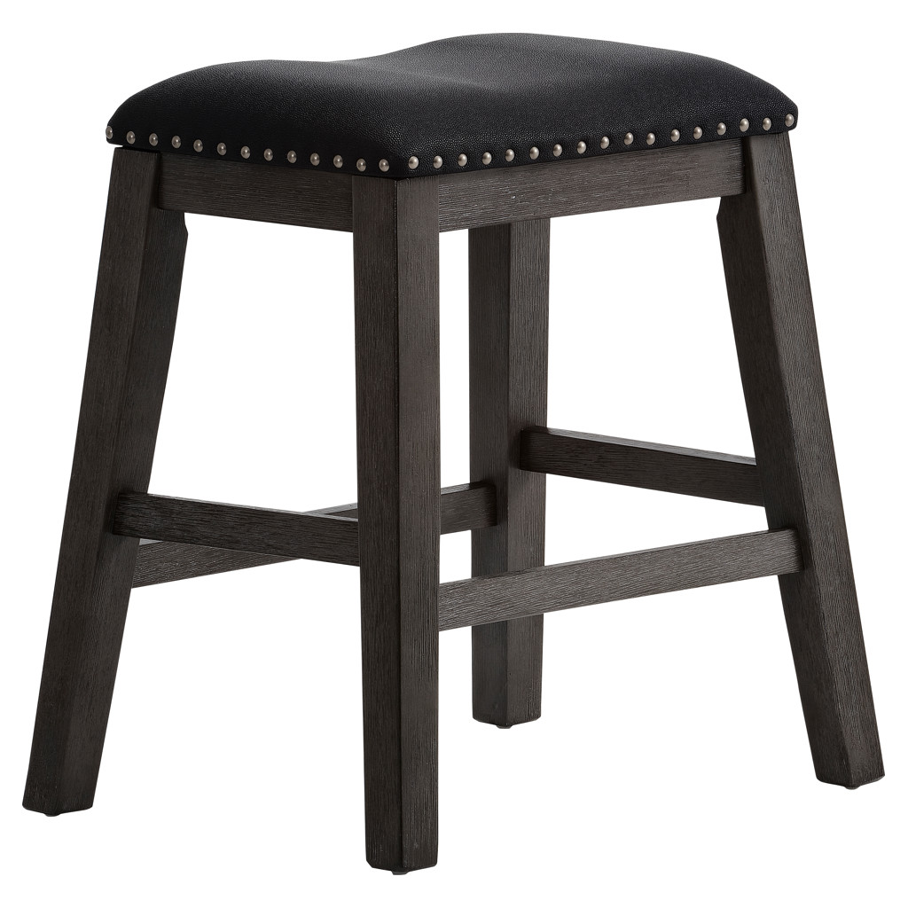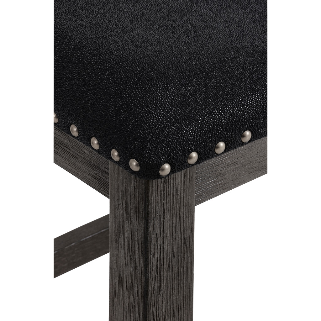 This counter stool combines comfort and elegance with its padded black faux leather seat and refined nailhead trim. Its dark-toned wooden frame provides outstanding strength, while the stretchers ensure perfect stability.