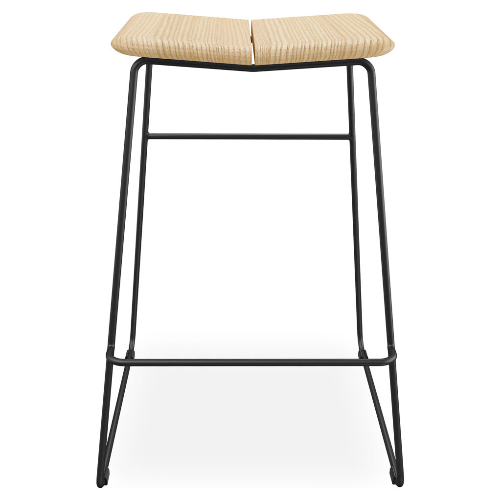 Inspired by contemporary Scandinavian design, the Aero bar stool features a gently rounded seat composed of two perfectly balanced pieces of FSC®-certified solid ash wood resting on an airy, curved metal frame. Playful and lightweight, it's the ideal perch for happy hour. Choose from three contemporary shades to bring your décor to life. Also available as a stool and counter stool.