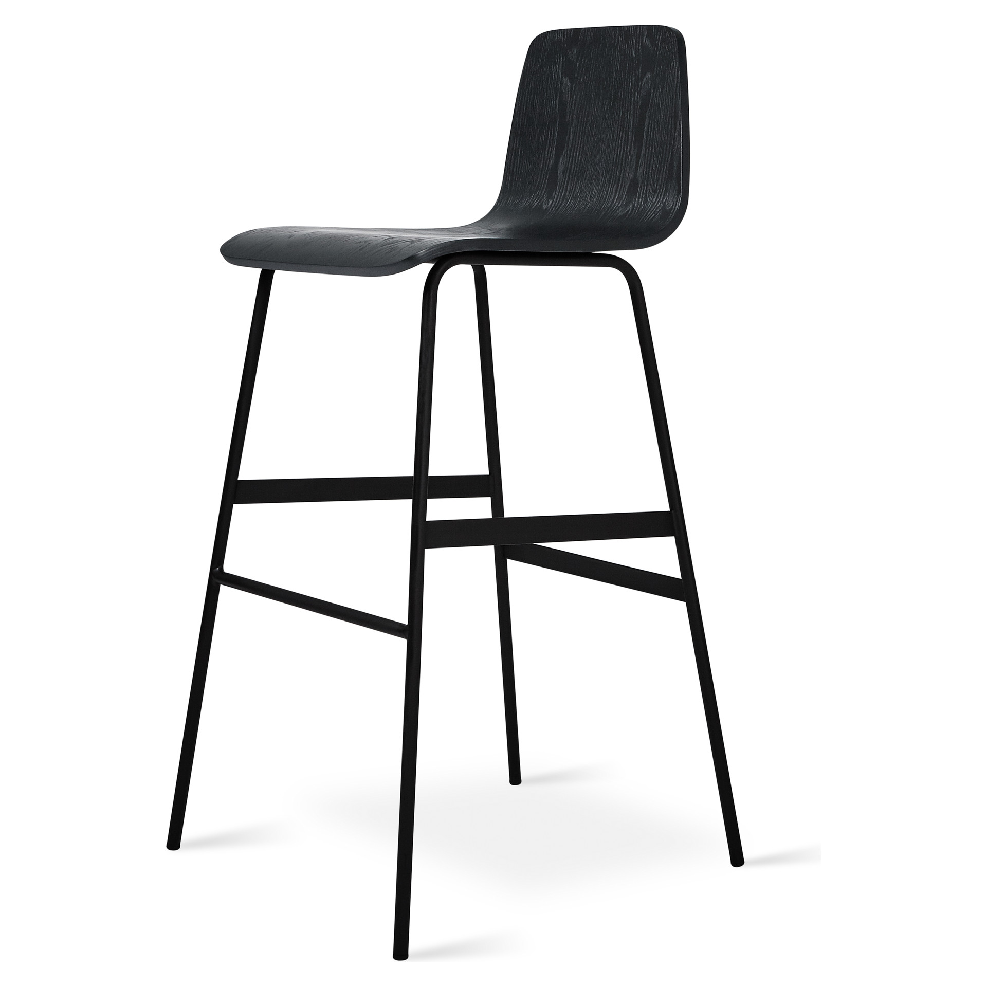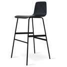 The Lecture bar stool is a modern reinterpretation of a classic elementary school chair design, adapted for use at bar height. The design features a one-piece seat and backrest in curved plywood, with a functional leather and brass handle. The black powder-coated steel legs are reinforced with sturdy flat-bar stabilizers and a simple ergonomic footrest. The Lecture bar stool combines comfort, design and durability. Available in black, walnut or ash.