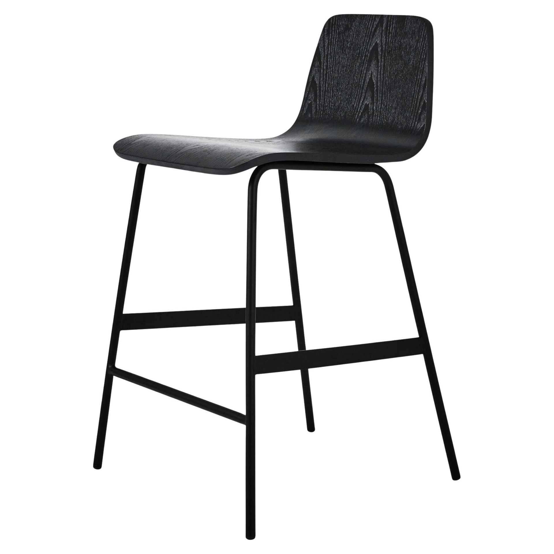 The Lecture stool is a modern reinterpretation of a classic elementary school chair design, adapted for use at counter height. It features a one-piece seat and backrest in curved plywood, with a functional leather and brass handle. The black powder-coated steel legs are reinforced by sturdy flat-bar stabilizers and a simple ergonomic footrest. The Reading stool combines comfort, design and durability. Available in black, walnut or ash.