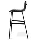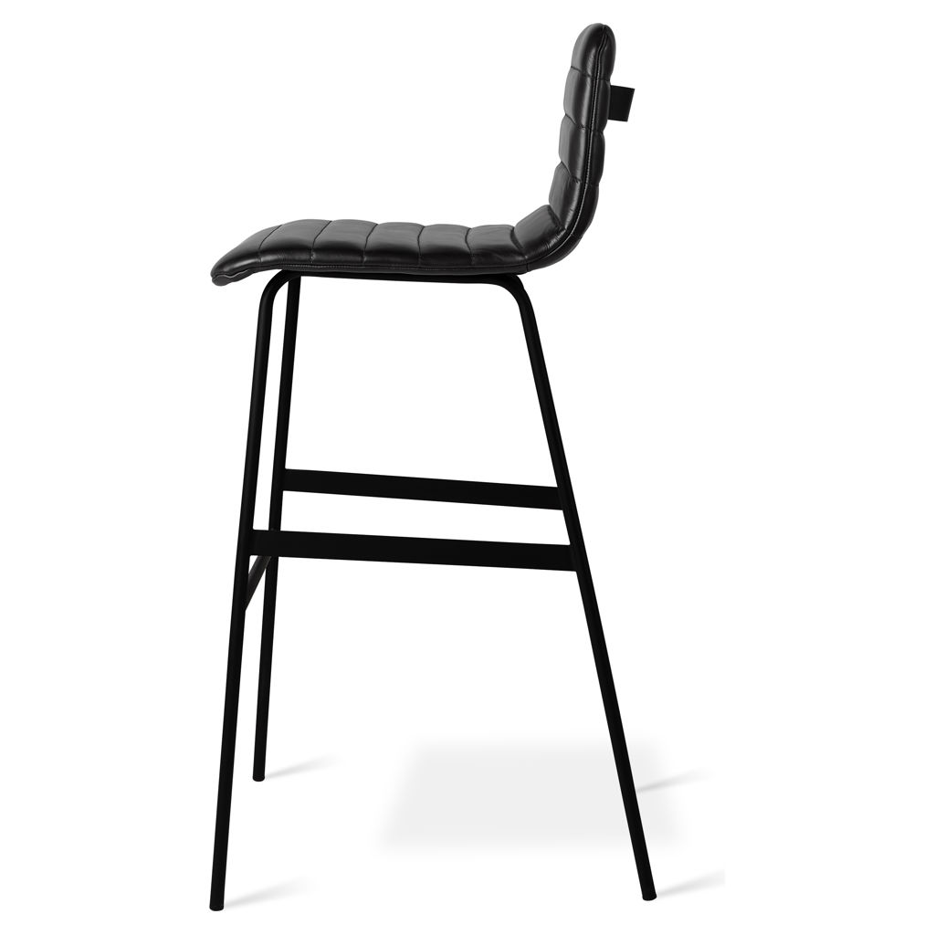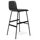 This version features a one-piece upholstered seat and backrest, with unique chain-stitch detailing. The black powder-coated steel legs are reinforced by sturdy flat-bar stabilizers and a simple ergonomic footrest.