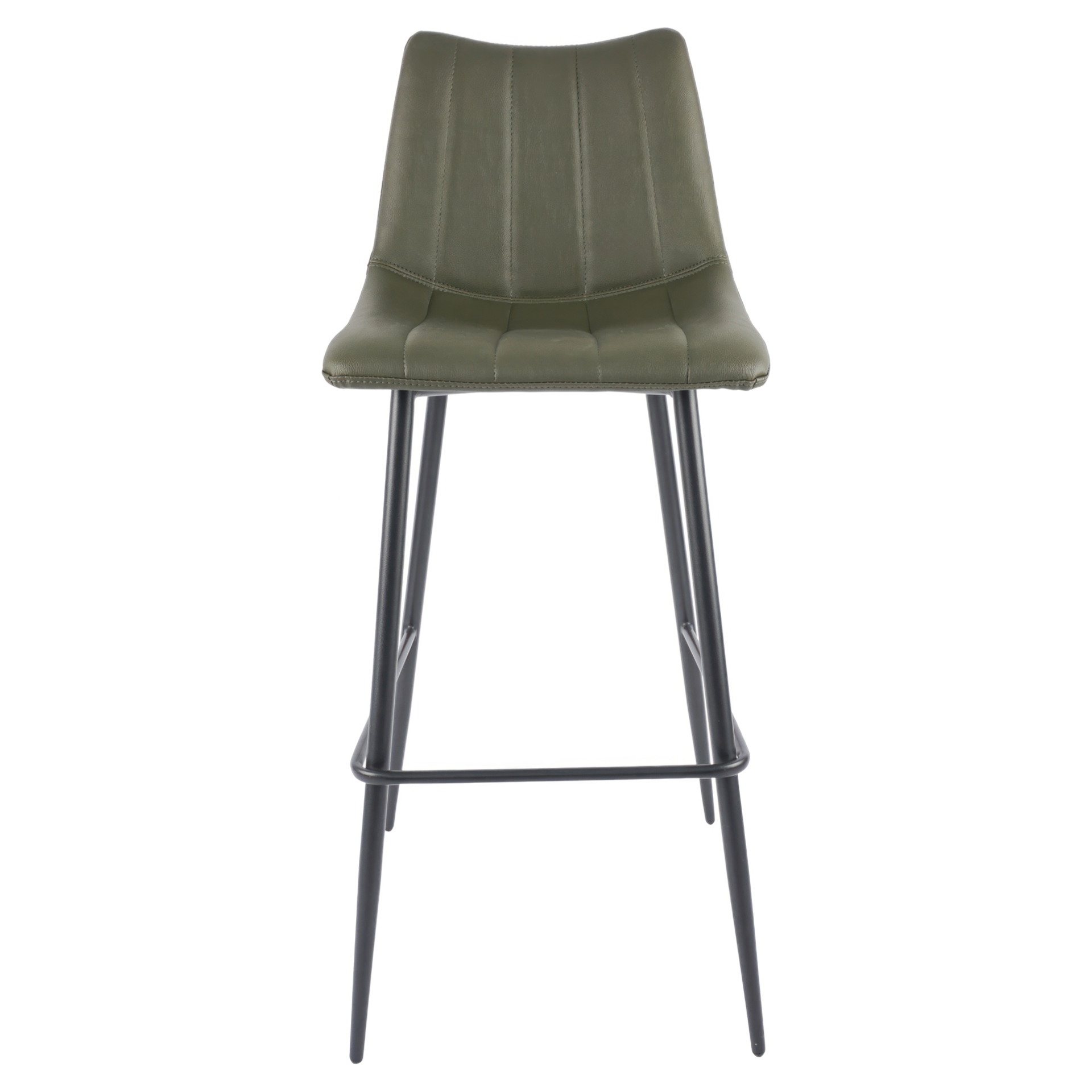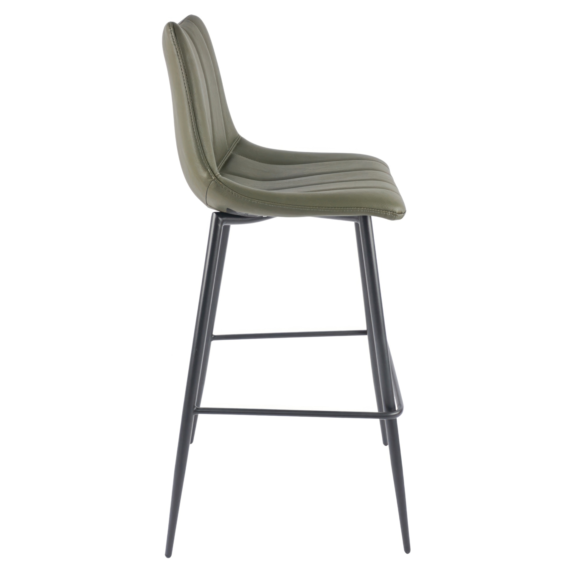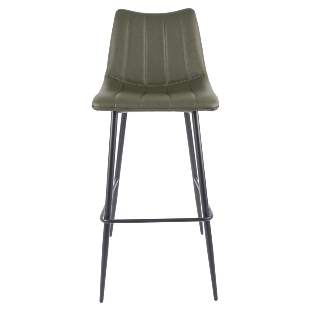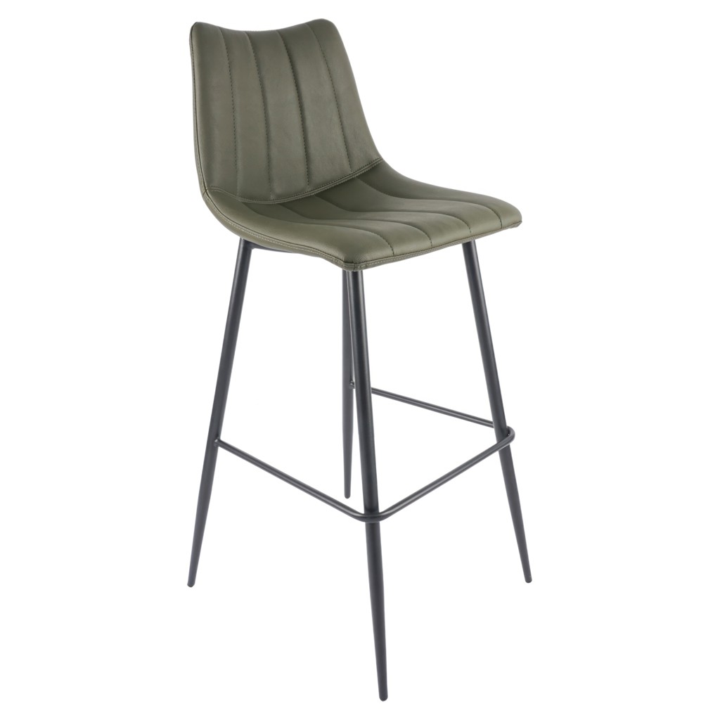 The Alibi bar stool features striking vertical line stitches that add subtle detail to its monochromatic design.