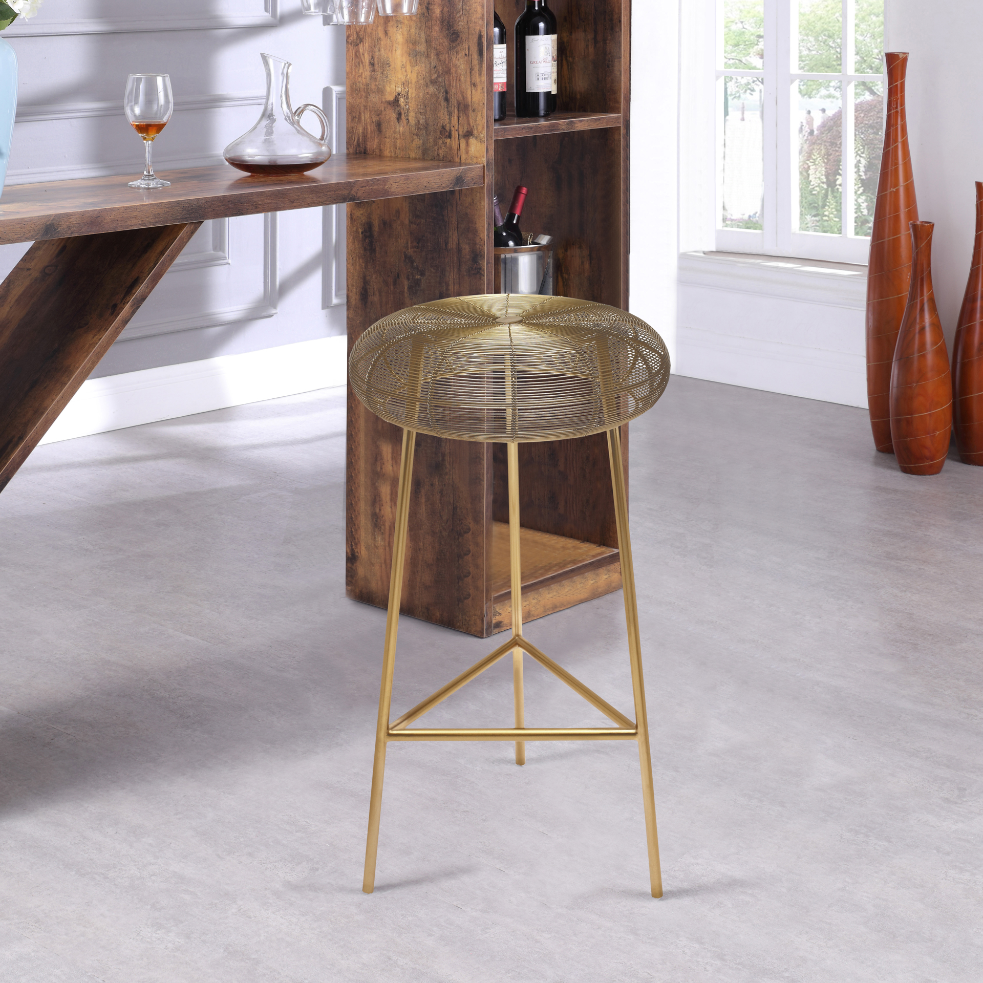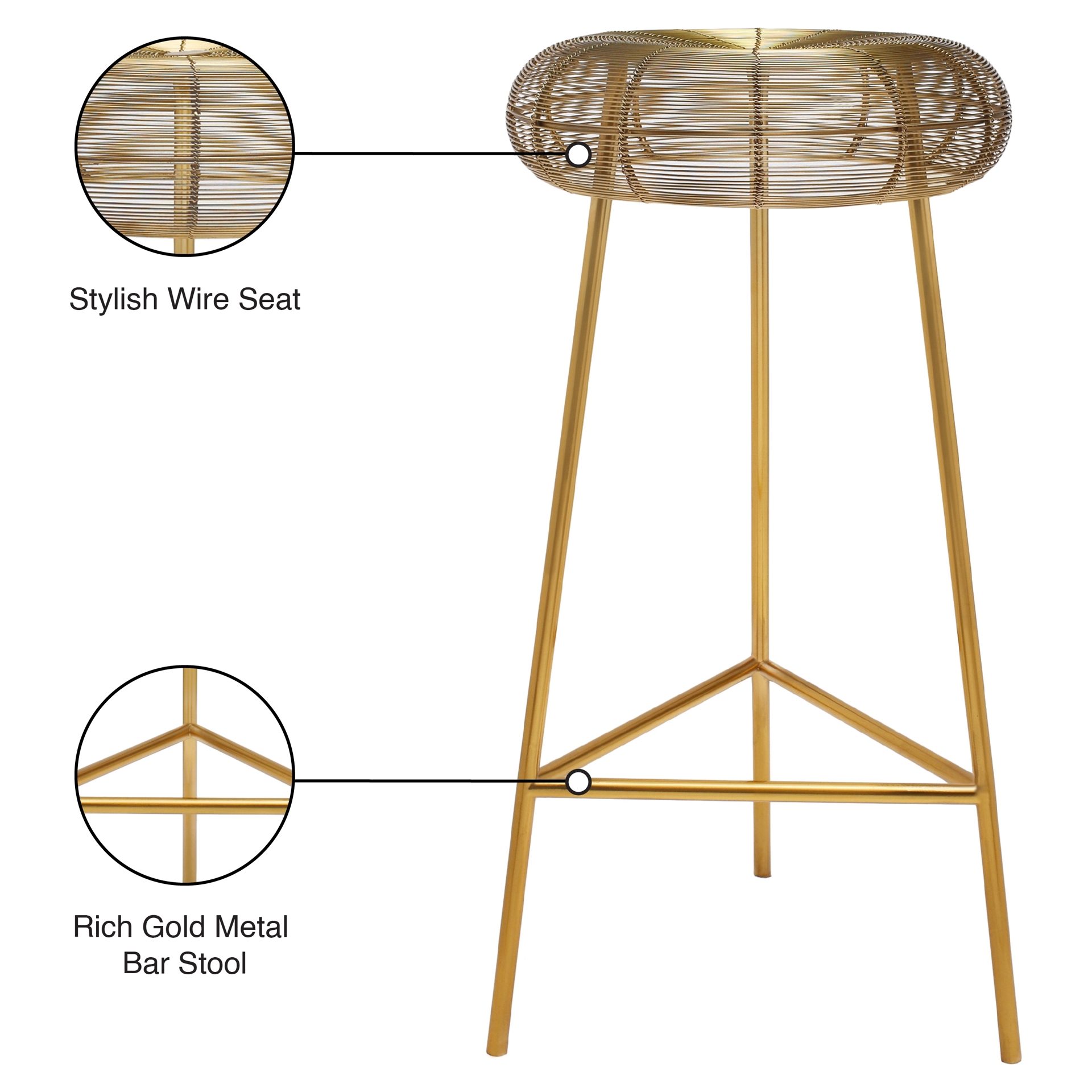 This elegant stool features a stylish wire seat to add instant visual interest to your seating.