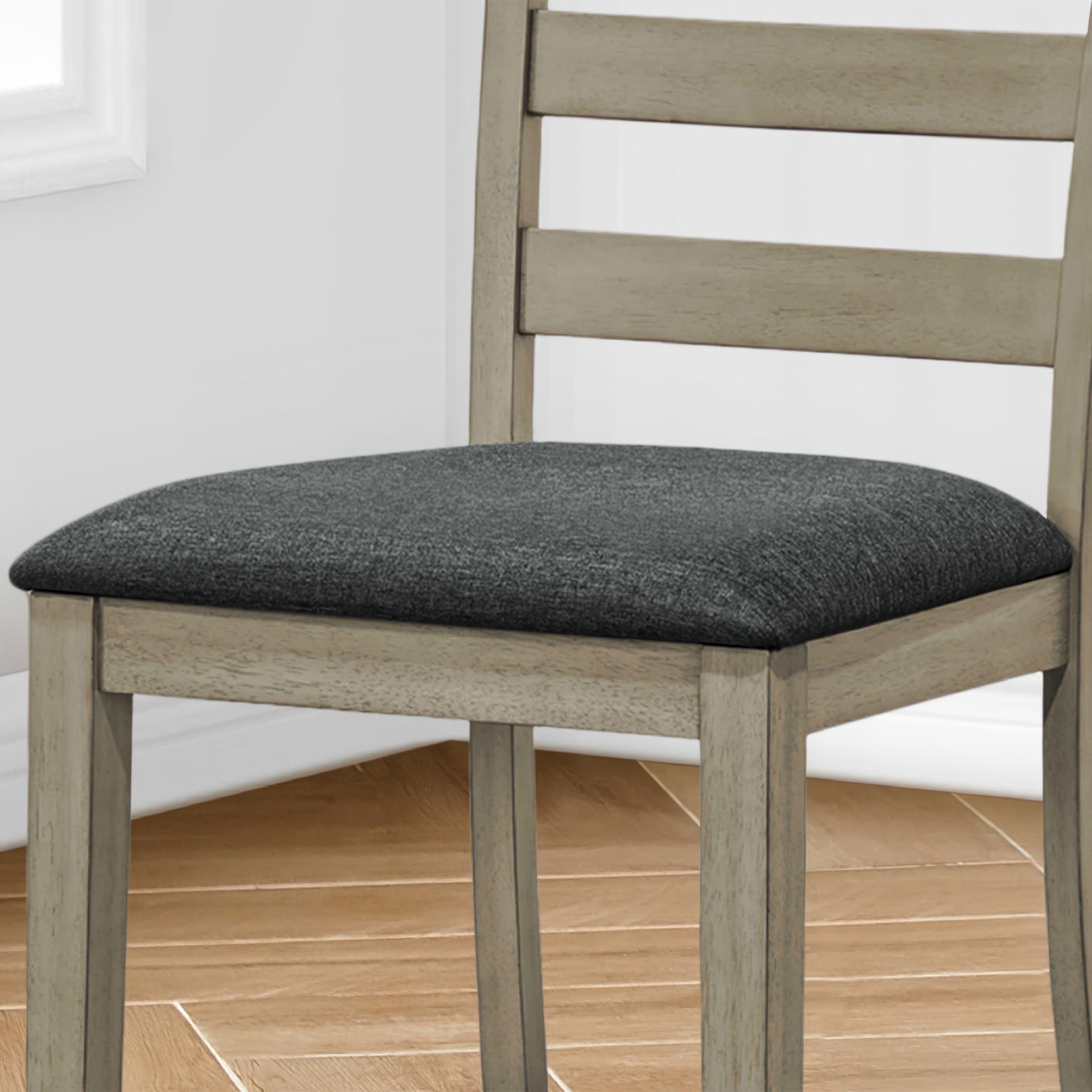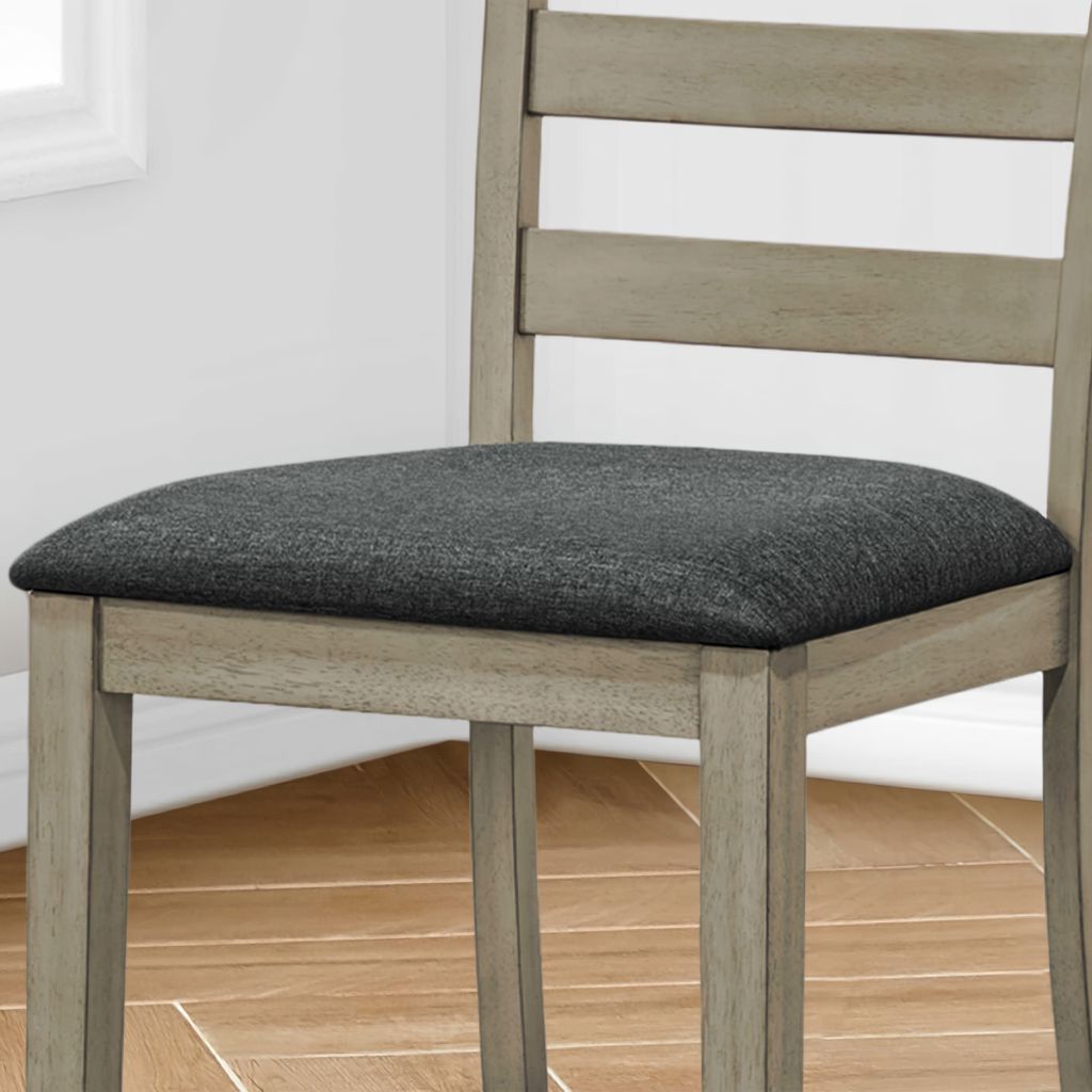 The ladder back design and solid wood legs provide sturdy construction that is both durable and supportive. With comfortable foam cushioning on the padded seats, these fashionable style chairs are upholstered in a rich black fabric and are easy to assemble.