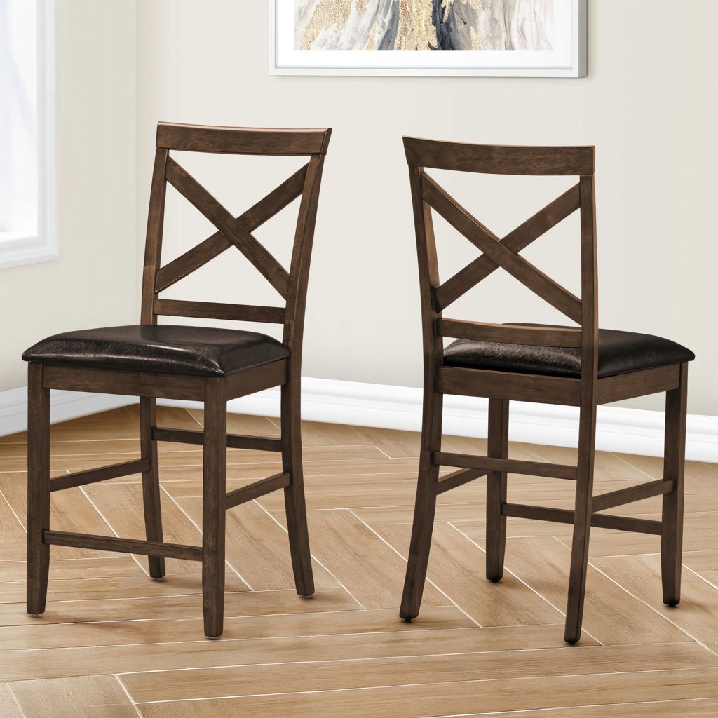 Transform your dining room or kitchen with these trendy 42"h dark walnut counter height dining chairs. This comfortable set of 2 fashionable style chairs features solid wood legs and a sturdy construction that is designed to last.
