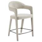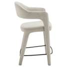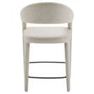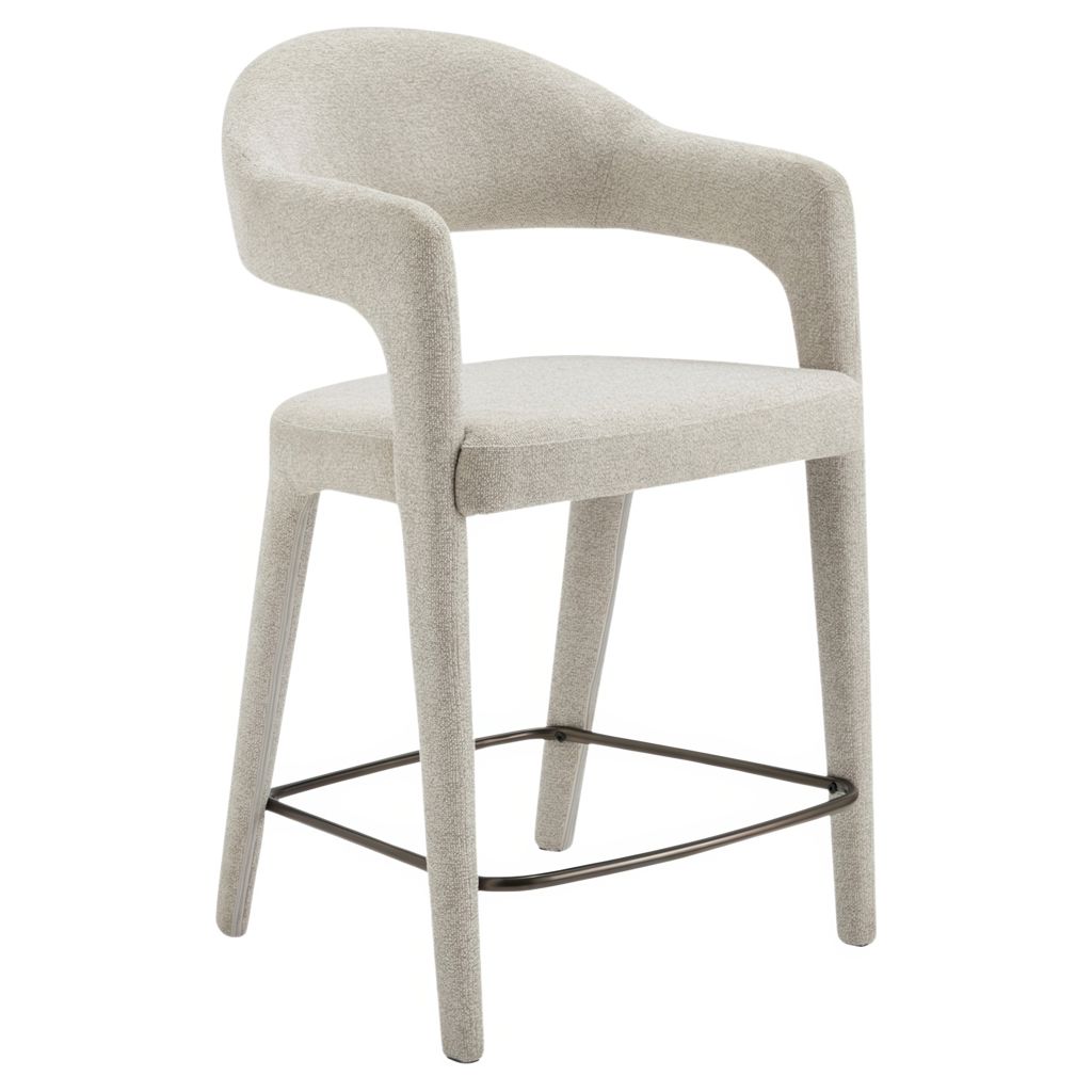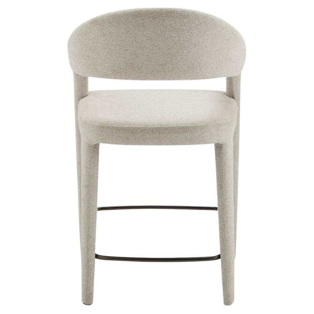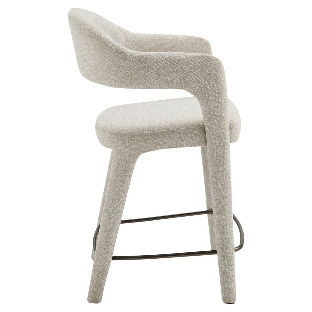 The Martens counter stool features an open barrel back and a continuous curve from leg to frame. Its fabric upholstery is complemented by generously padded seating, marrying comfort with a clean, uncluttered design.