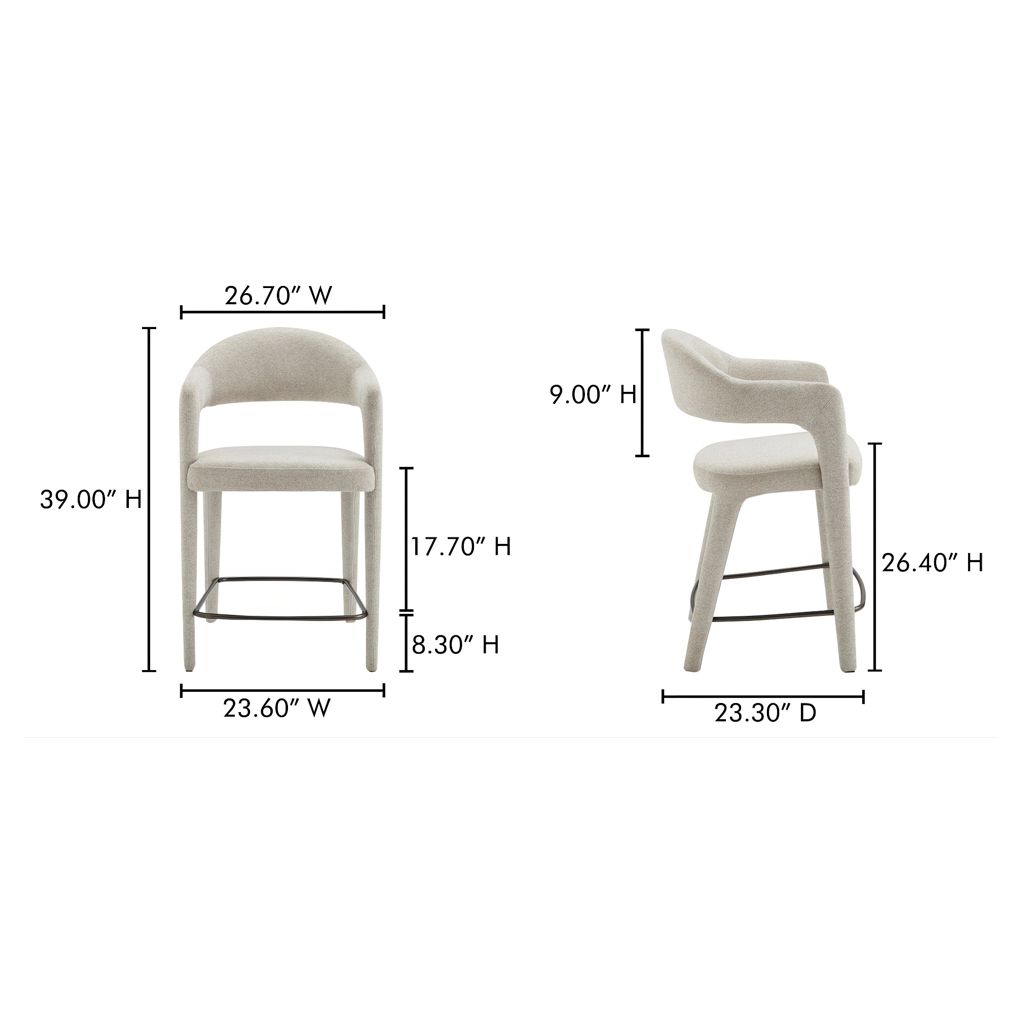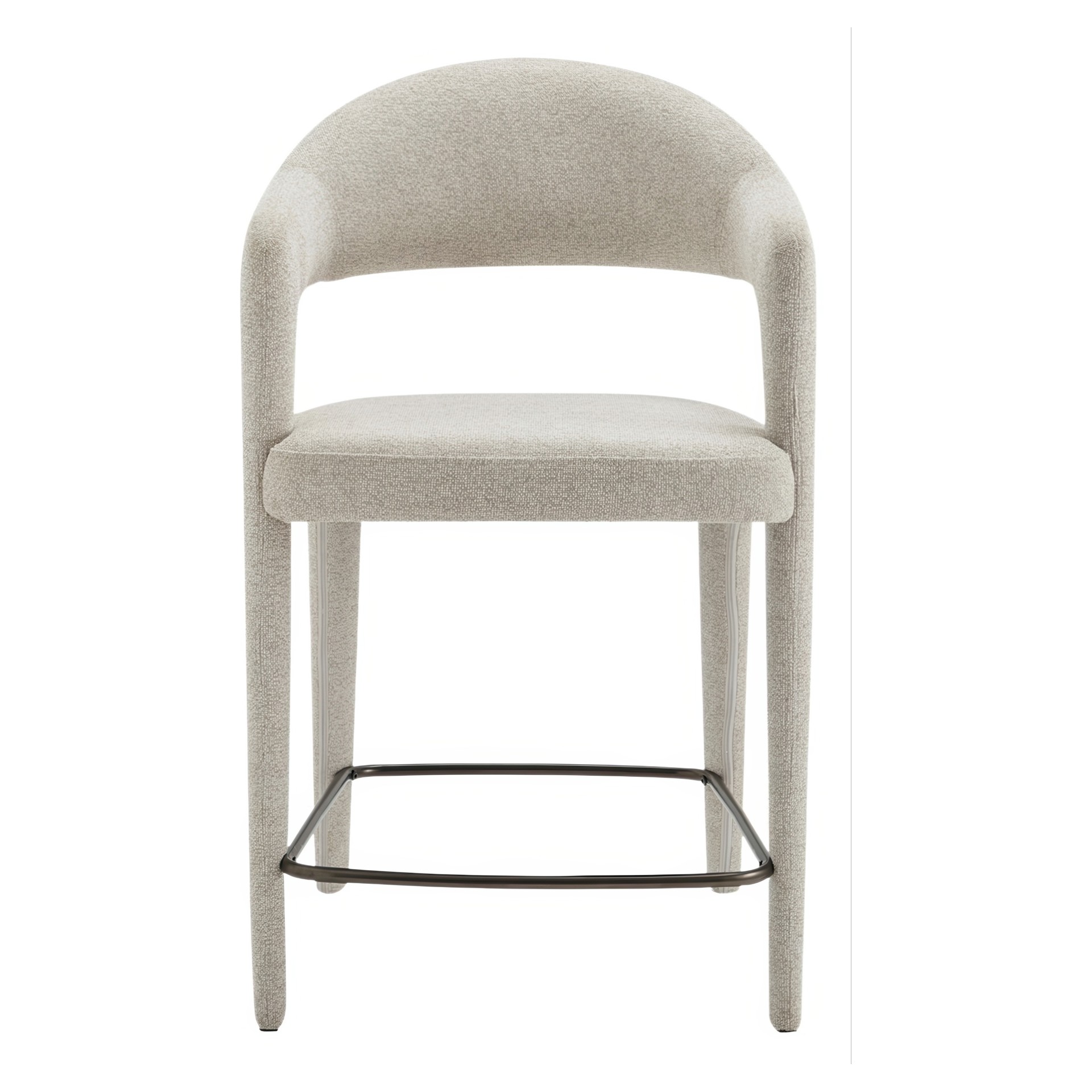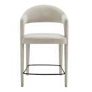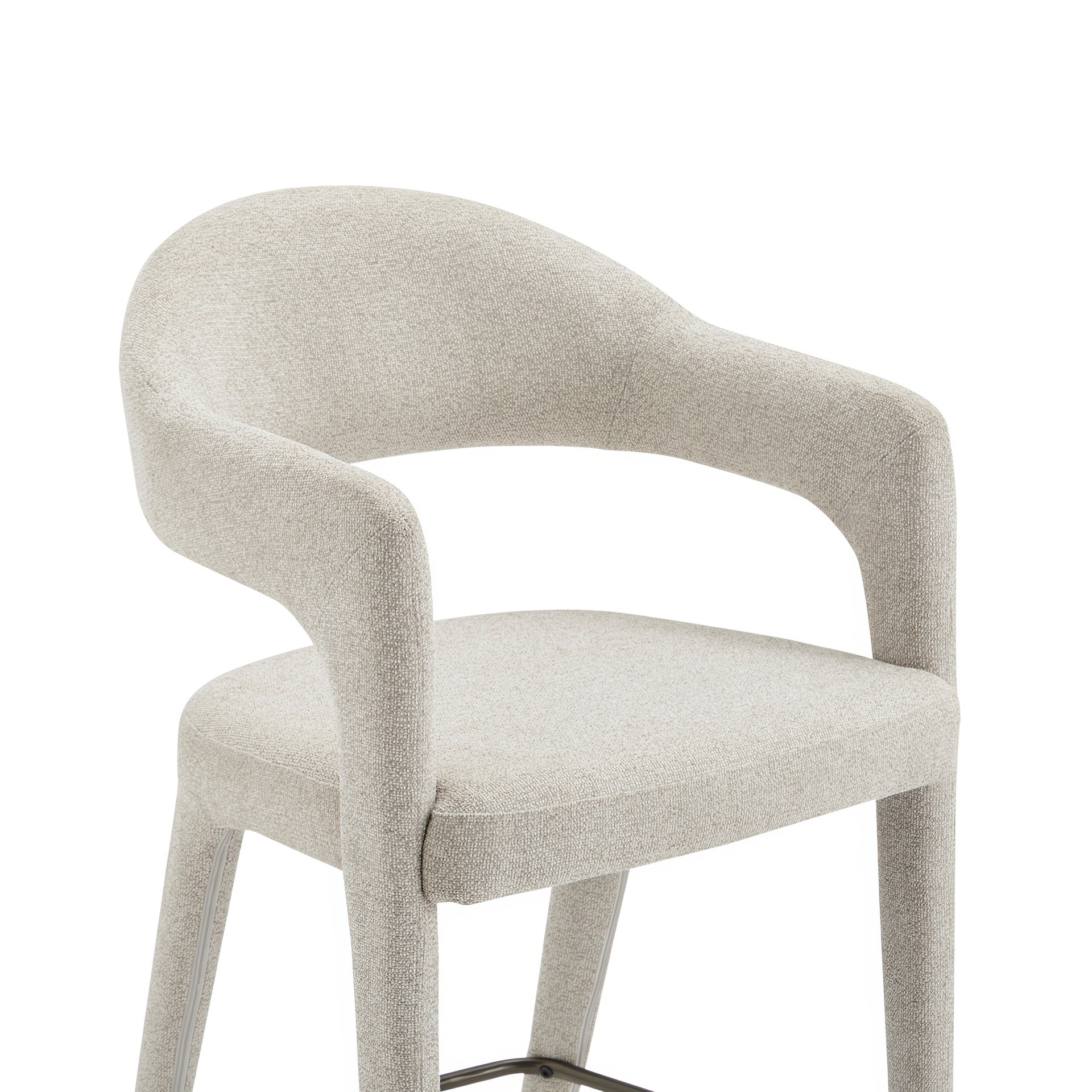 The Martens counter stool features an open barrel back and a continuous curve from leg to frame. Its fabric upholstery is complemented by generously padded seating, marrying comfort with a clean, uncluttered design.