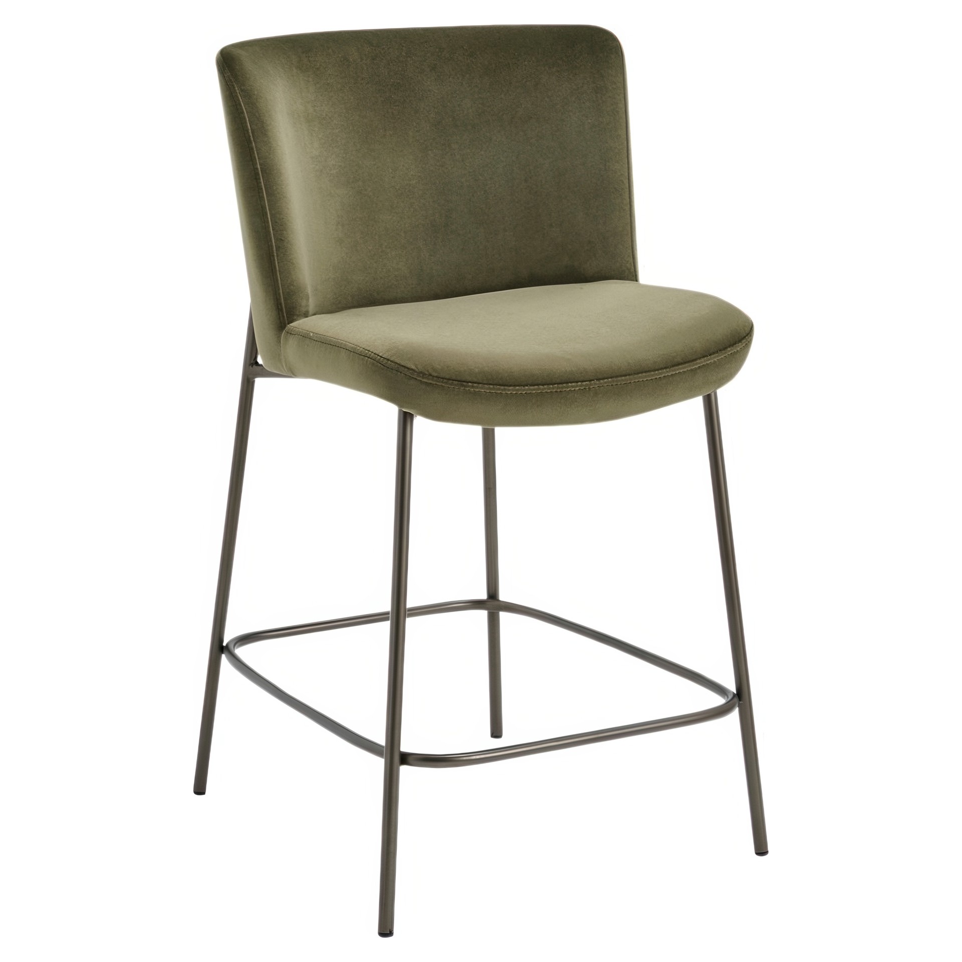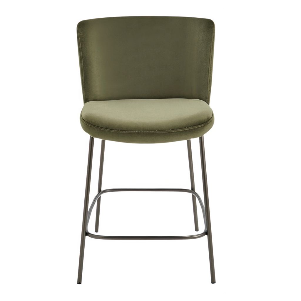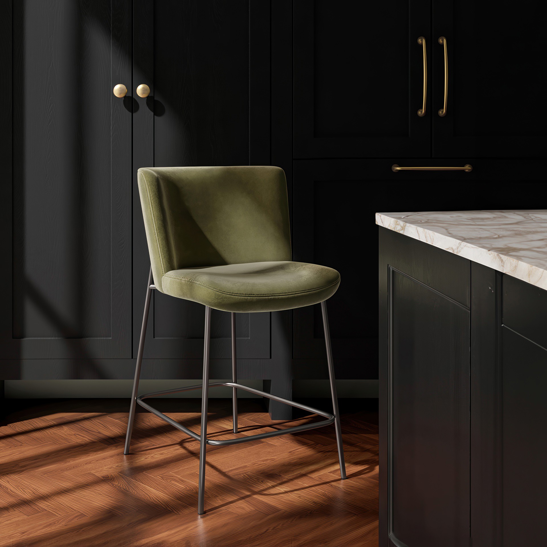 The Early counter stool is an elegant fusion of minimalist design and comfort that features a slim metal frame in a blackened bronze finish.