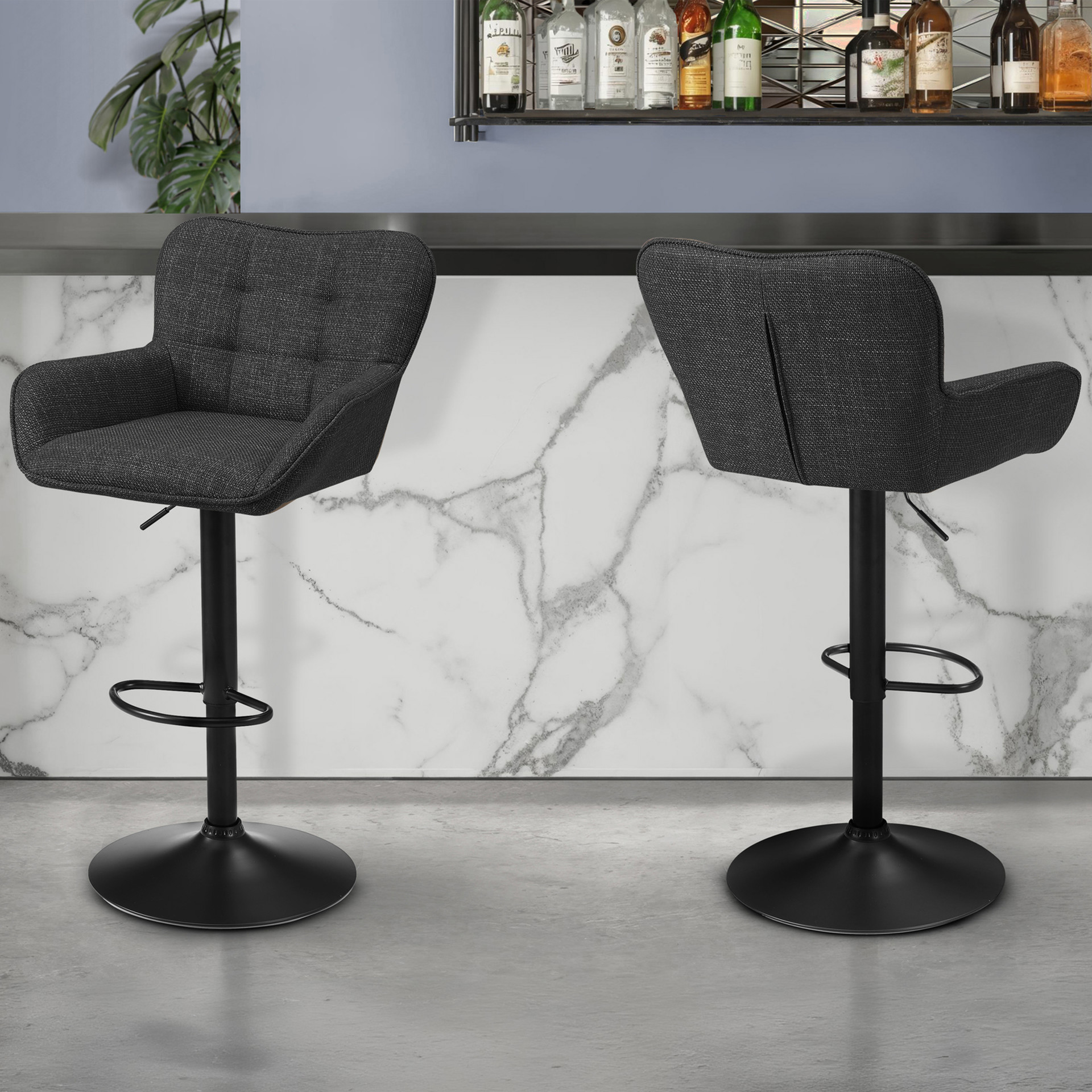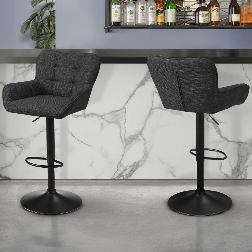 Transform your space with this set of two black fabric barstools, designed to bring a refined blend of comfort, functionality, and contemporary style to your kitchen, dining area, or home bar.