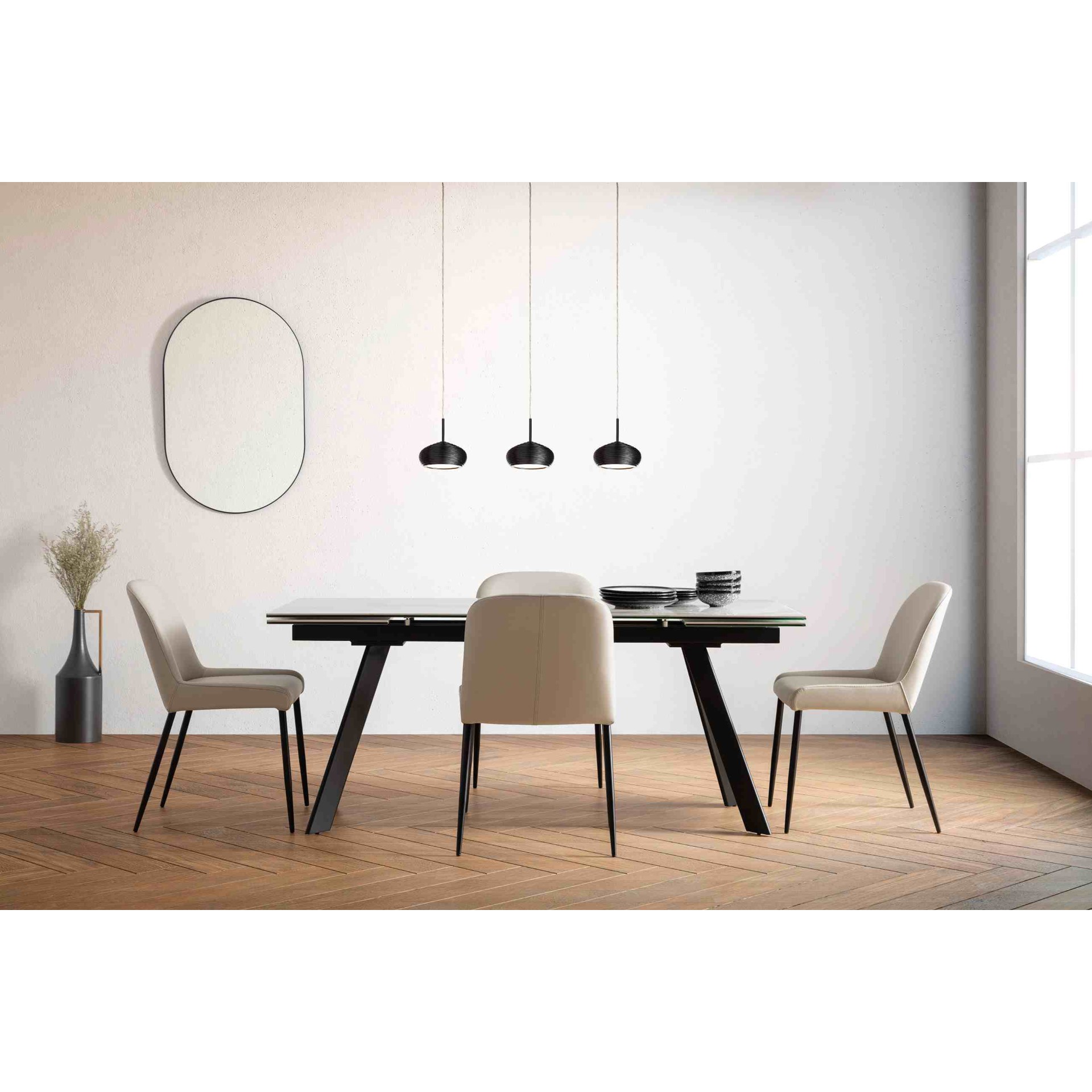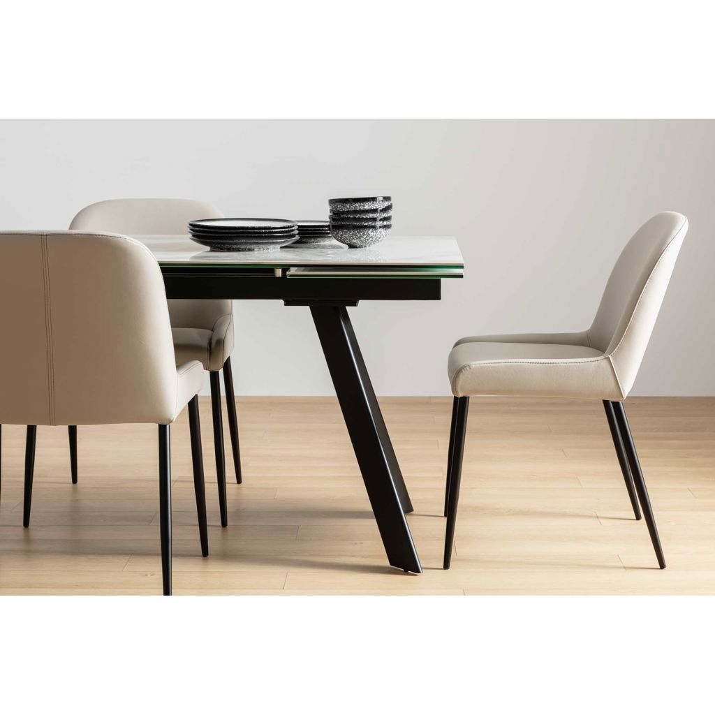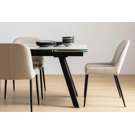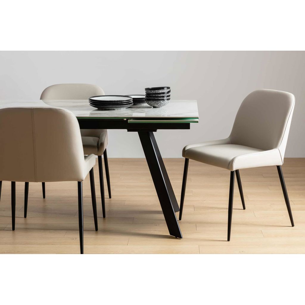 Discover the Julia chair, where comfort meets contemporary style. Its sophisticated beige genuine leather pairs beautifully with clean lines and slender black legs.