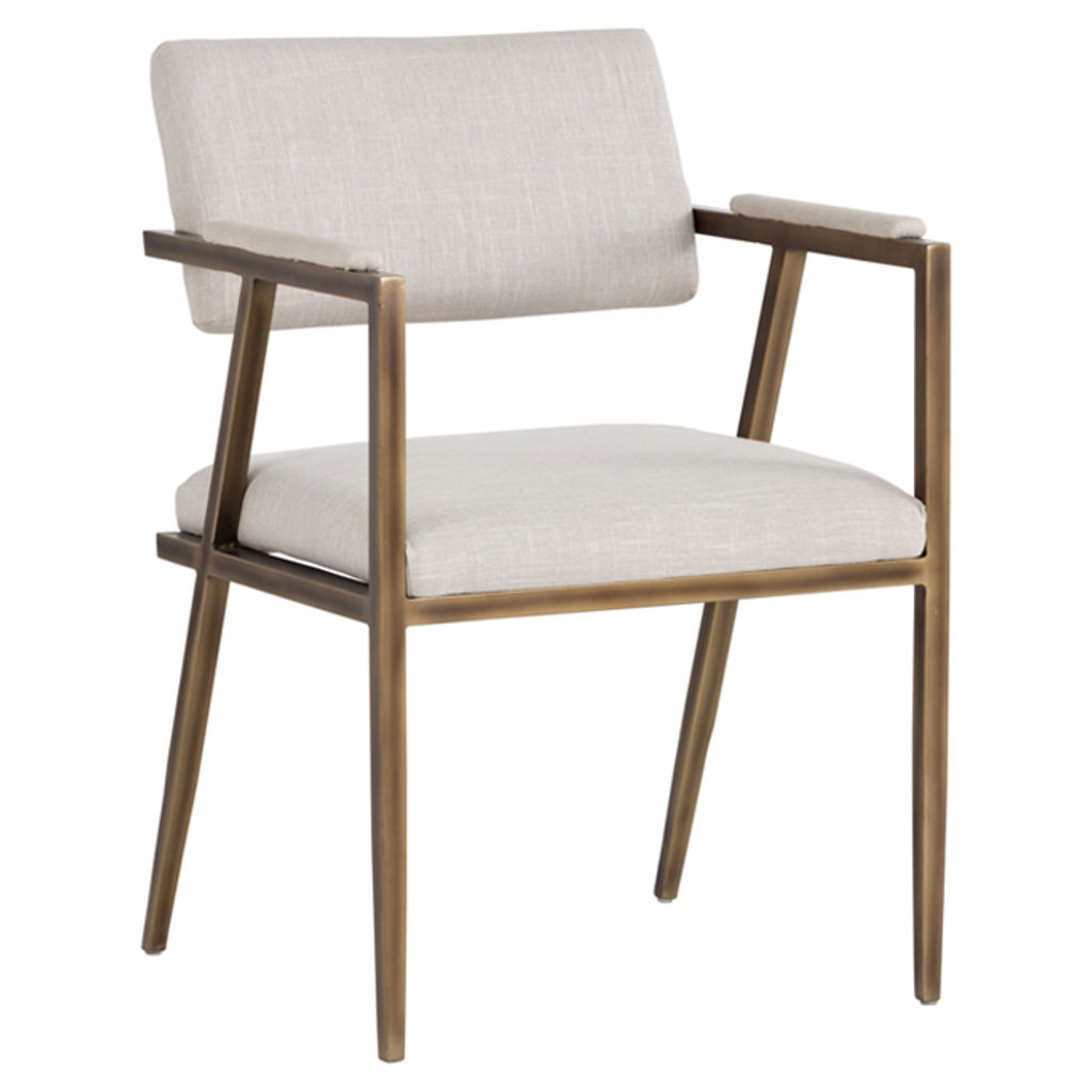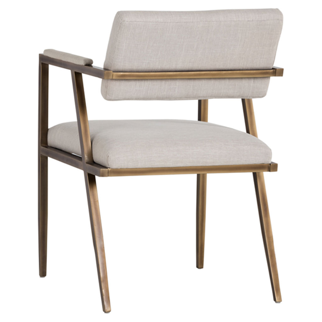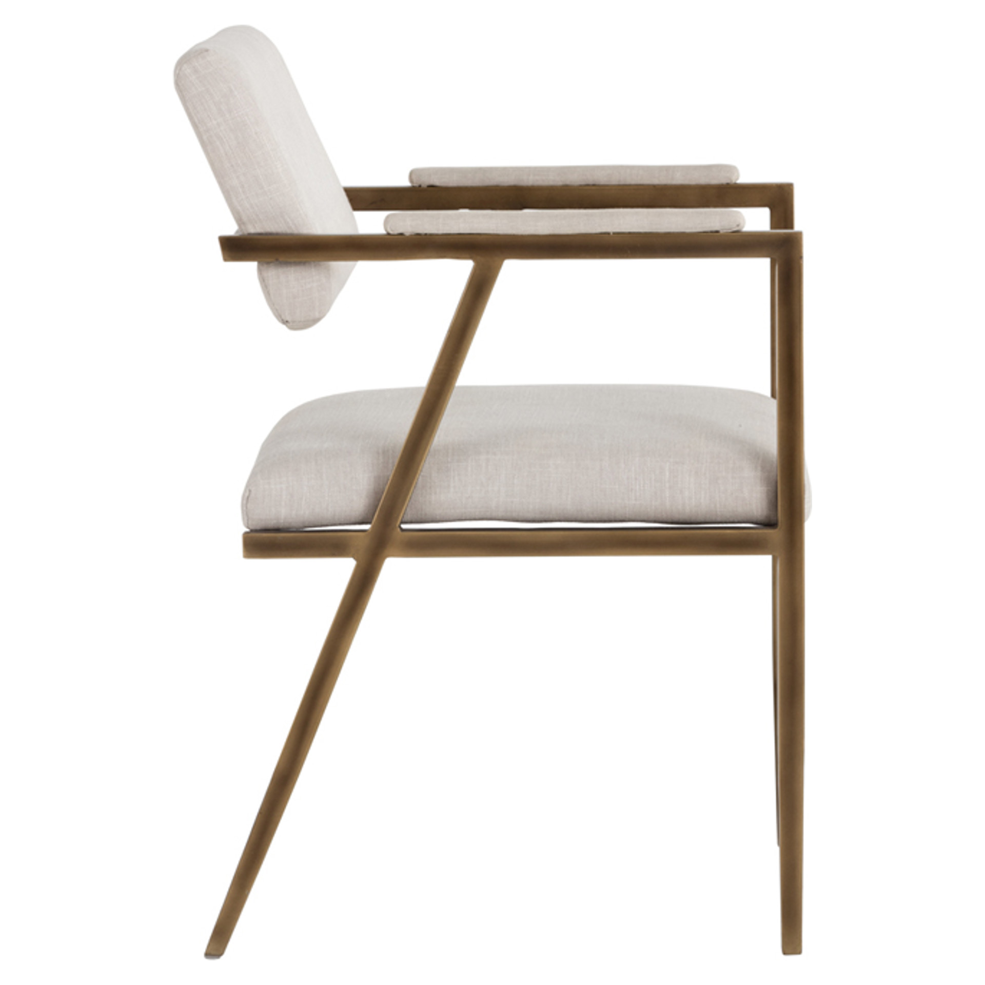 Industrial meets transitional elegance in this armchair from our Irongate collection. Reminiscent of mid-century modern styling with a rustic bronze steel frame and beige linen or vintage black faux leather on the seat and seat back. Can be used in both dining and living spaces.