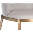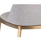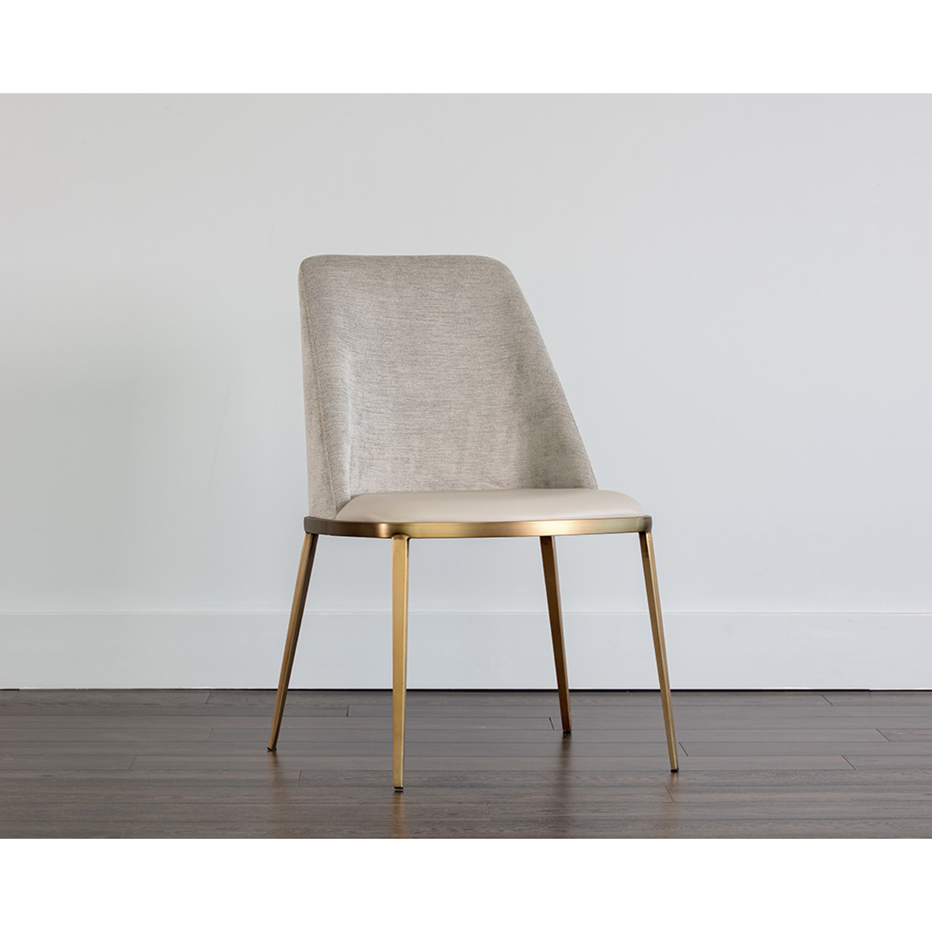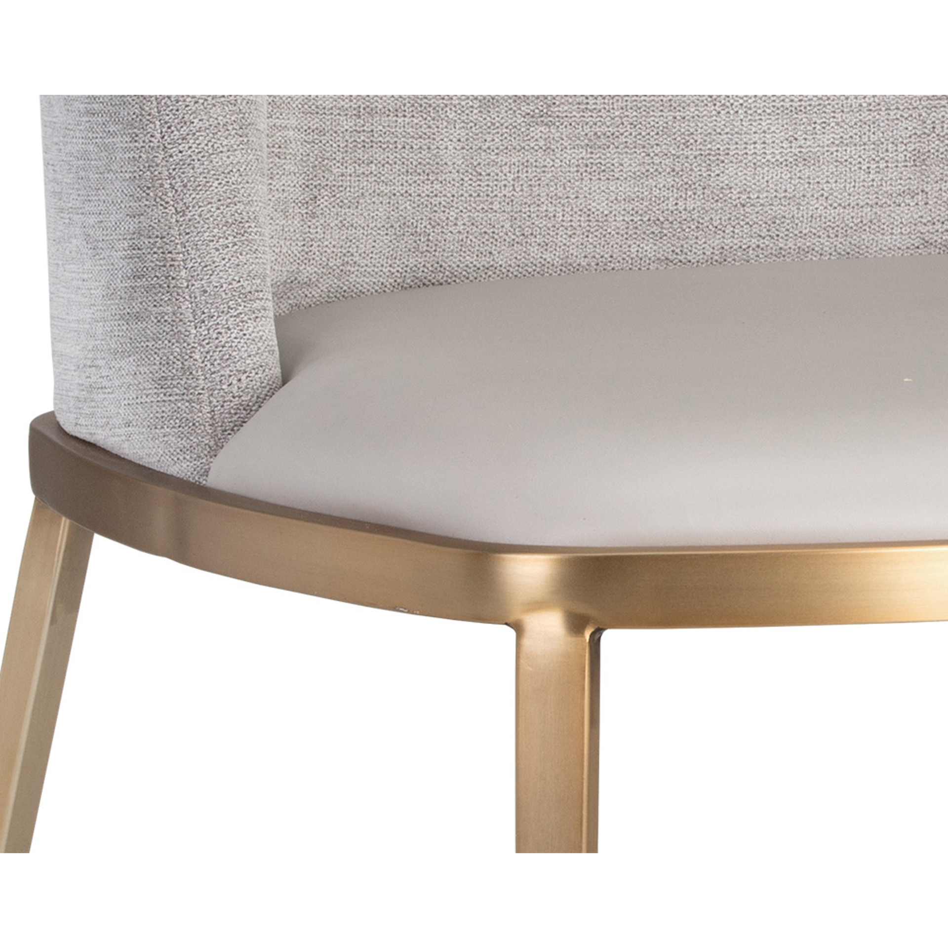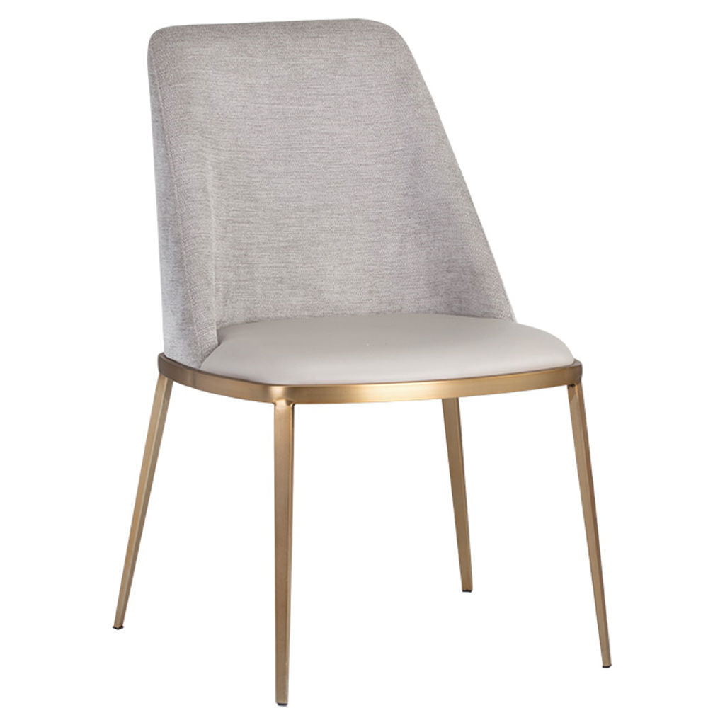 A combination of mixed materials creates a truly luxurious dining chair from our Ikon collection. The contemporary silhouette is finished with a napa stone faux leather seat, polo club stone performance fabric seatback and sleek brushed gold steel legs. Performance fabric is moisture repellant, stain resistant and easy to clean. An eye-catching piece from all angles.
