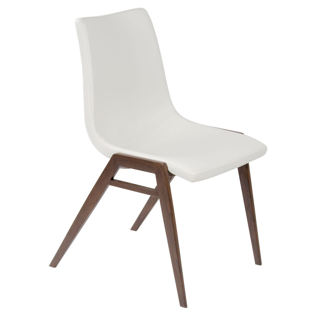 The Moon chair combines timeless elegance with modern comfort. Its pristine white synthetic leather seat pairs beautifully with the warm wood frame, creating a sophisticated contrast that complements any interior style.