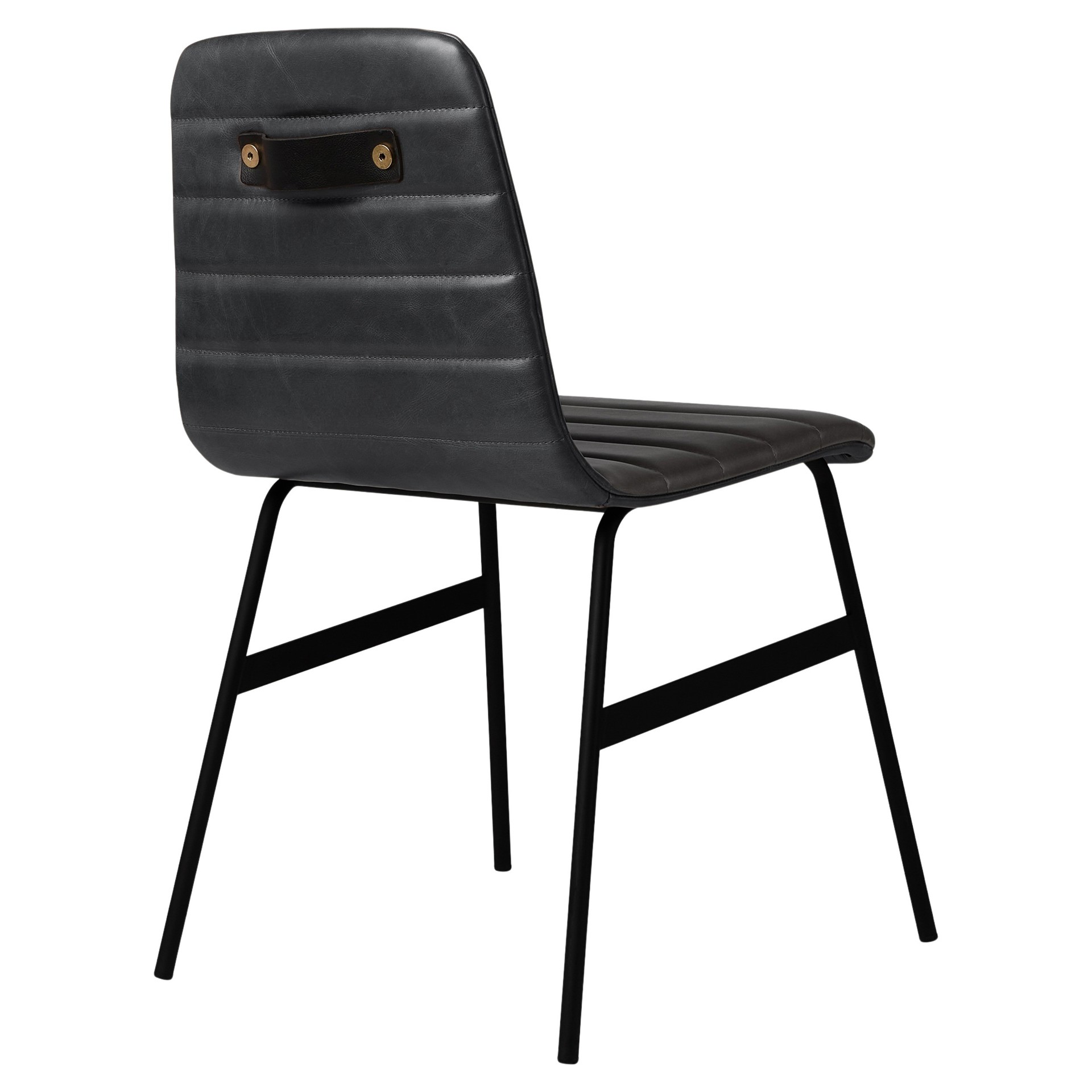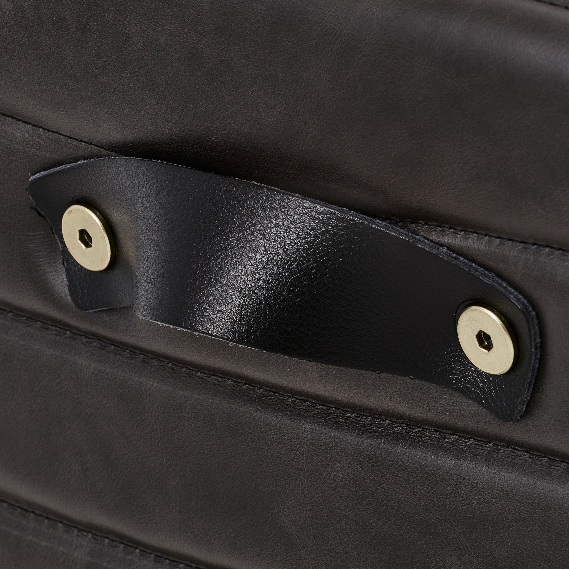 The back incorporates a functional handle in leather and brass. The black powder-coated steel legs are reinforced by solid metal stabilizers.