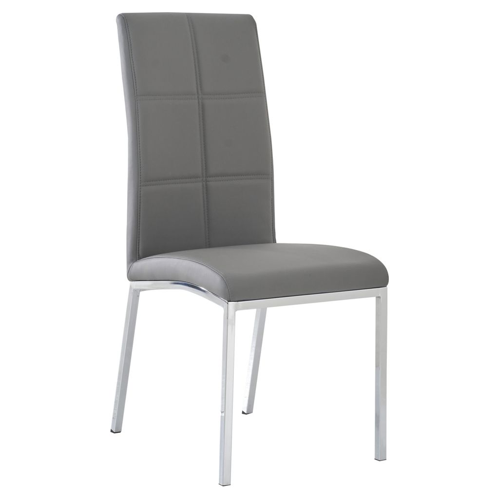 This dining chair combines contemporary elegance with everyday comfort. Its grey faux leather upholstery offers a refined look that’s easy to maintain, perfect for active families. The high backrest with geometric stitching adds a modern design element, while the chrome frame ensures strength and stability.