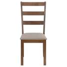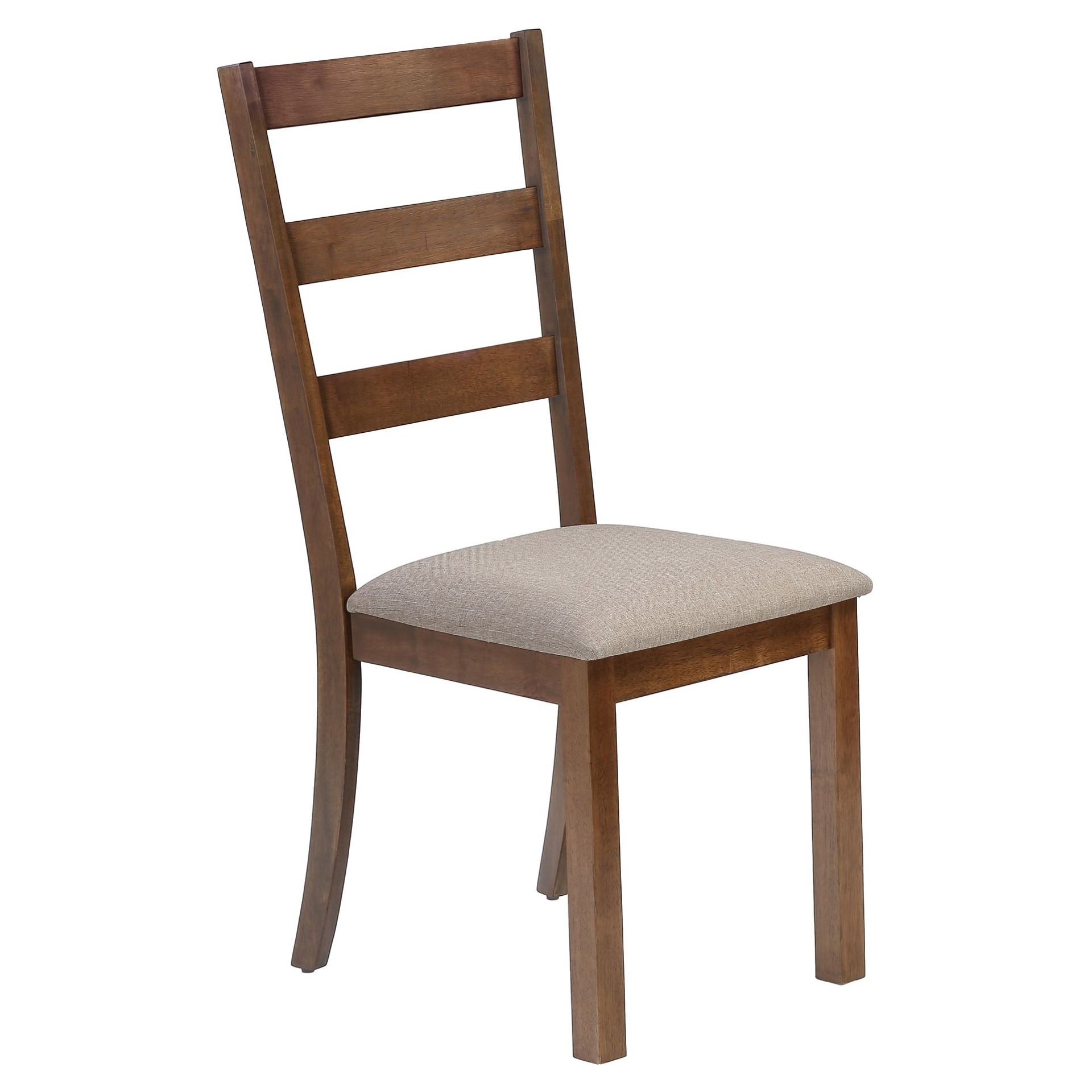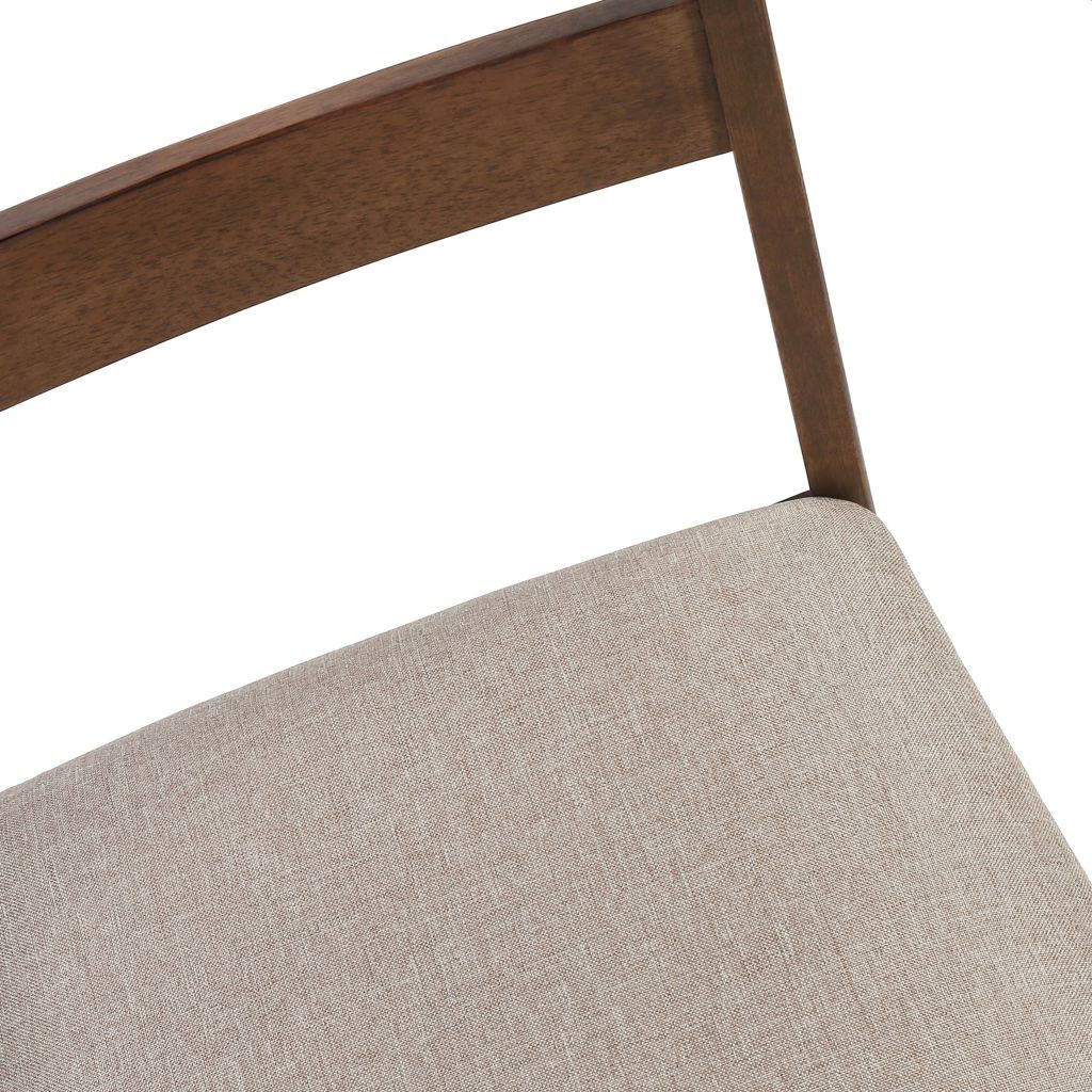 The seat is upholstered in a durable beige fabric with thick padding for maximum comfort and an open ladder back for added style.