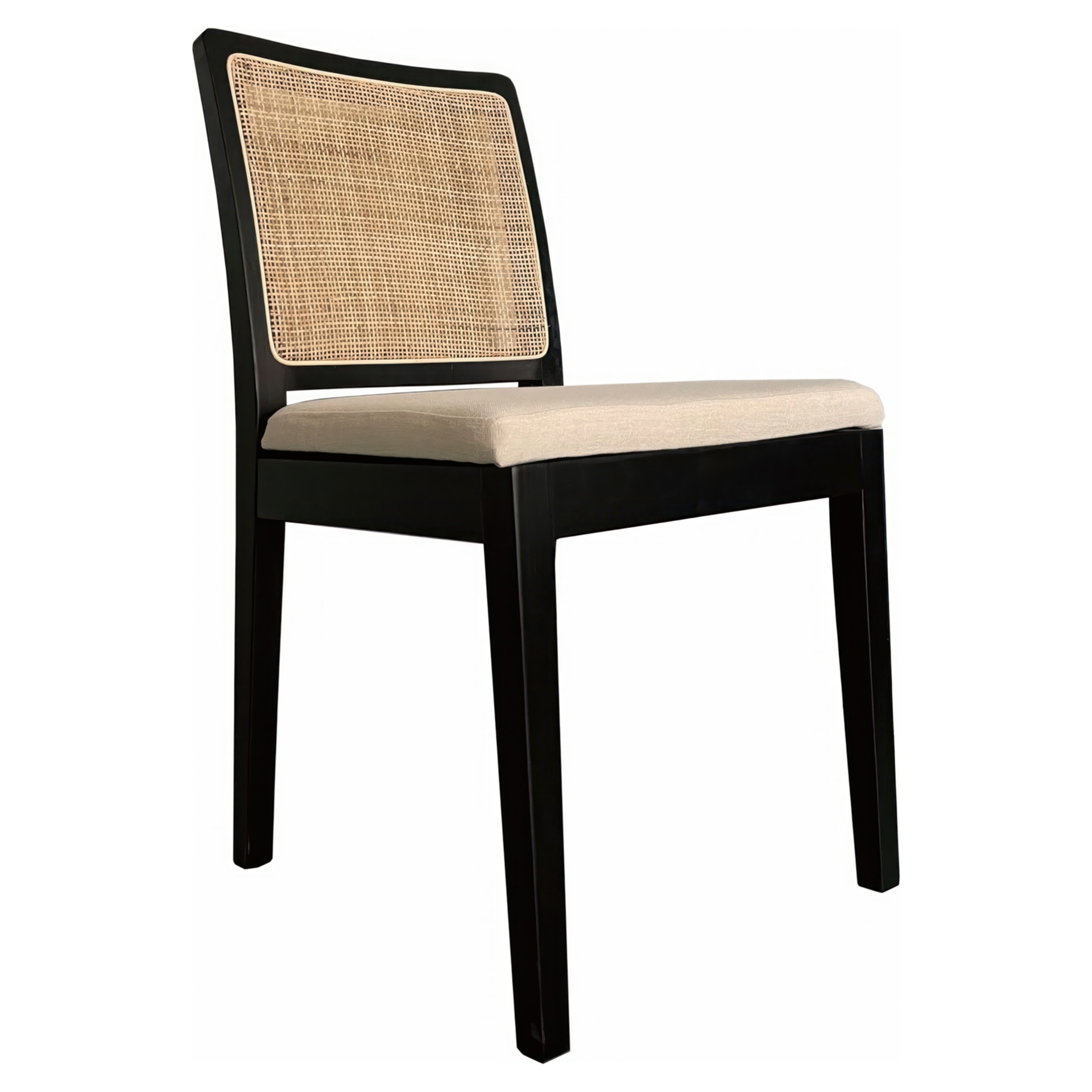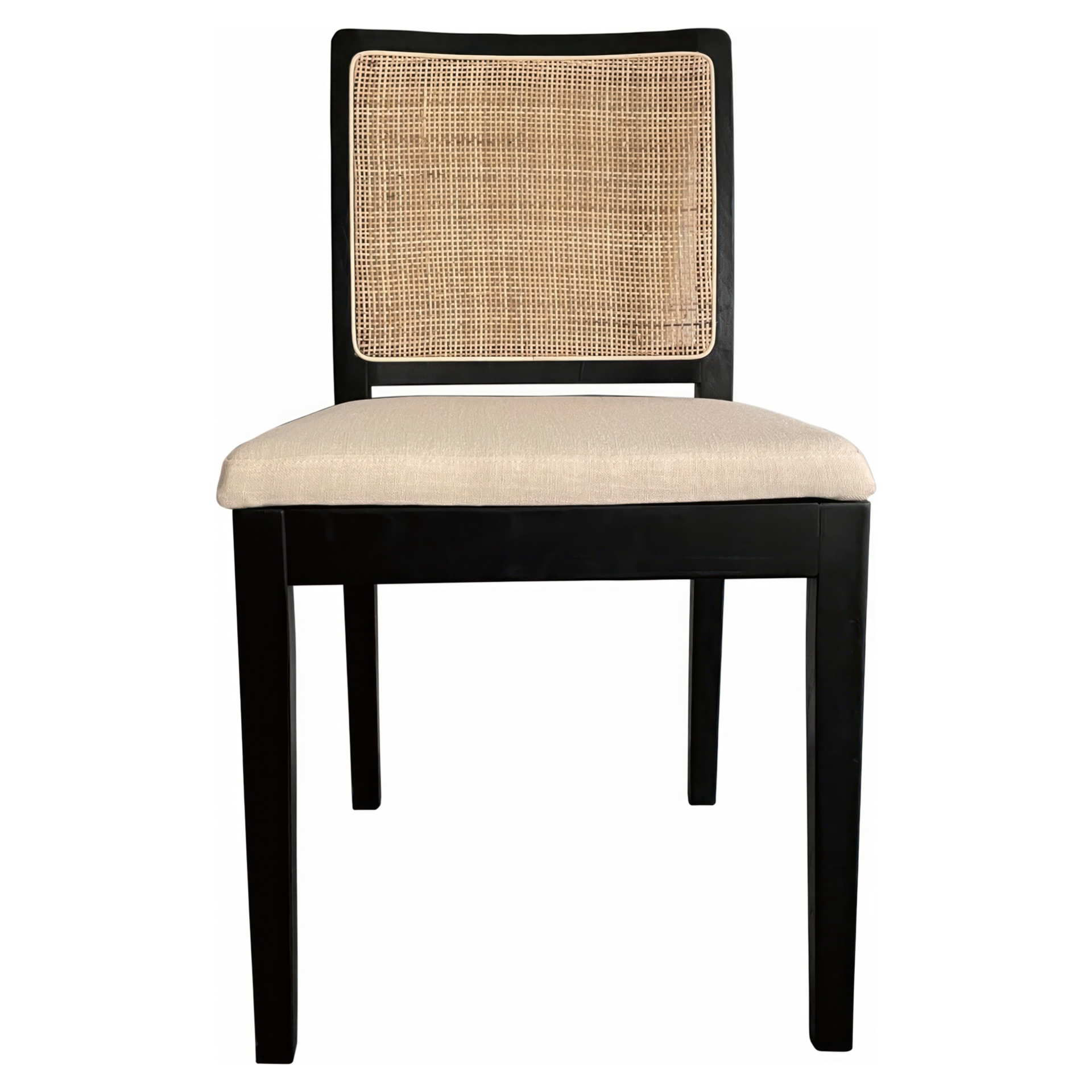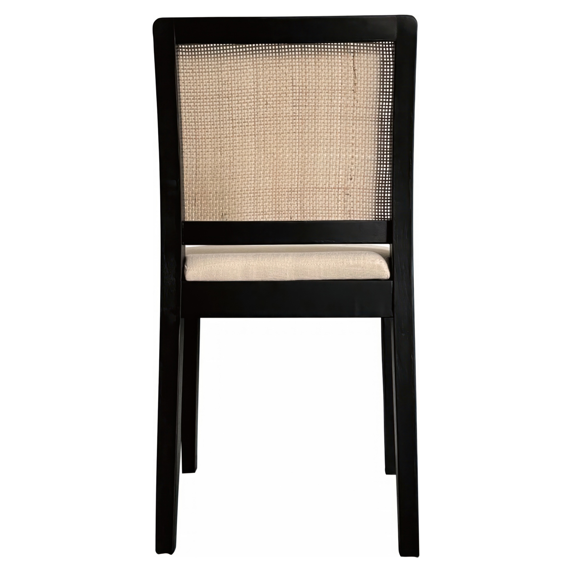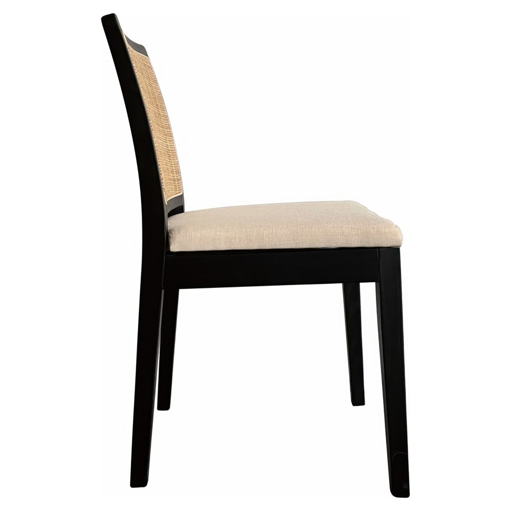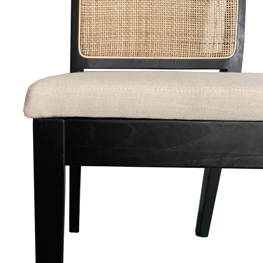 Bring simplicity and balance with Orville's softened contemporary aesthetic and airy mix of black-finished solid elm, natural rattan and brighter, cushioned upholstery.