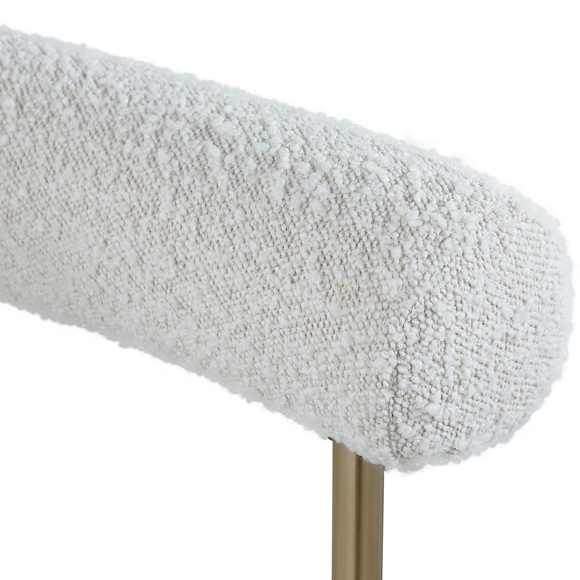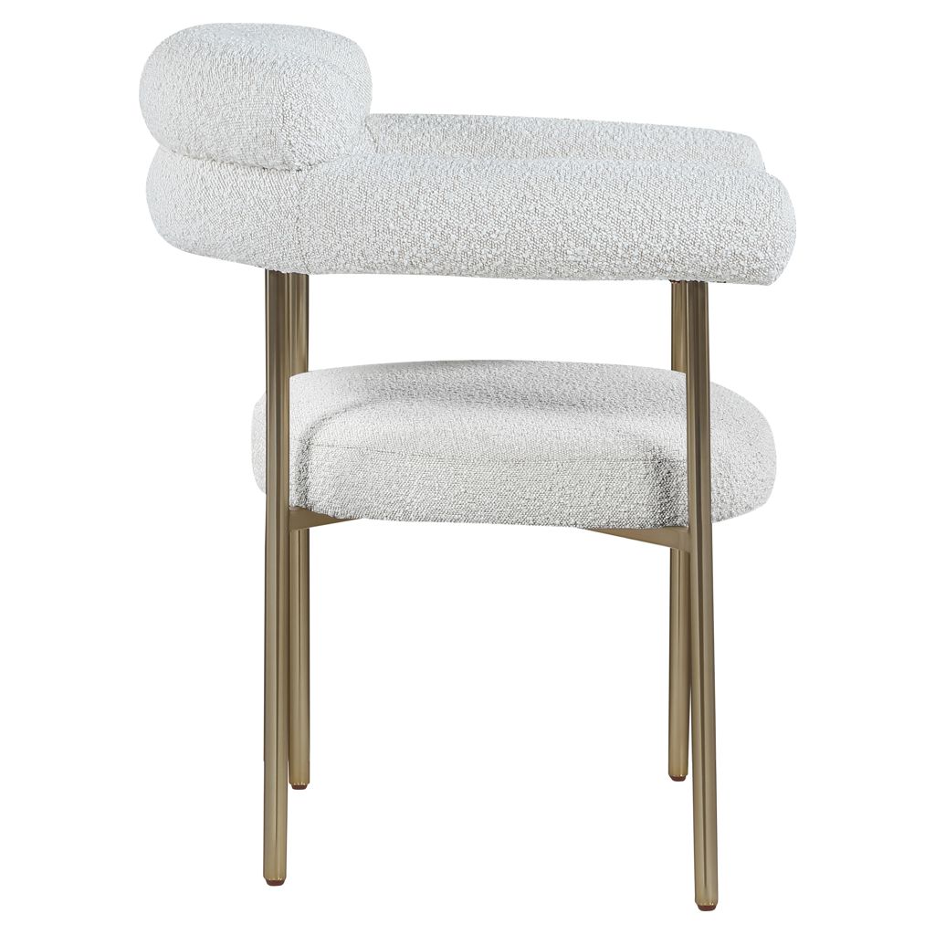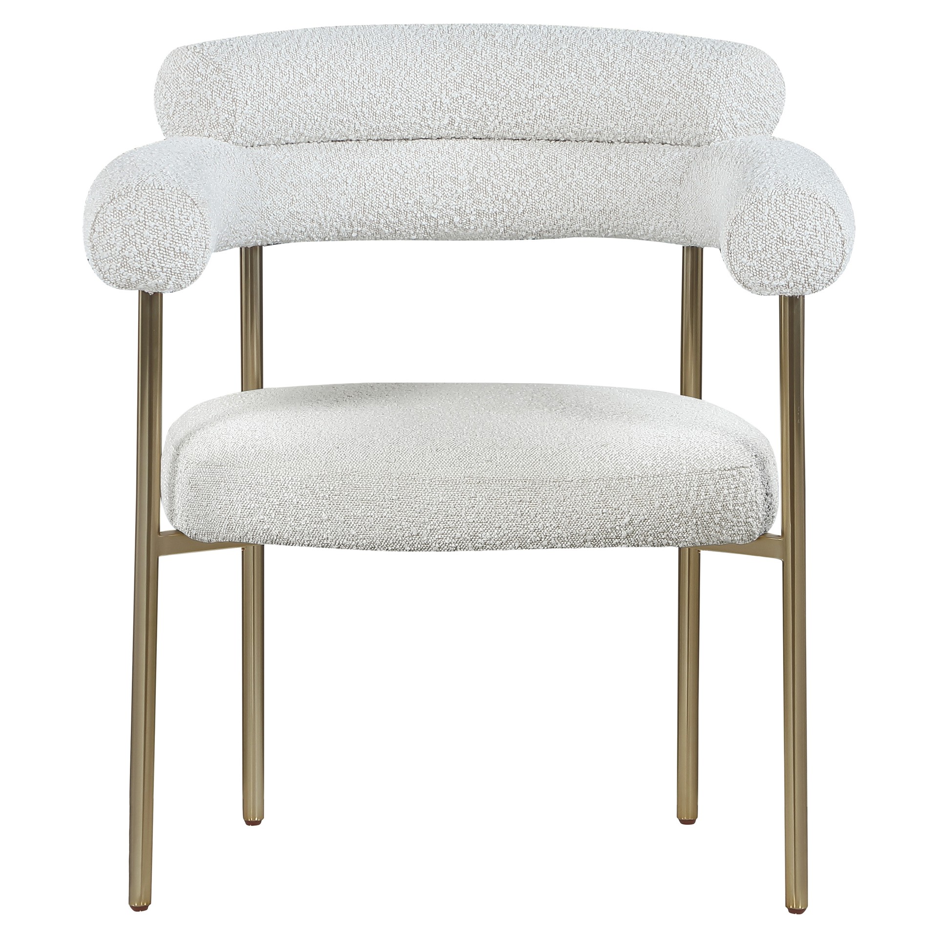 A thickly padded soft cream boucle fabric seat lends this chair a sleek, upscale look while ensuring its ongoing performance and beauty.