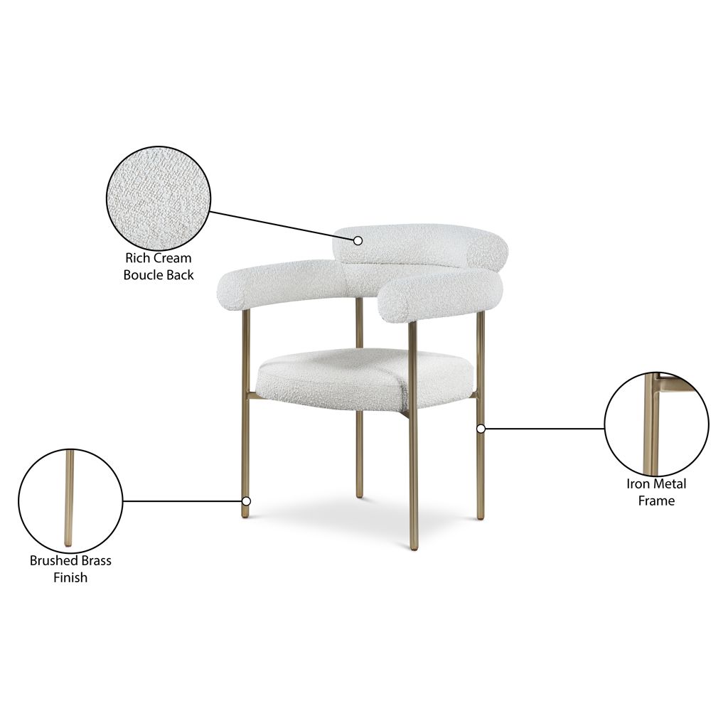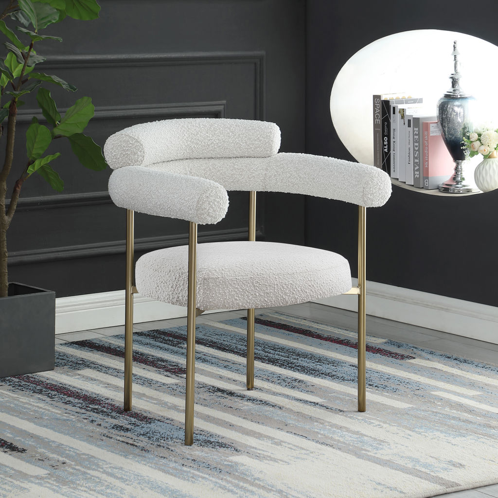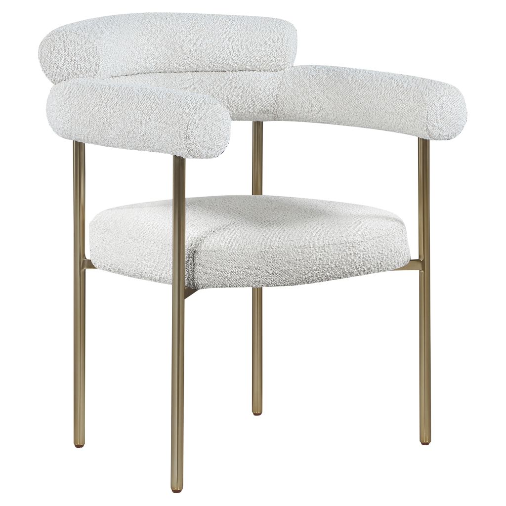 A thickly padded soft cream boucle fabric seat lends this chair a sleek, upscale look while ensuring its ongoing performance and beauty.