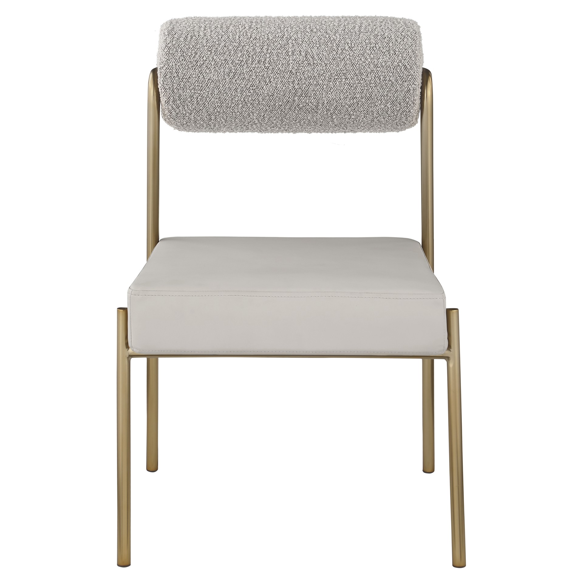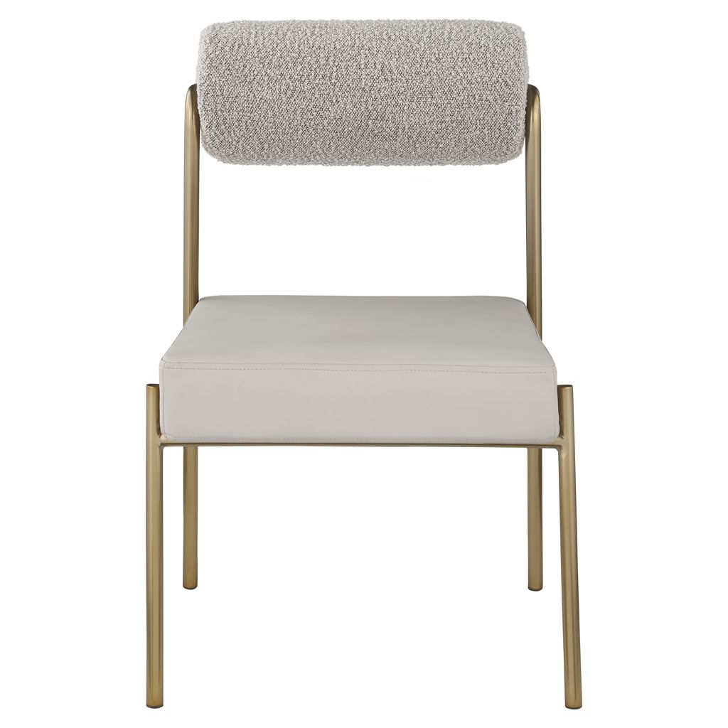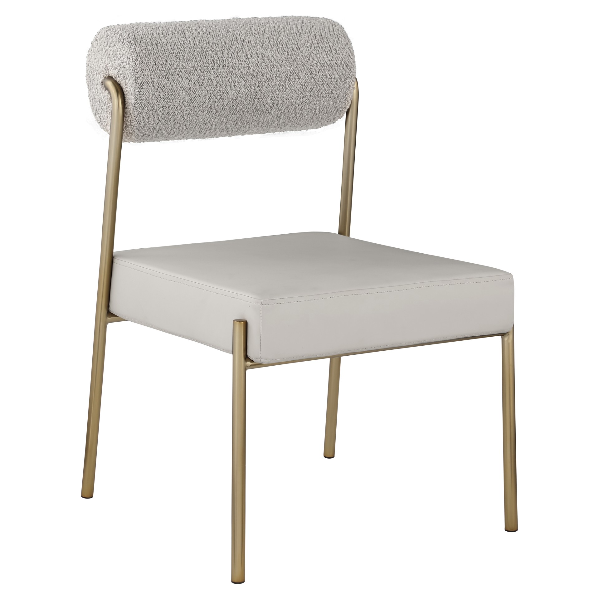 Transform your dining area with this Carly taupe faux leather seat/boucle fabric back dining chair.
