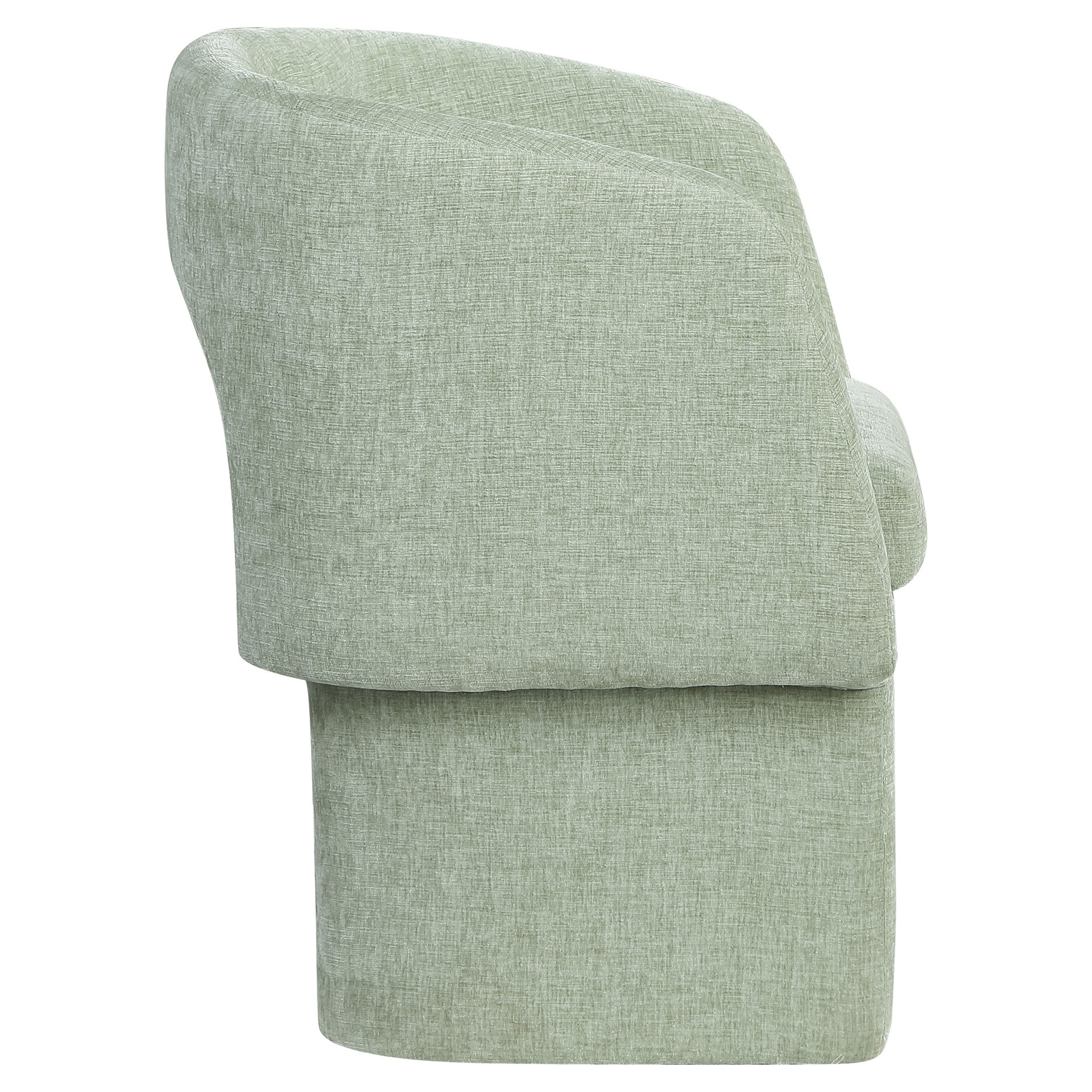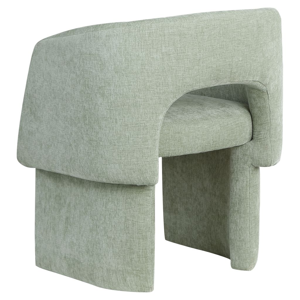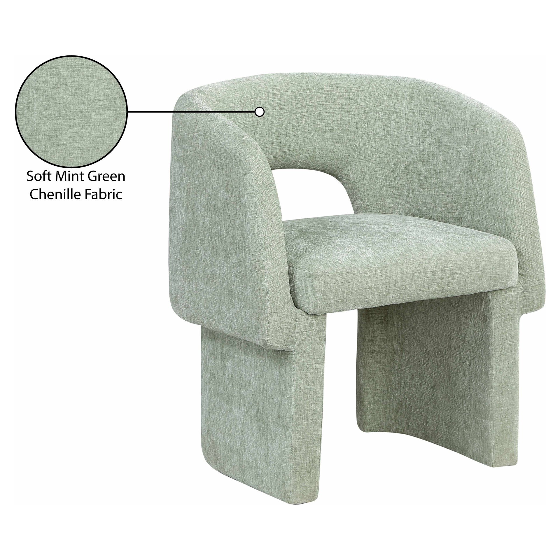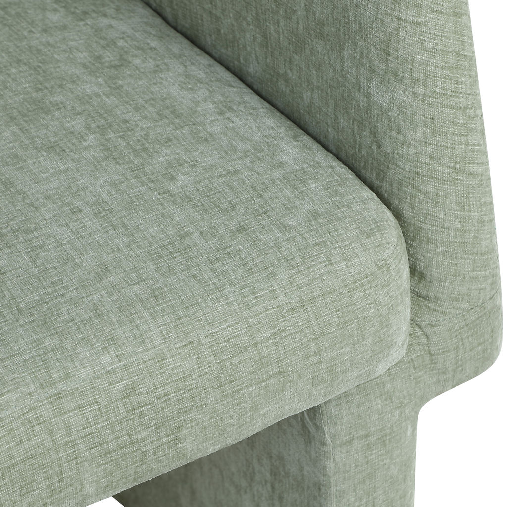 Rich mint chenille fabric upholstery covers this chair from top to bottom, giving it a luxe feel that's soft to the touch and to the skin.