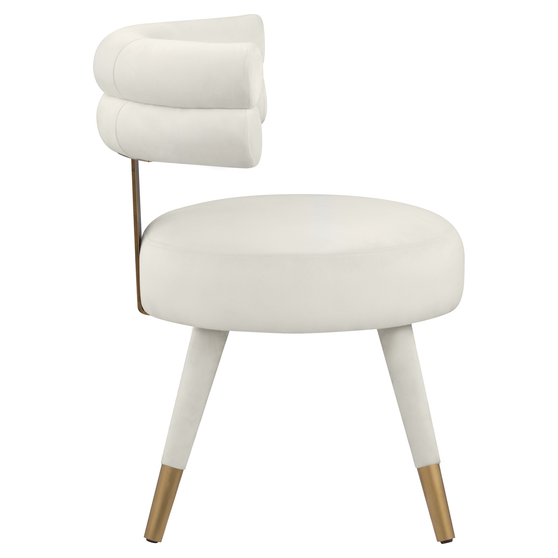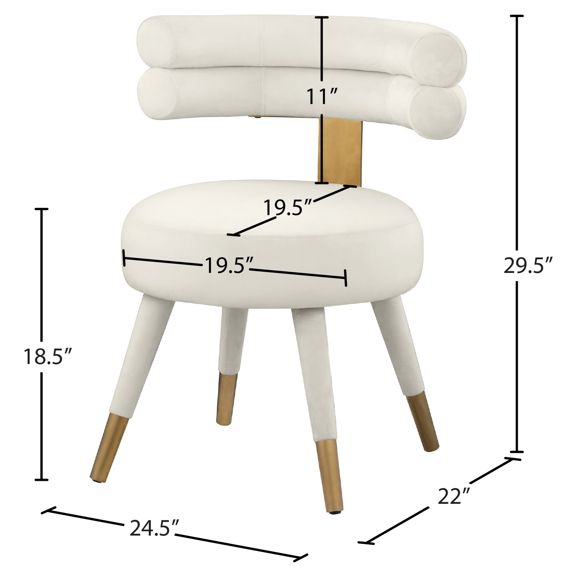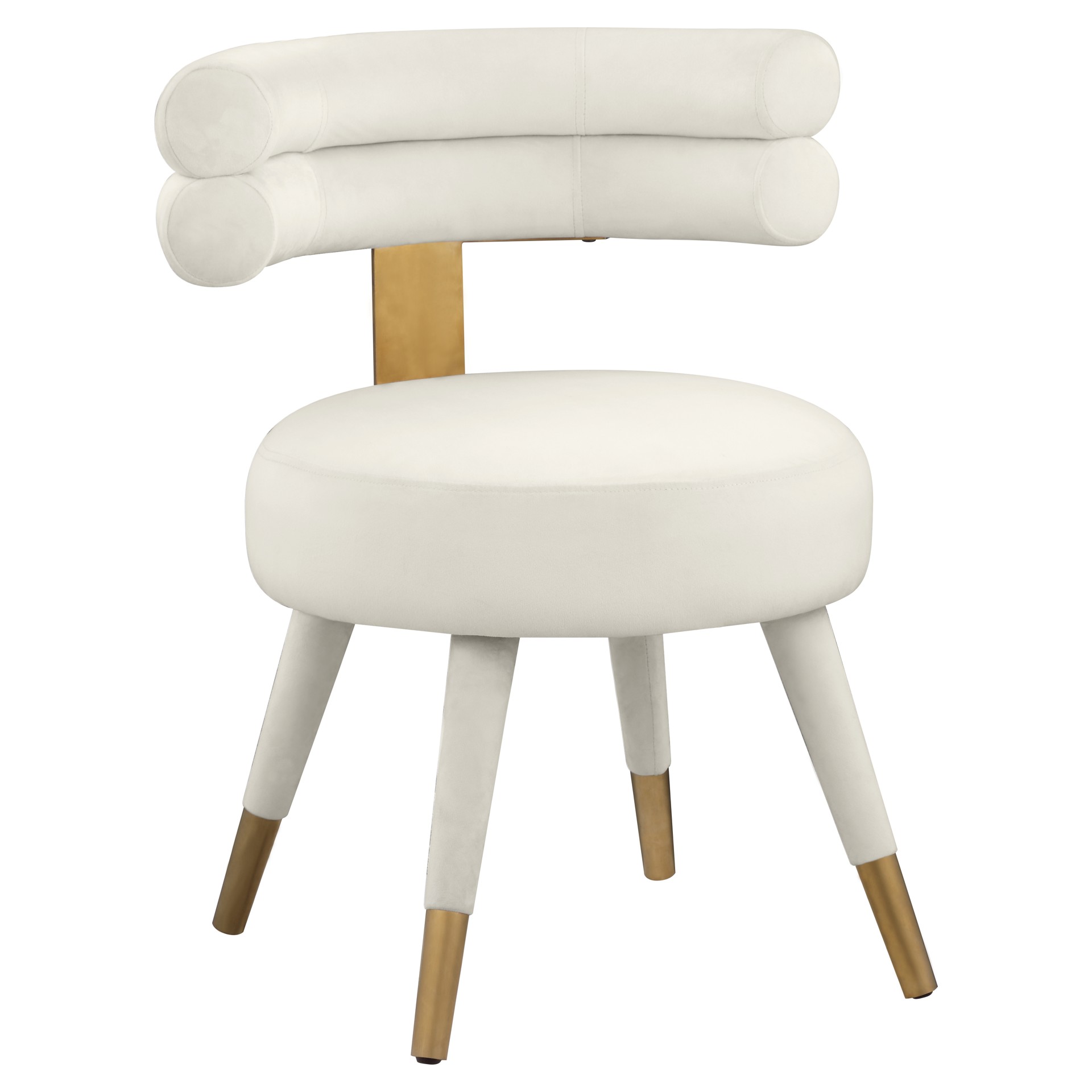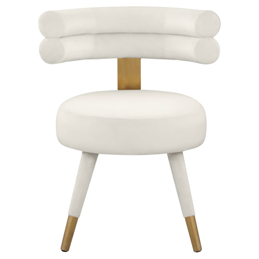 Covered in chic and soft cream velvet upholstery, this glamourous dining chair offers a padded seat and back to cradle your body in comfort while you enjoy a cocktail or a plate of smiley faced pancakes.