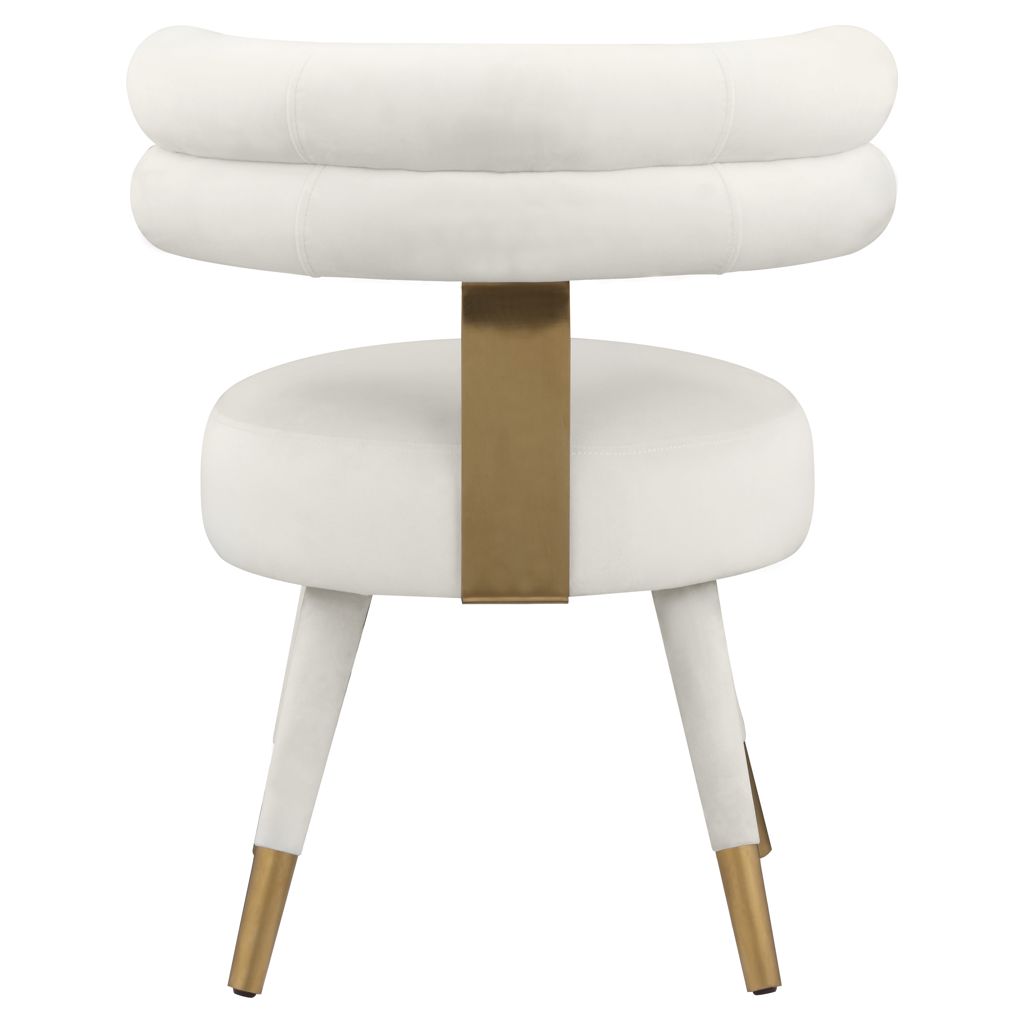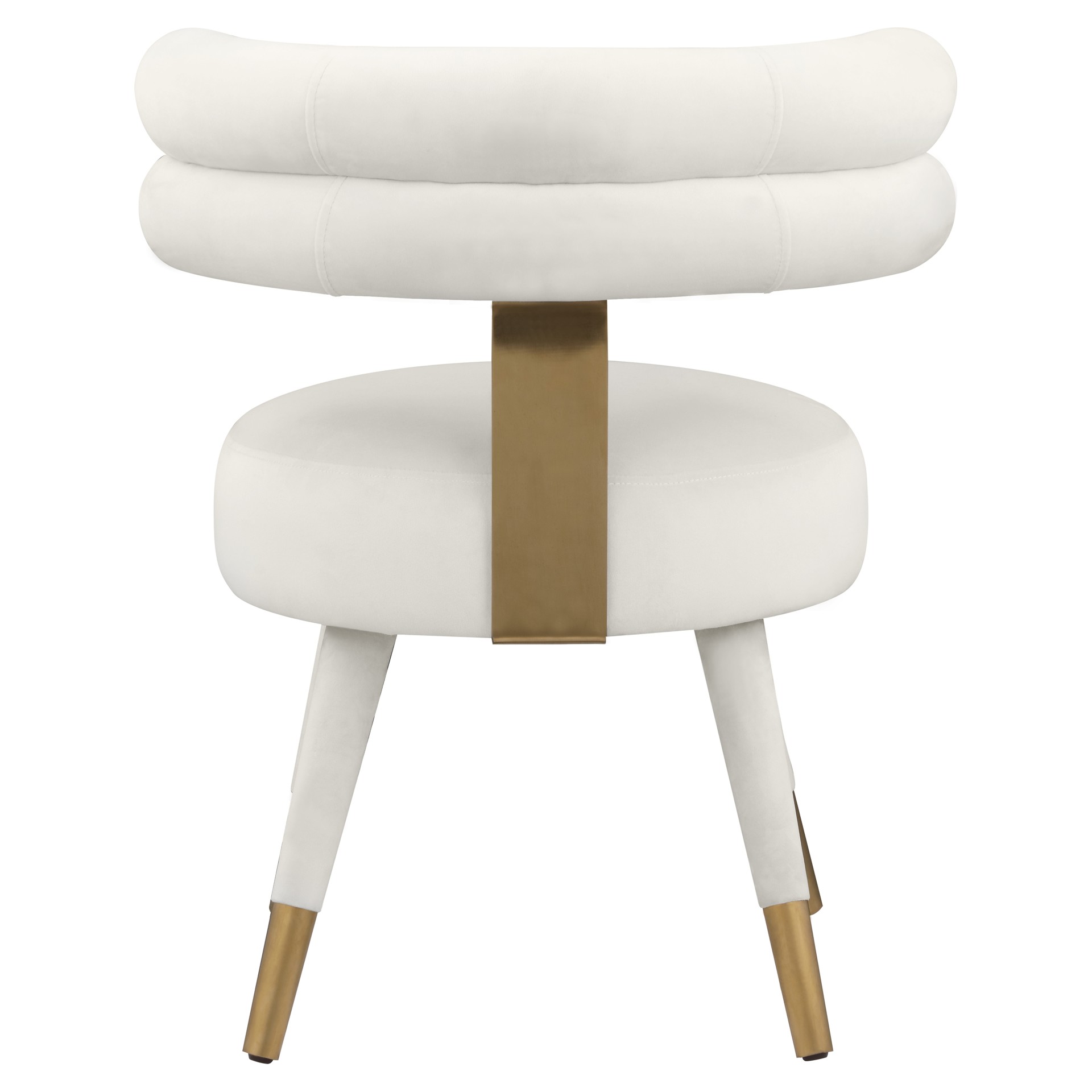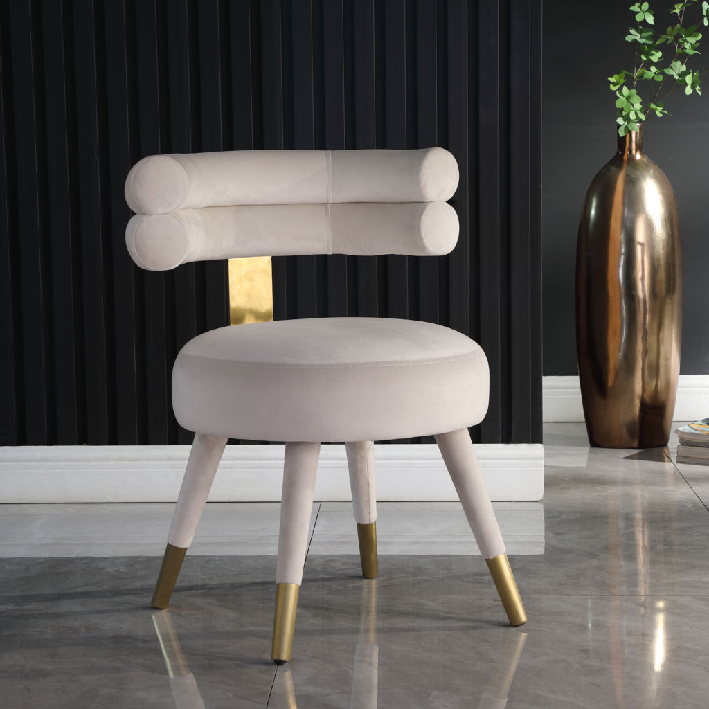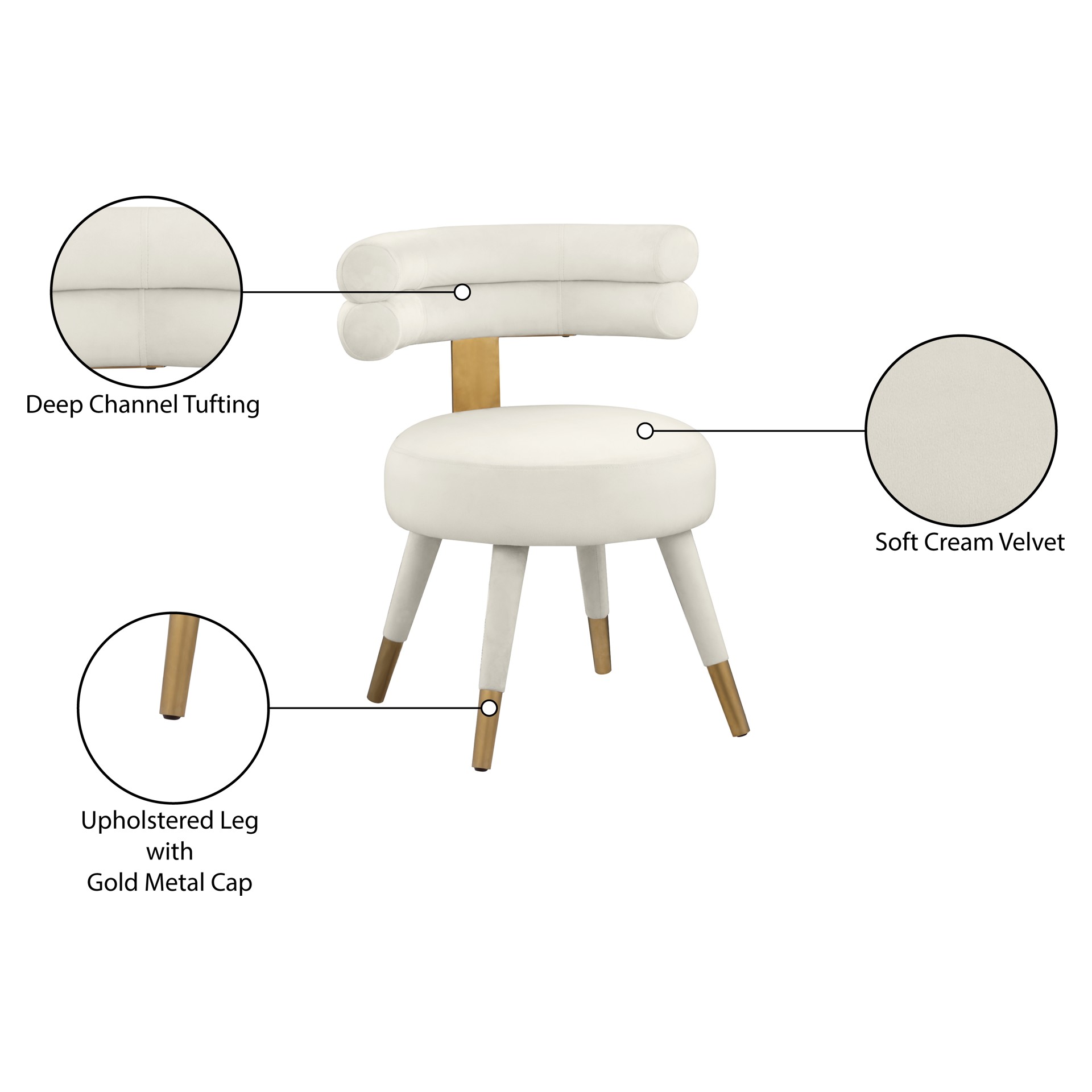 Covered in chic and soft cream velvet upholstery, this glamourous dining chair offers a padded seat and back to cradle your body in comfort while you enjoy a cocktail or a plate of smiley faced pancakes.