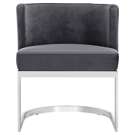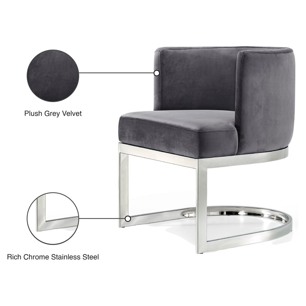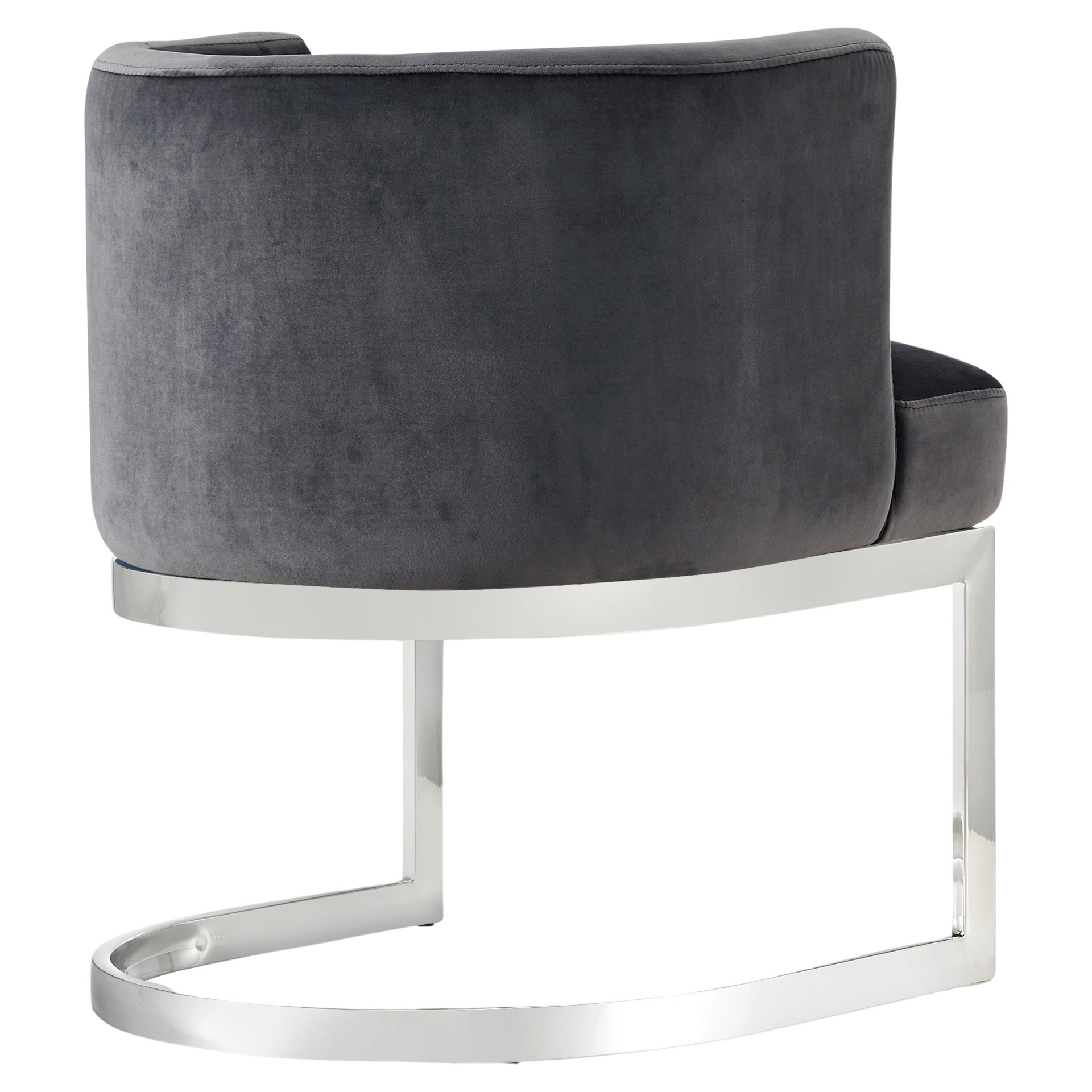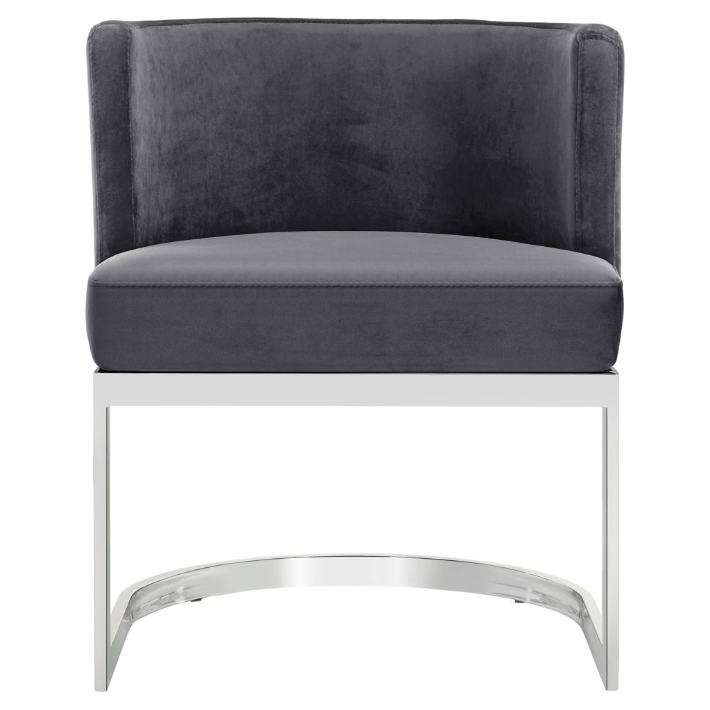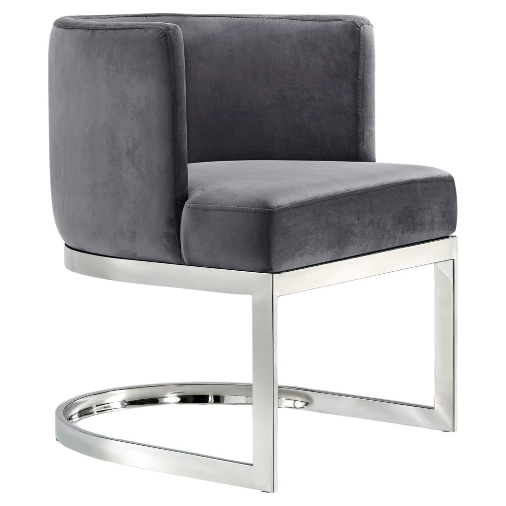 The back of the chair has a barrel design that cradles you in comfort while you enjoy a meal with friends, and the chair is thickly padded and upholstered in plush grey velvet for a luxe feel.
