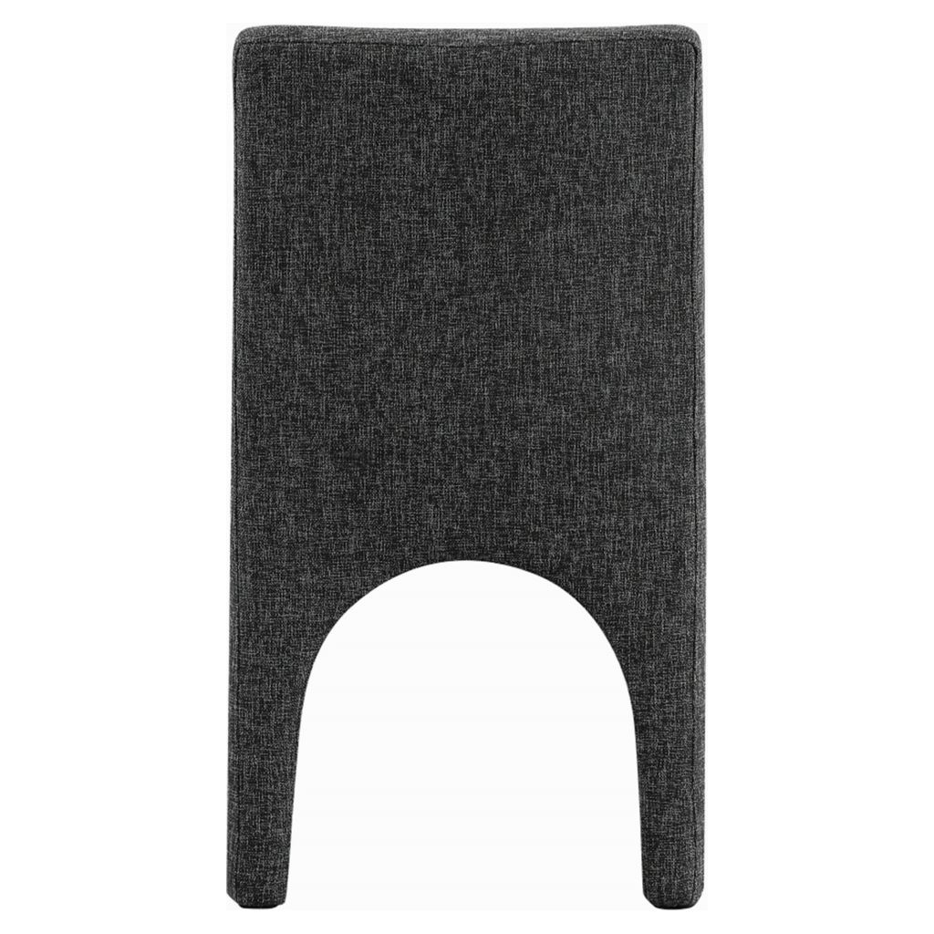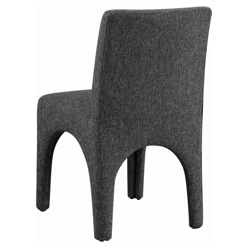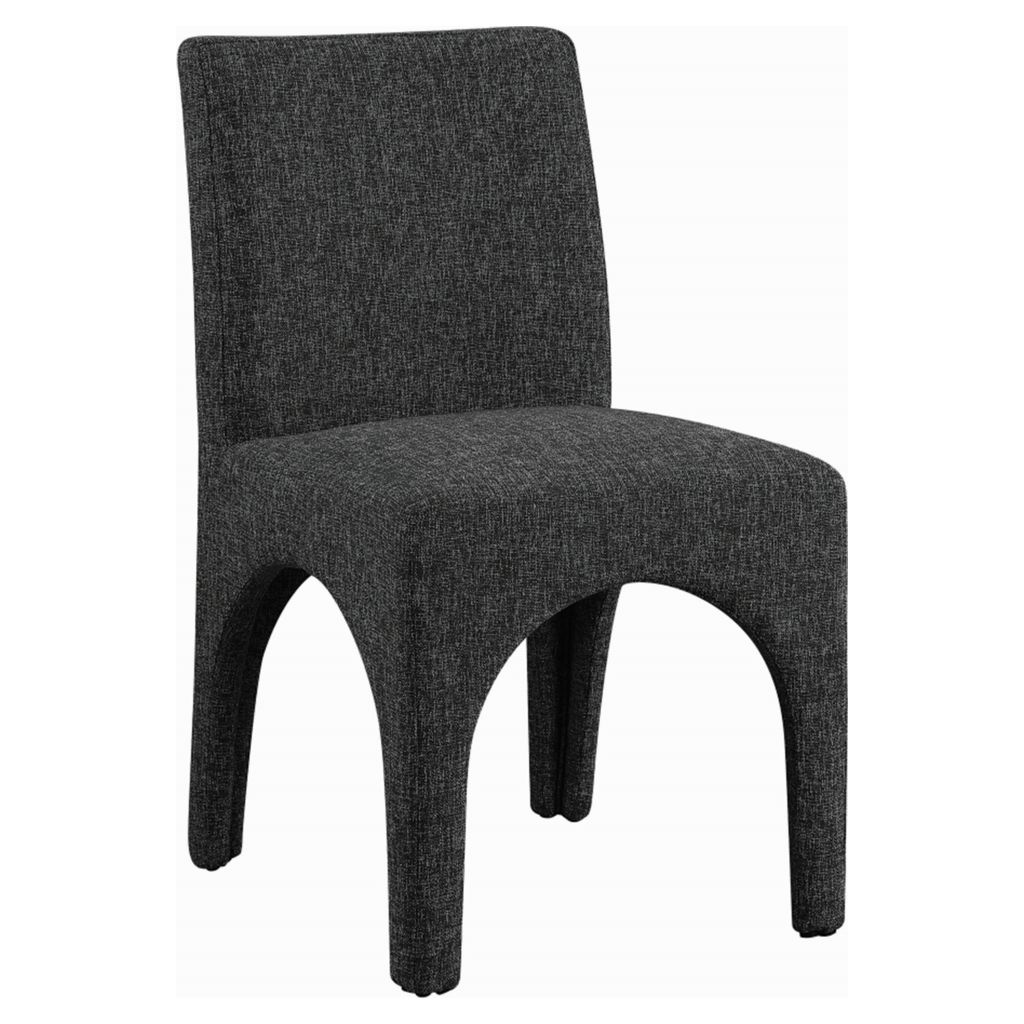 This chair is upholstered with a plush black fabric that has a subtle white weave, giving your dining room a refined and sophisticated look.