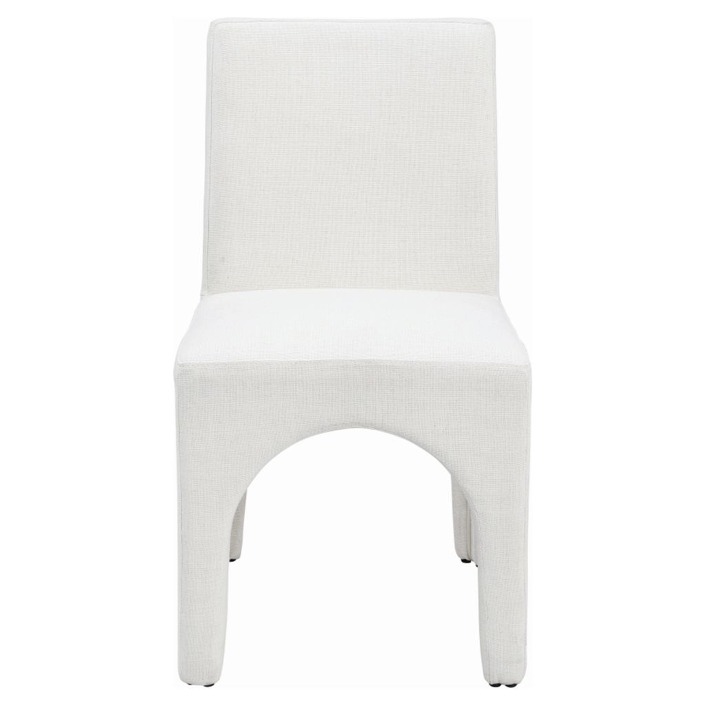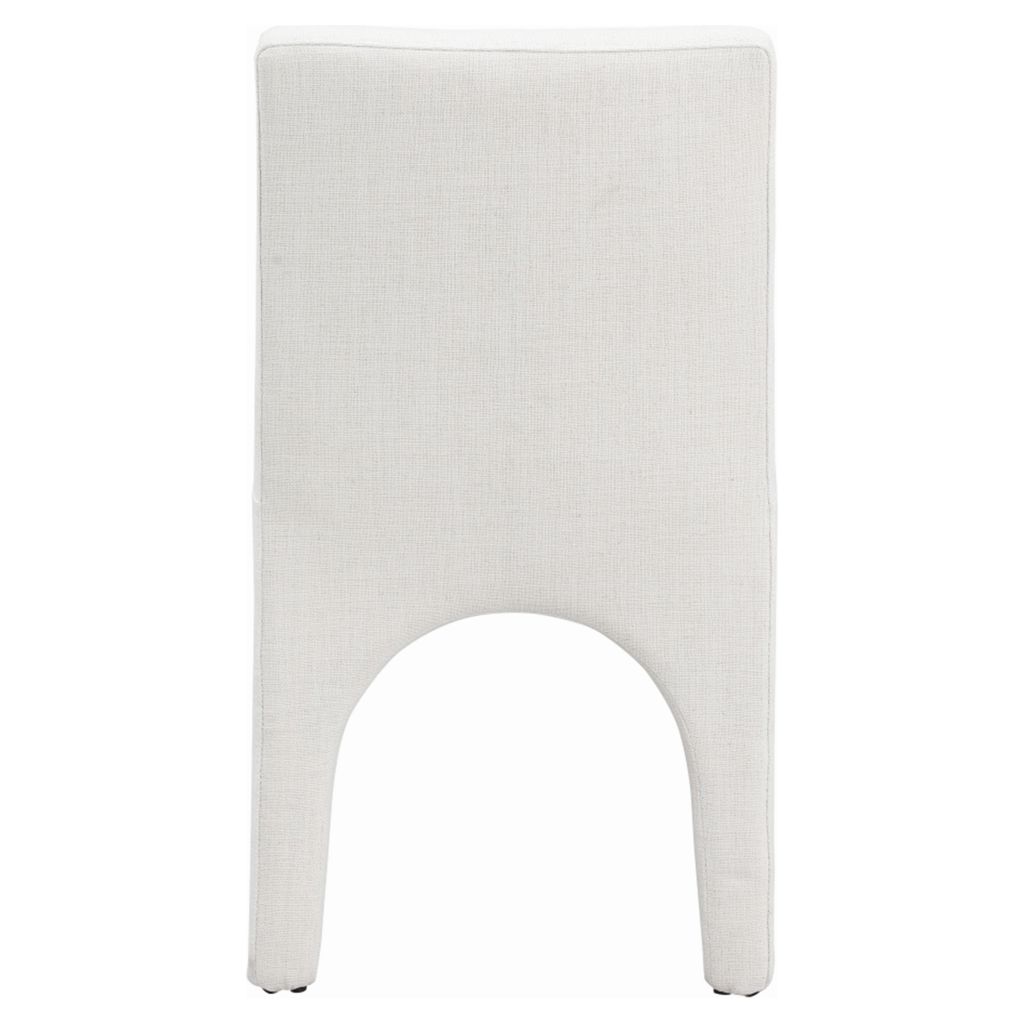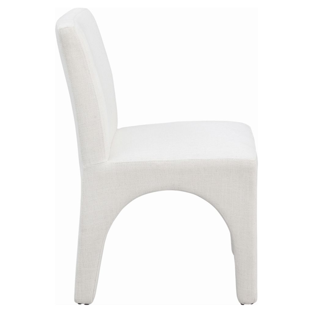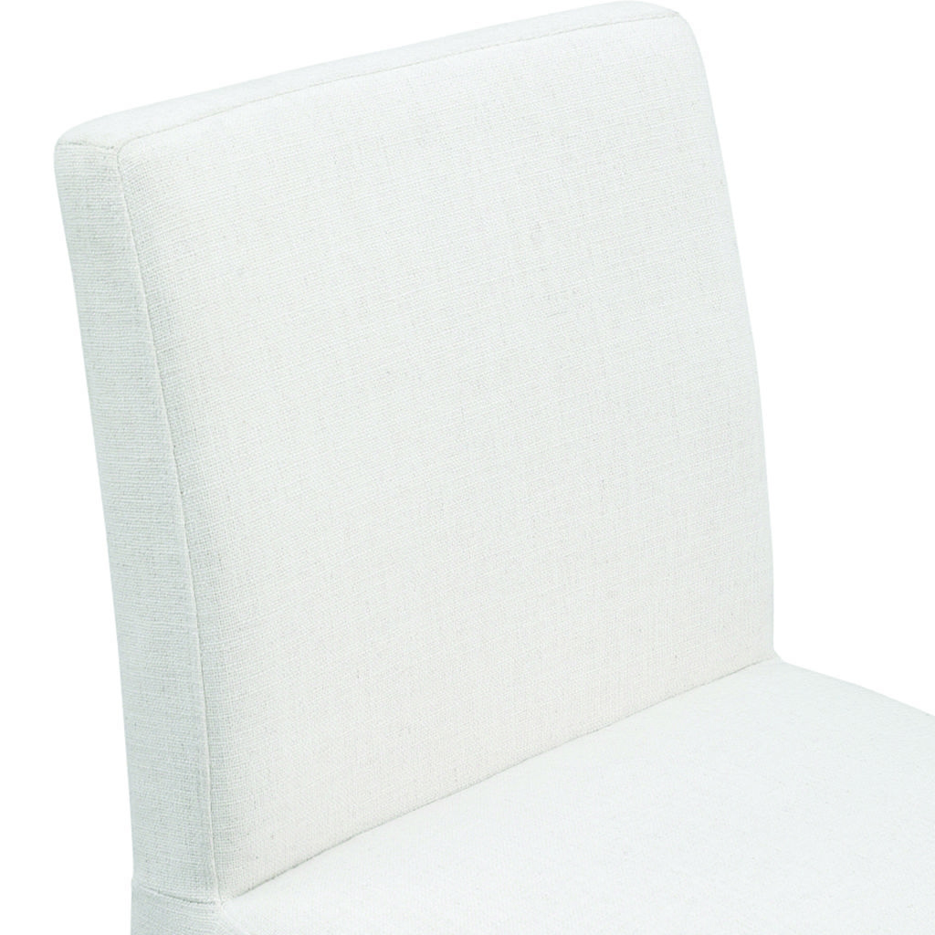 This chair is upholstered with a plush cream fabric that has a subtle white weave, giving your dining room a refined and sophisticated look.