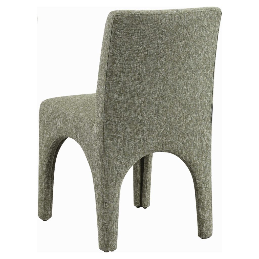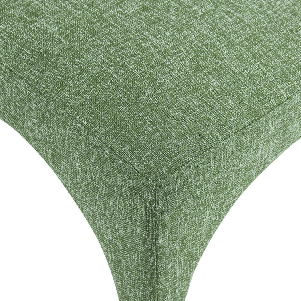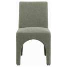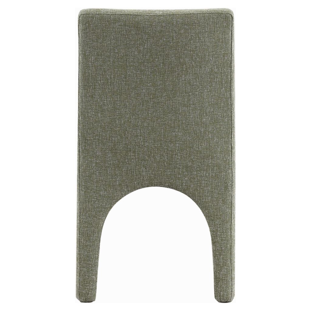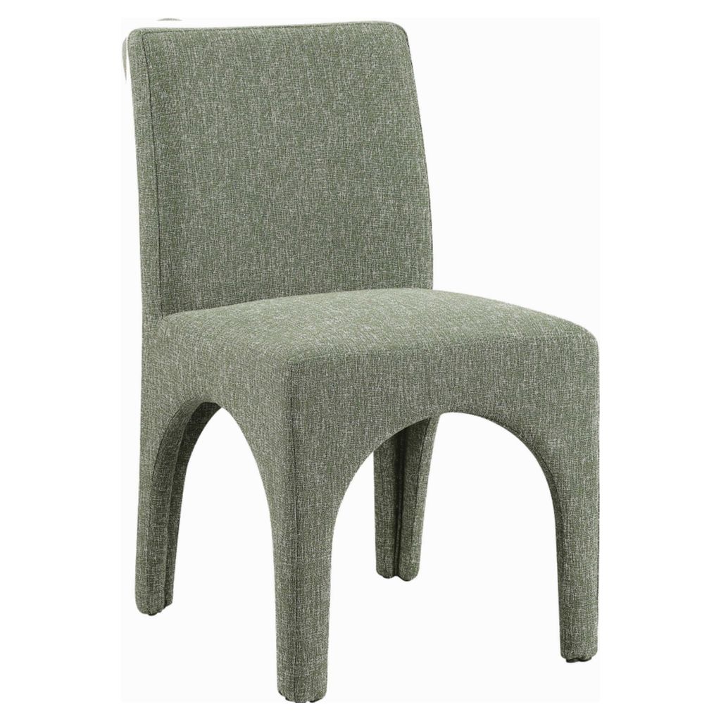 This chair is upholstered with a plush green fabric that has a subtle white weave, giving your dining room a refined and sophisticated look.