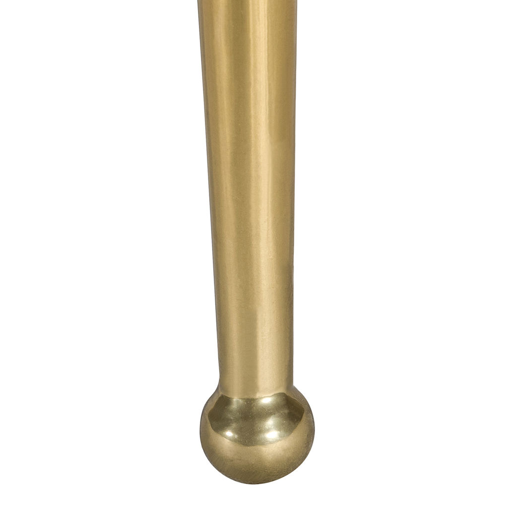 The chair has a wooden frame, and is supported by four brushed gold legs, with decorative balls for feet.