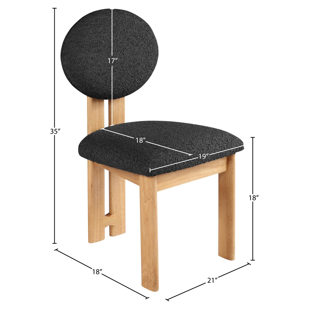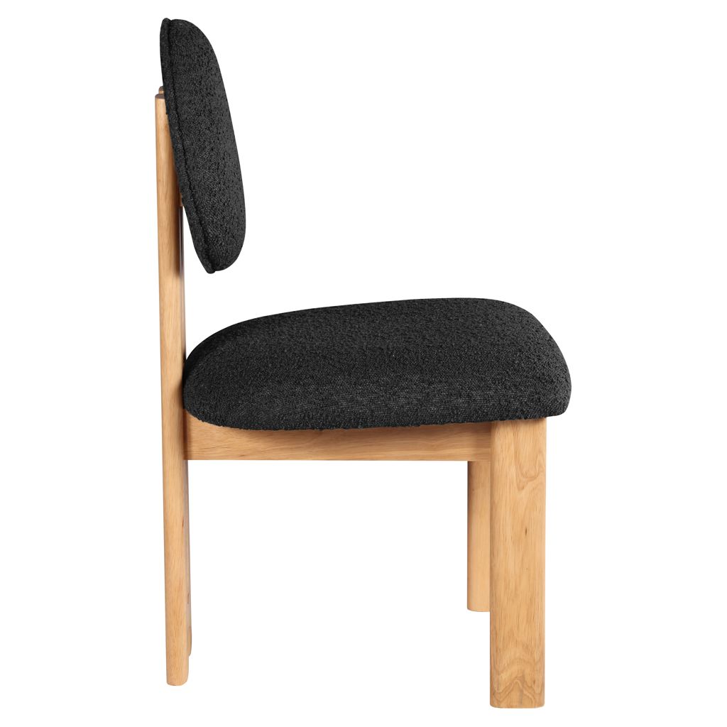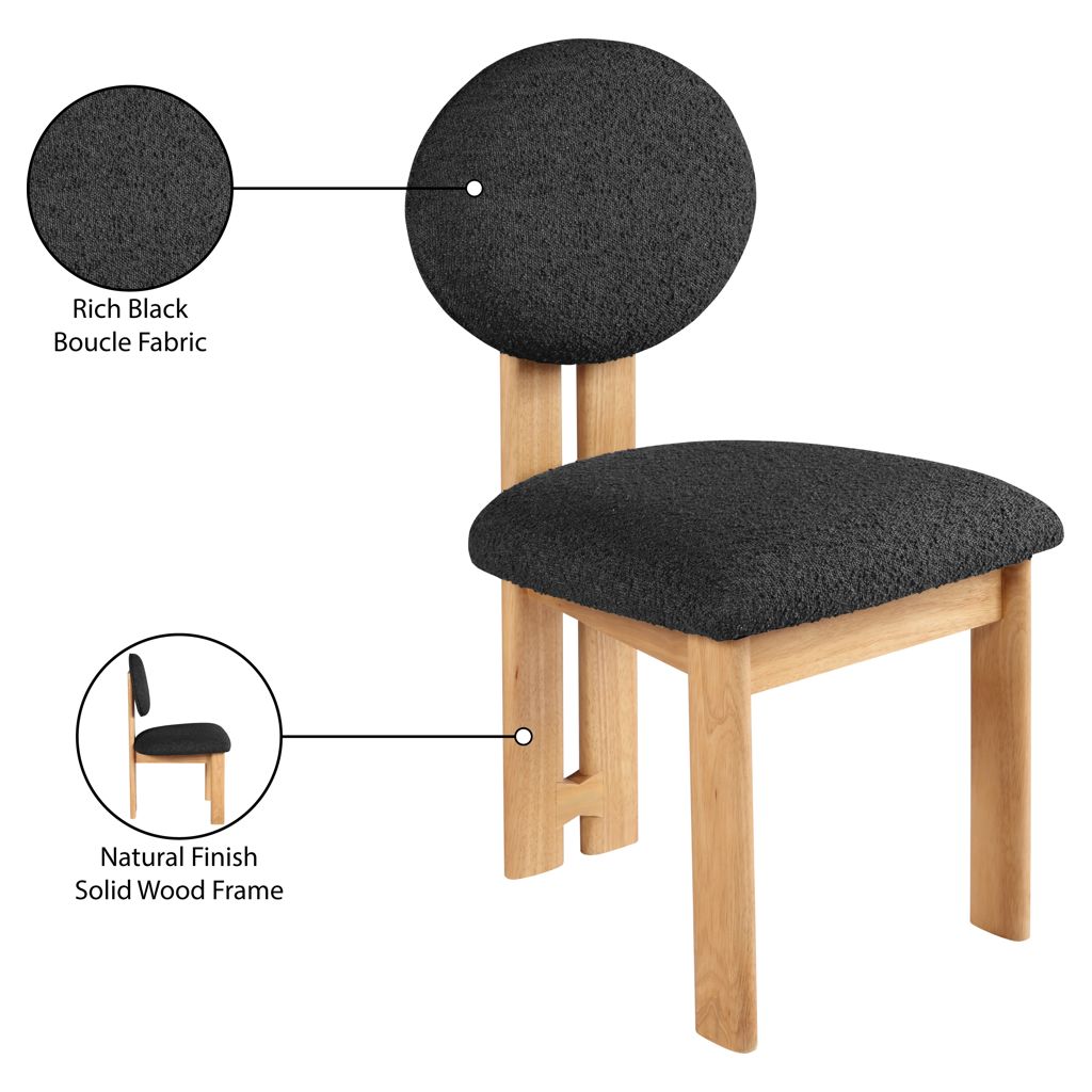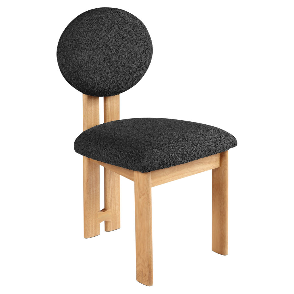 Featuring a lustrous black boucle fabric and a sturdy natural finish solid wood frame, this piece is sure to captivate and entice.