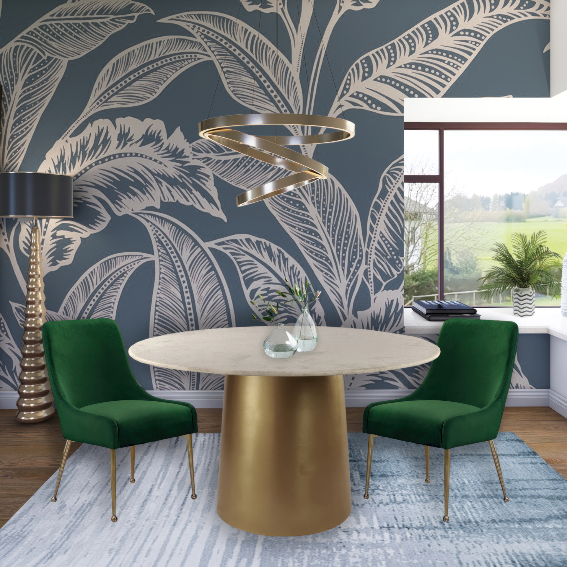 The polished gold legs have a ball design for added visual oomph, and a matching handle on the back adds an elegant detail while also providing an easy way to slide the chairs in and out from your choice of table.