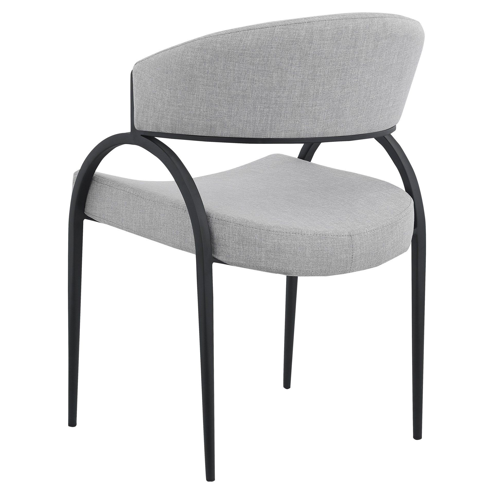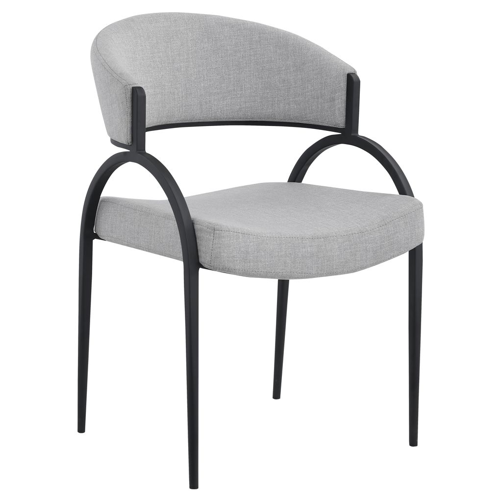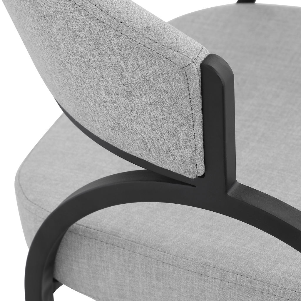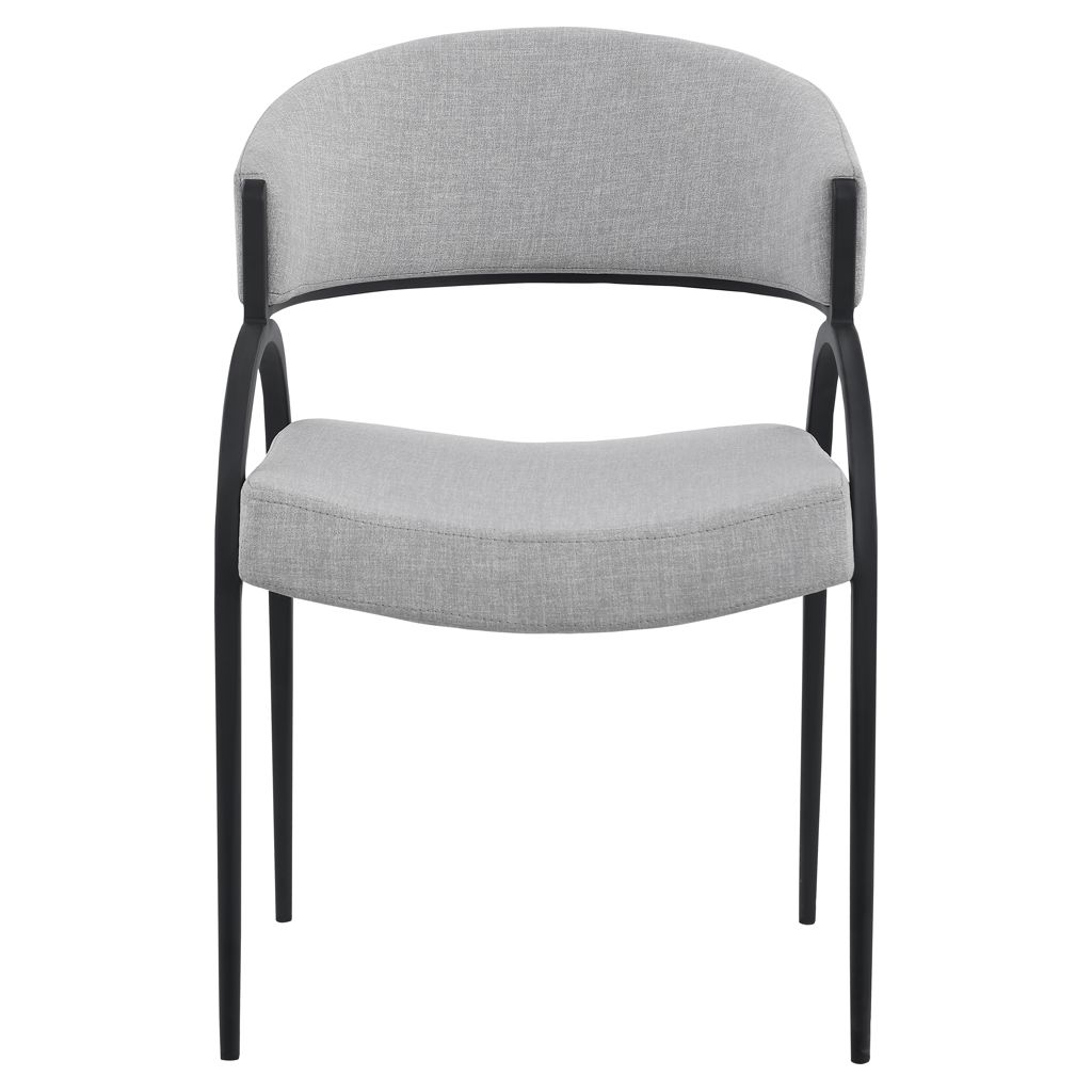 Soft grey linen-like polyester fabric upholsters the seat and back rest, providing you with a comfortable place to sit and relax while you dine with family and friends.