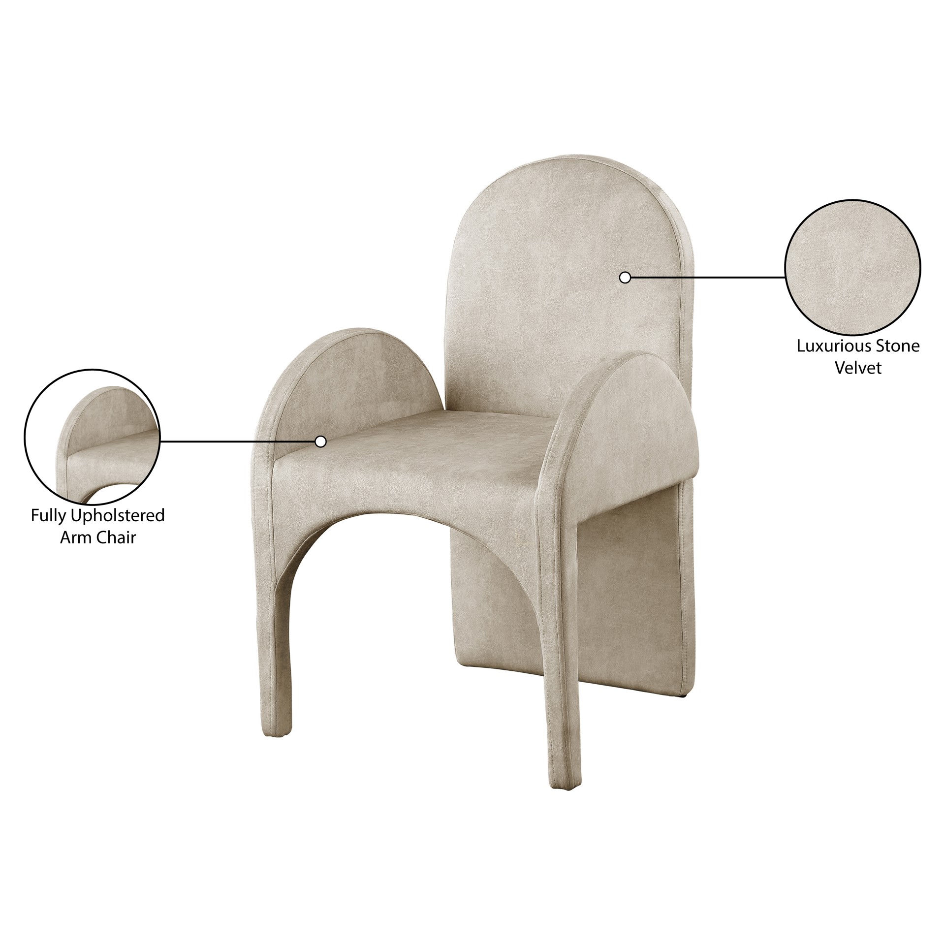 Featuring a luxurious stone velvet upholstery, this fully upholstered armchair offers comfort and support while you enjoy your meals.