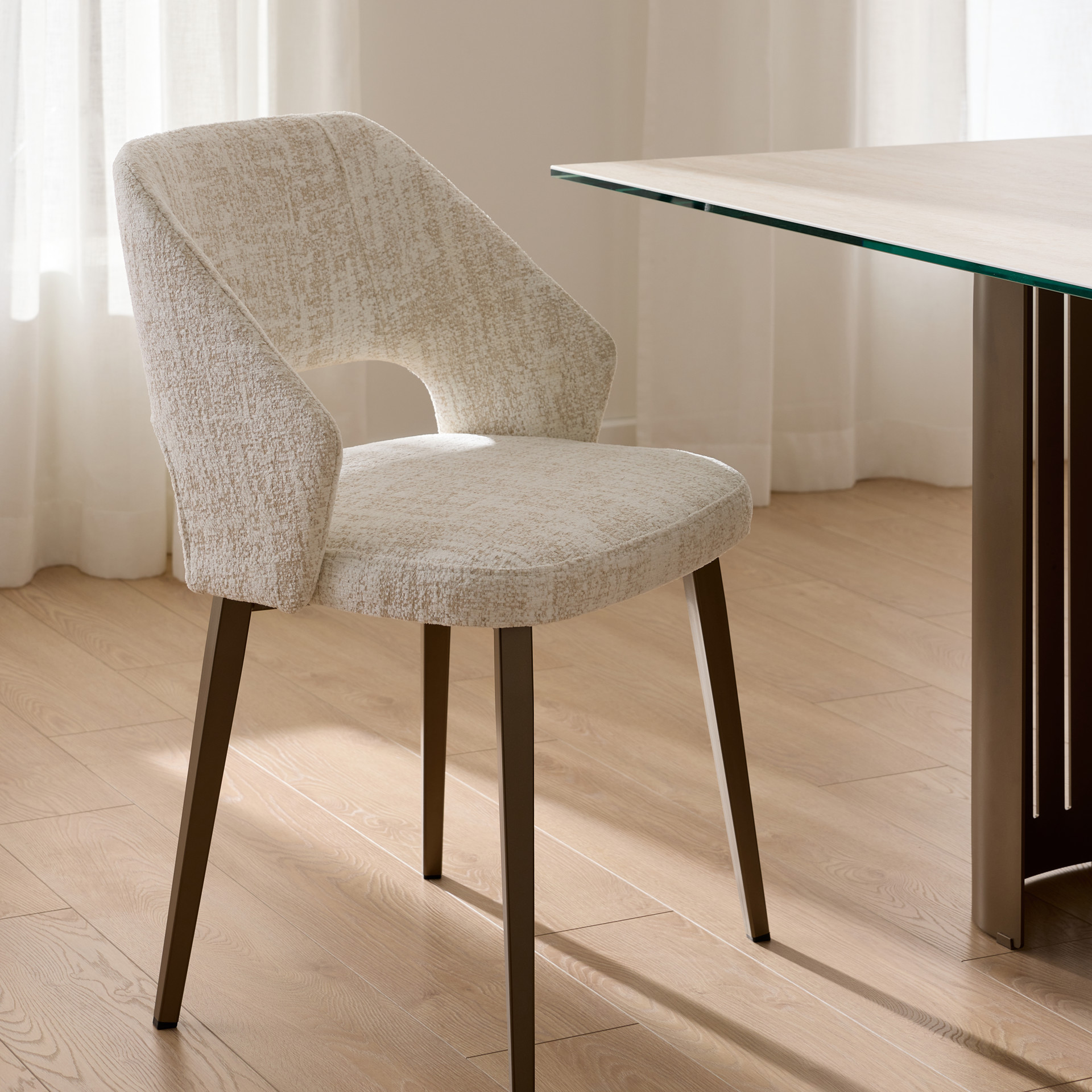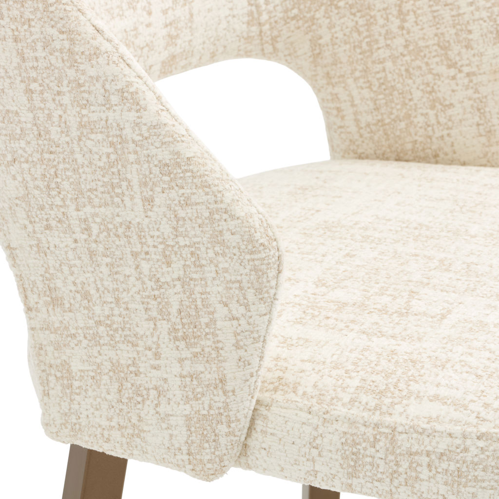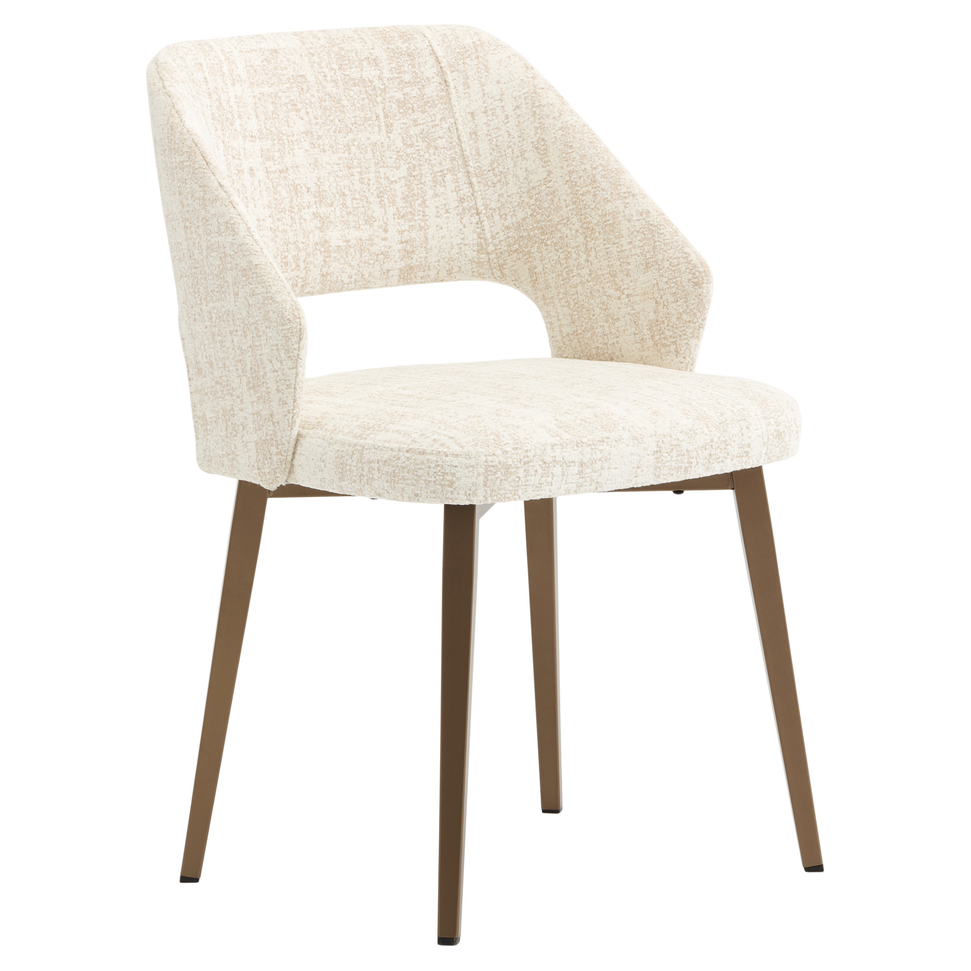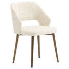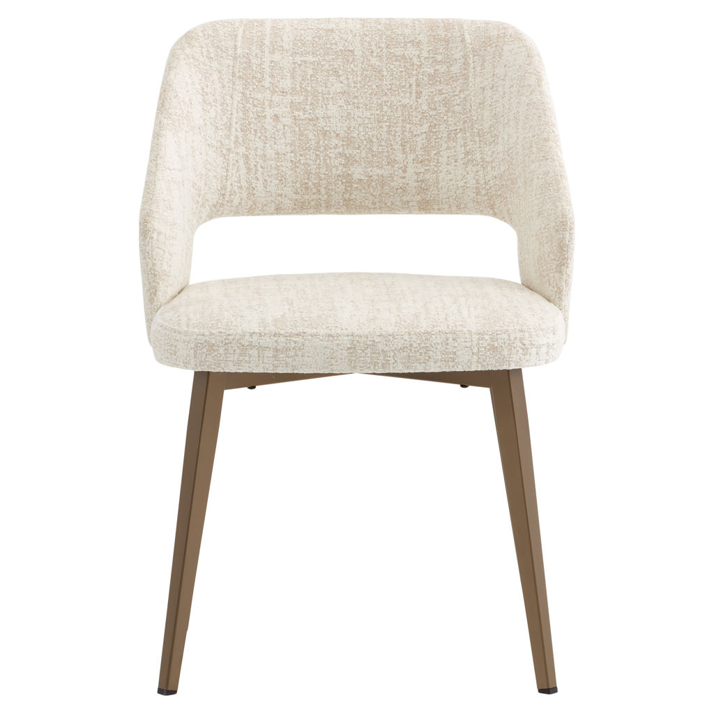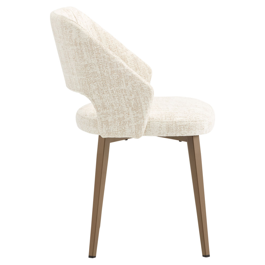 This dining chair perfectly combines comfort and elegance with its soft-to-the-touch fabric upholstery in a soothing natural tone. Its wraparound shape provides optimal support for long moments at the table, while its metal legs add a warm touch to your interior.
