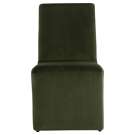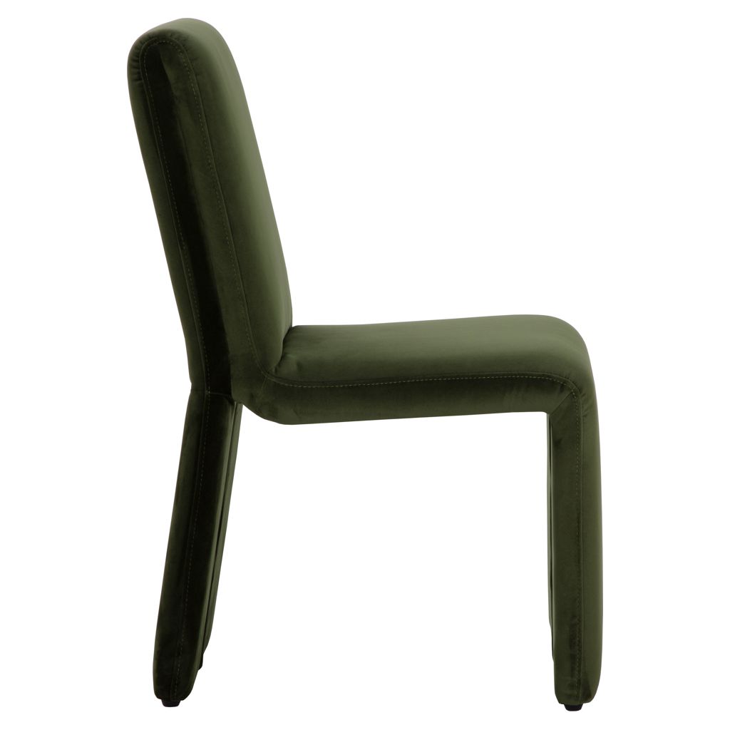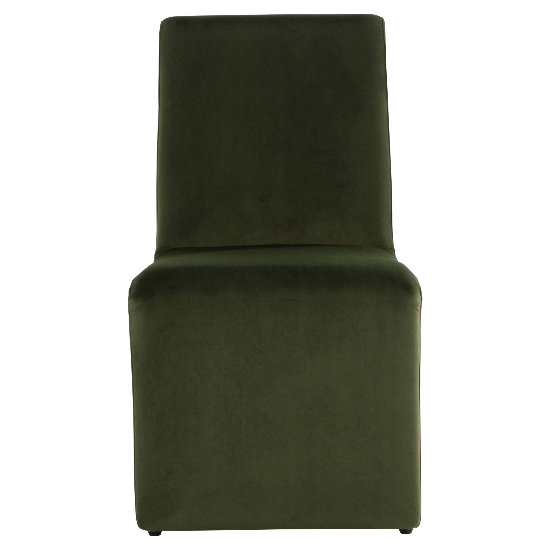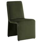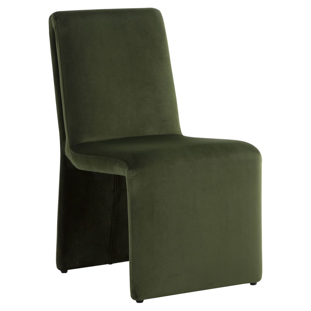 This dining chair combines comfort and sophistication with its deep, soothing green fabric upholstery. Its sleek silhouette and flowing lines blend naturally into any interior, whether modern or more traditional.