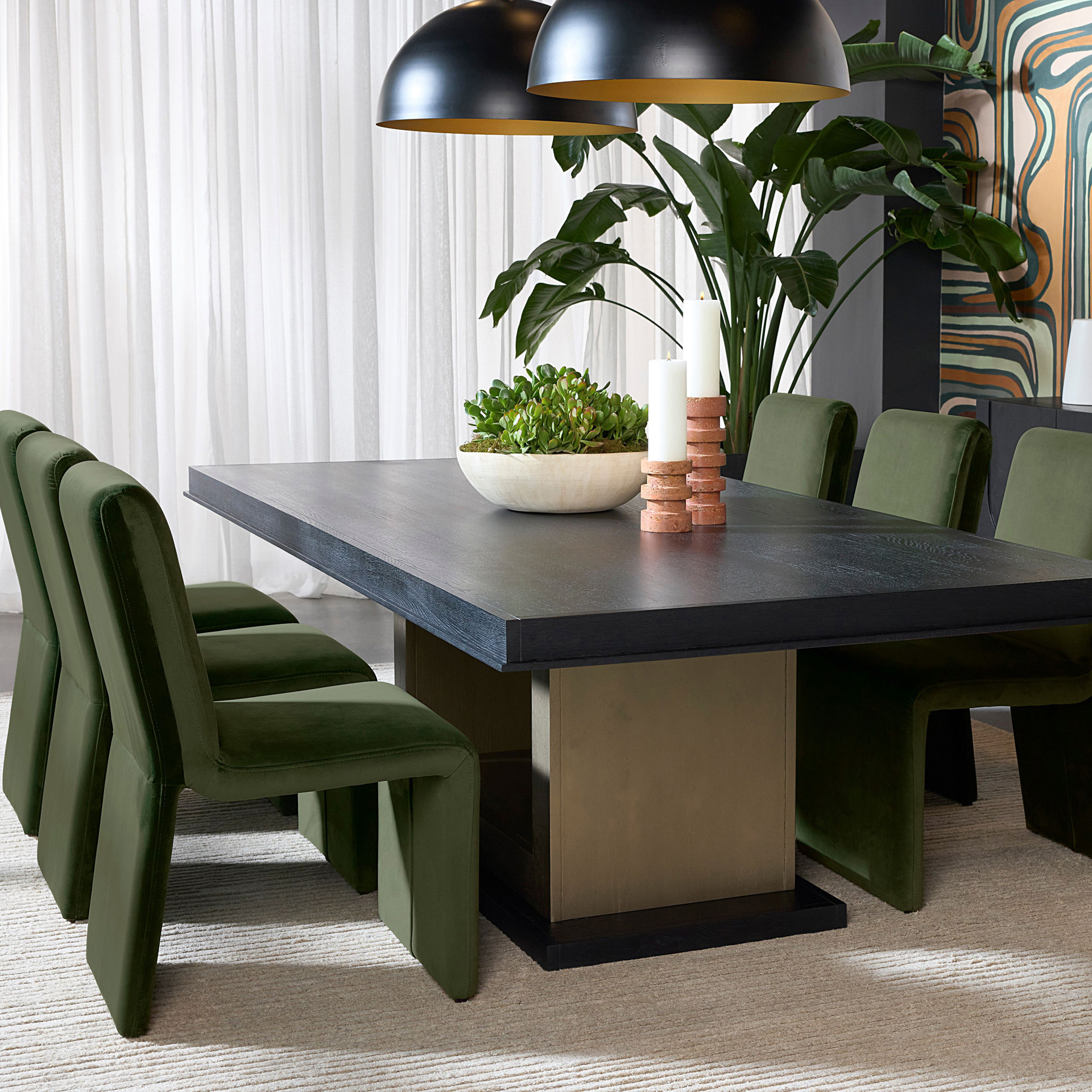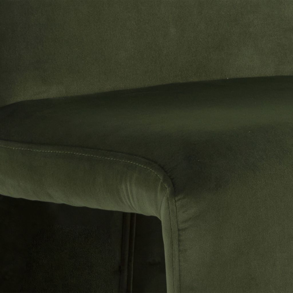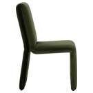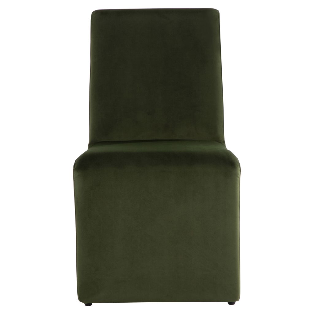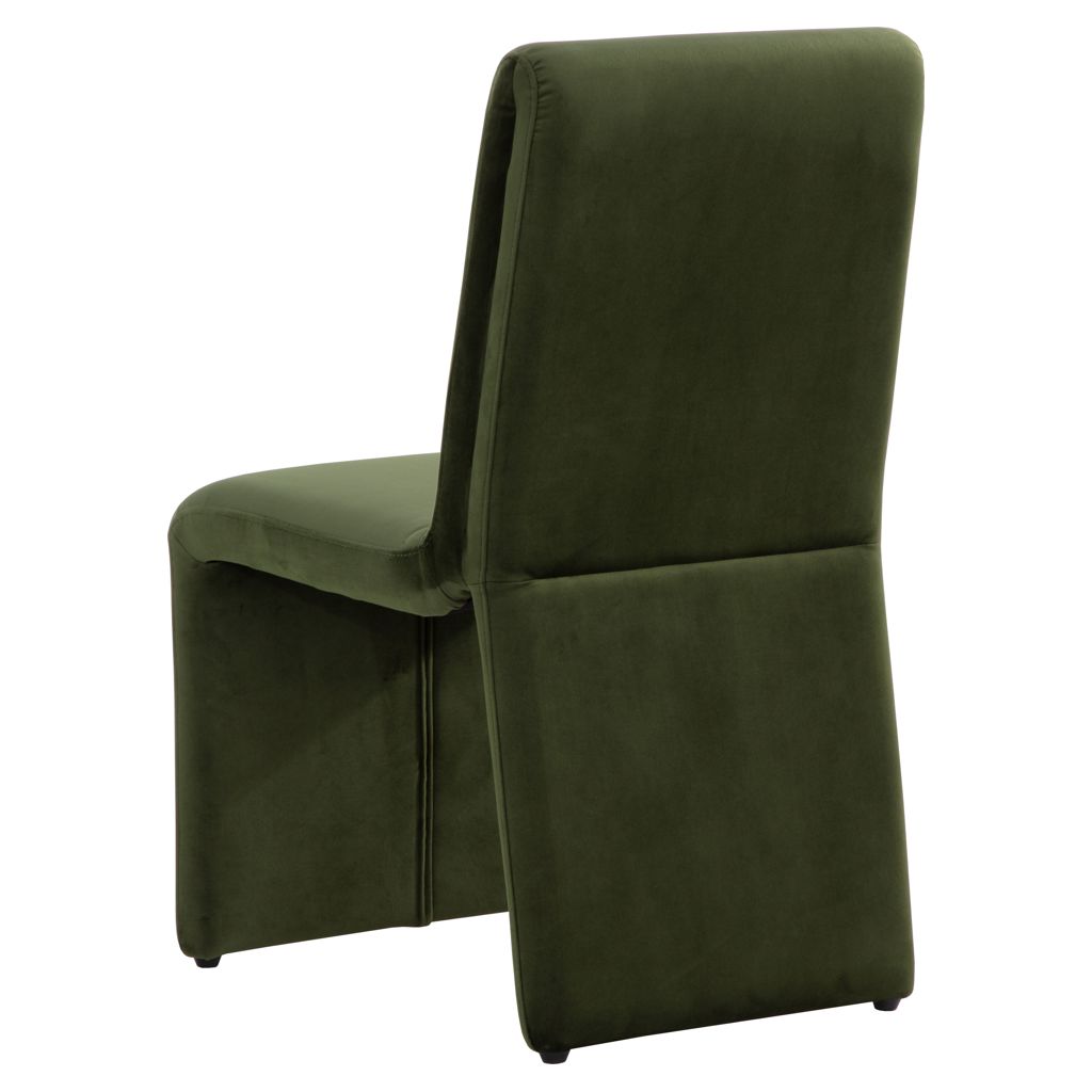 This dining chair combines comfort and sophistication with its deep, soothing green fabric upholstery. Its sleek silhouette and flowing lines blend naturally into any interior, whether modern or more traditional.