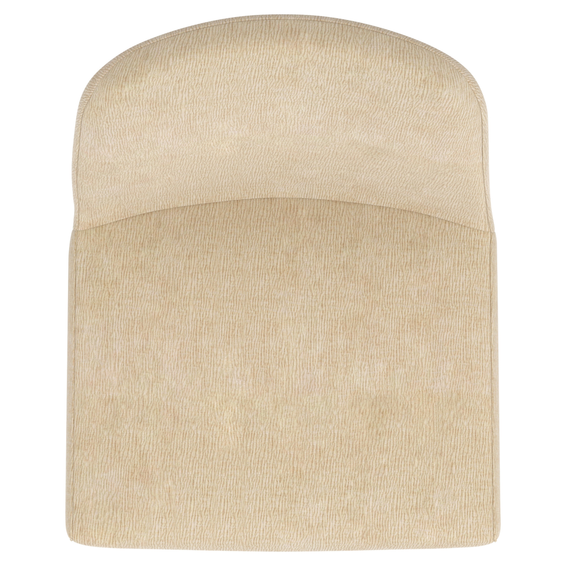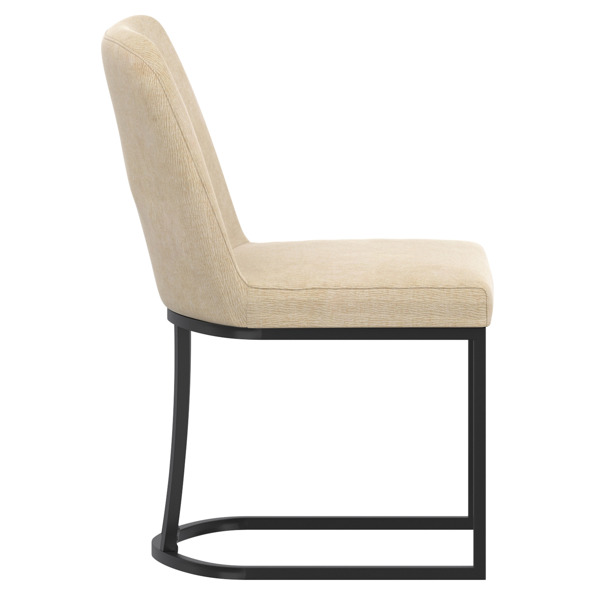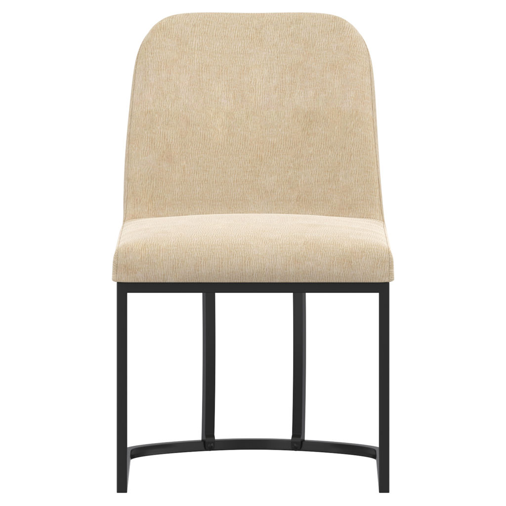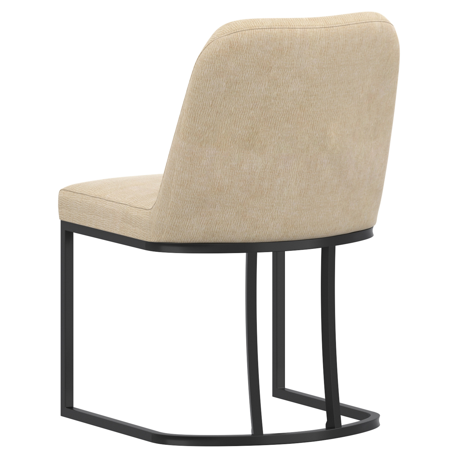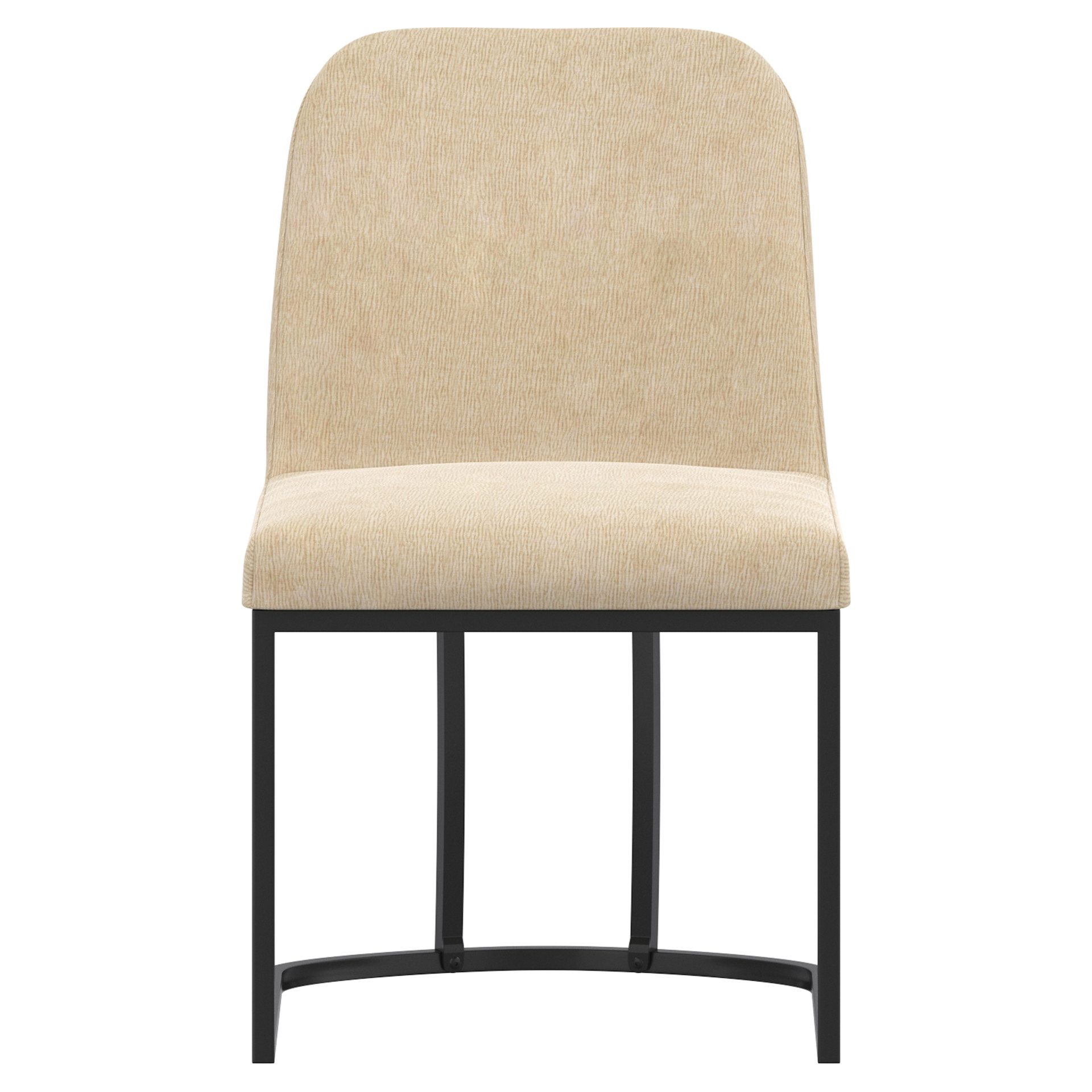 The curved seat is upholstered in a plush, chenille fabric, and the black metal frame adds geometric interest while providing sturdy support.