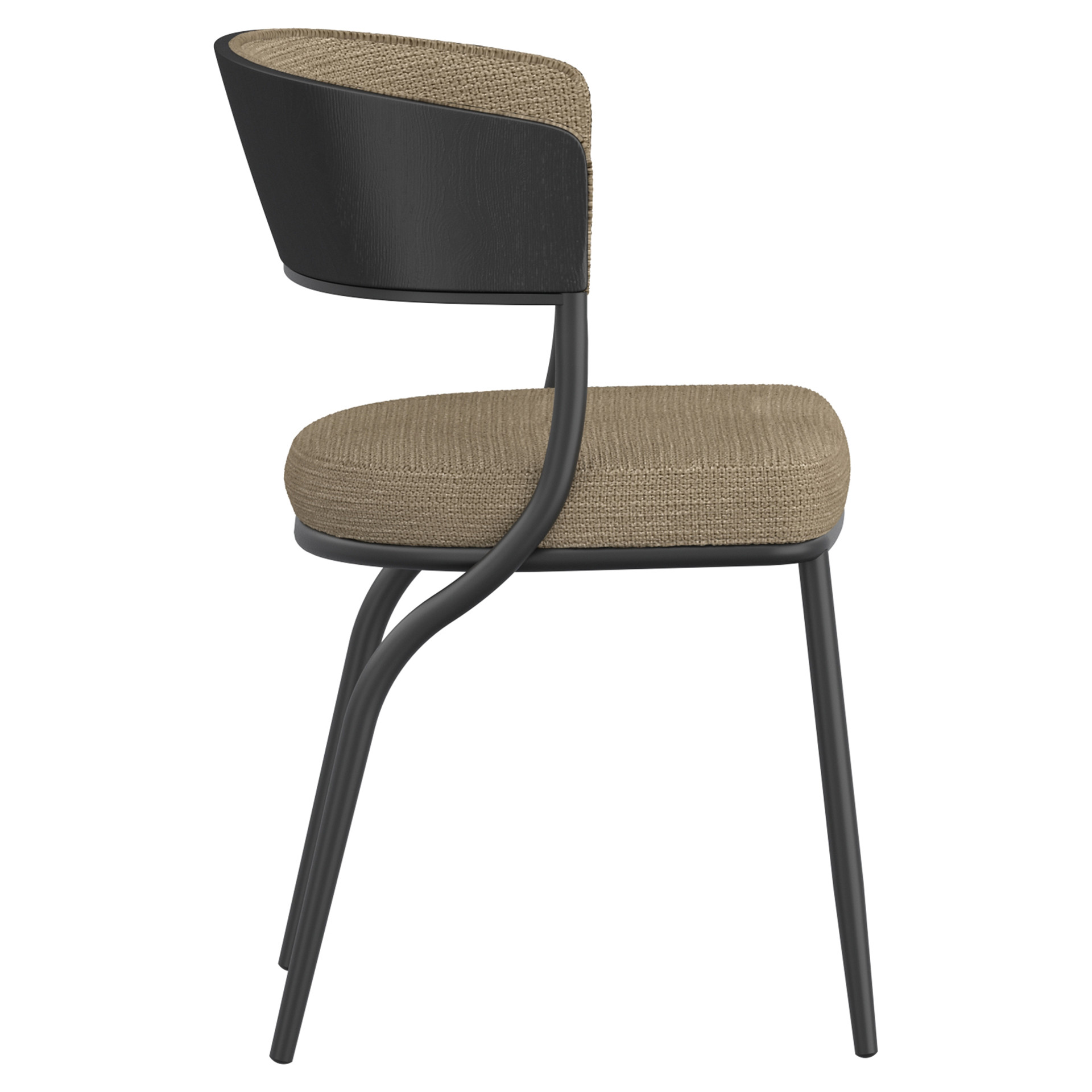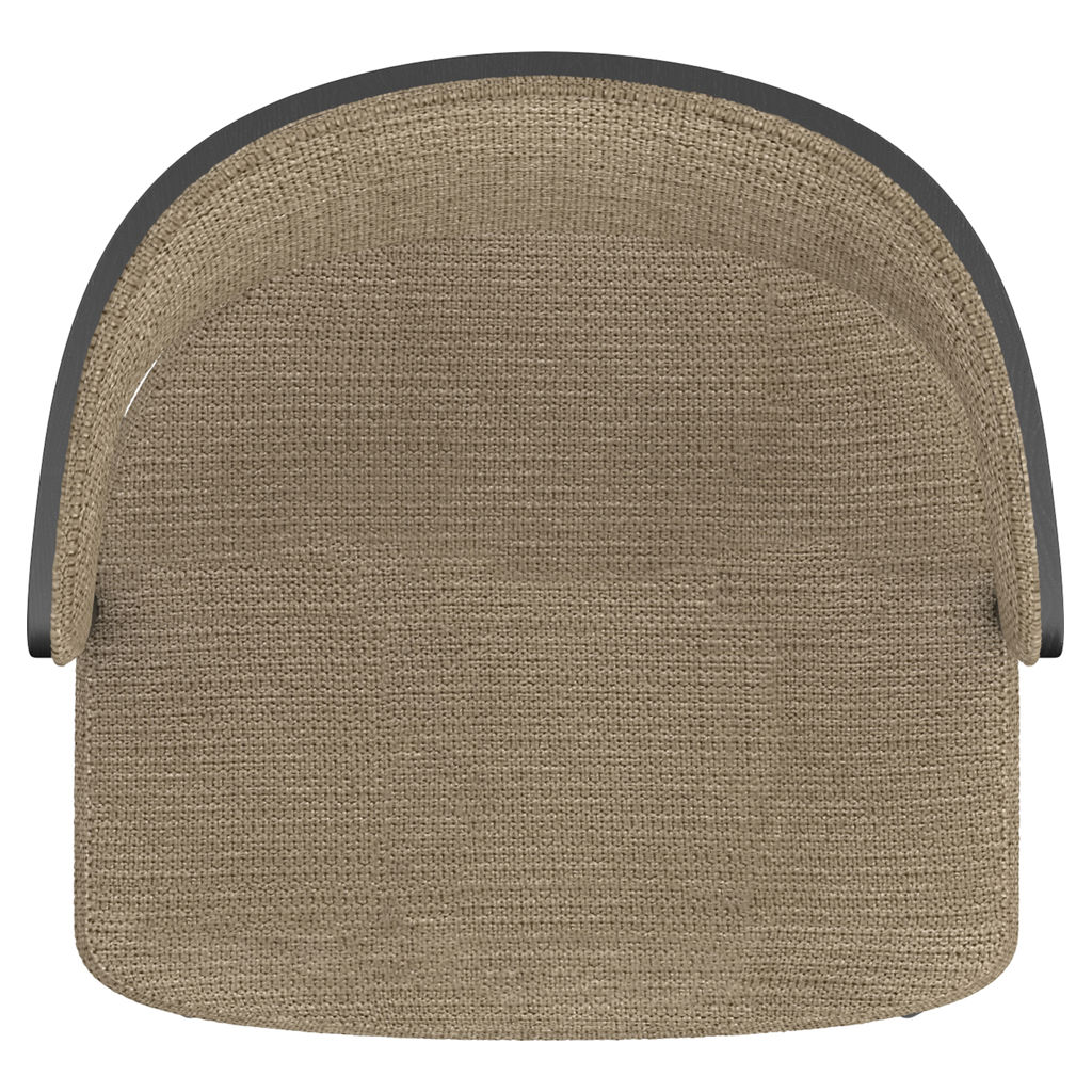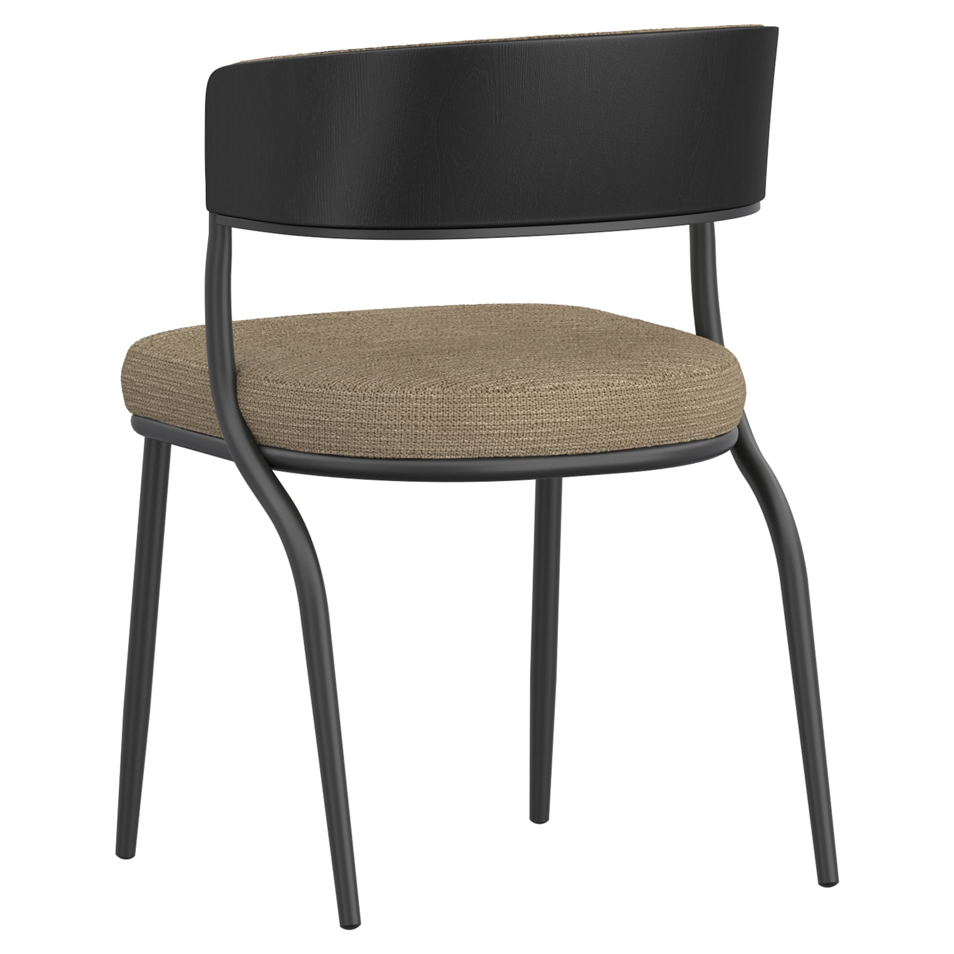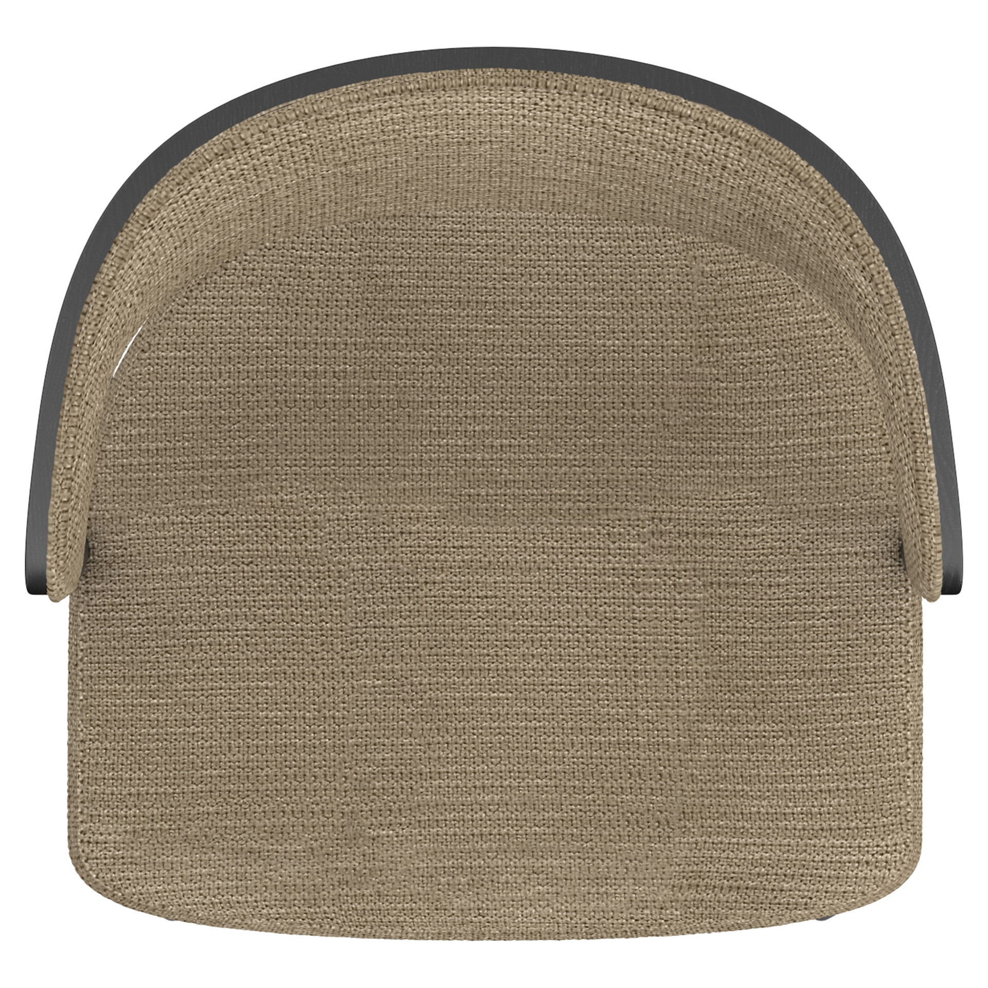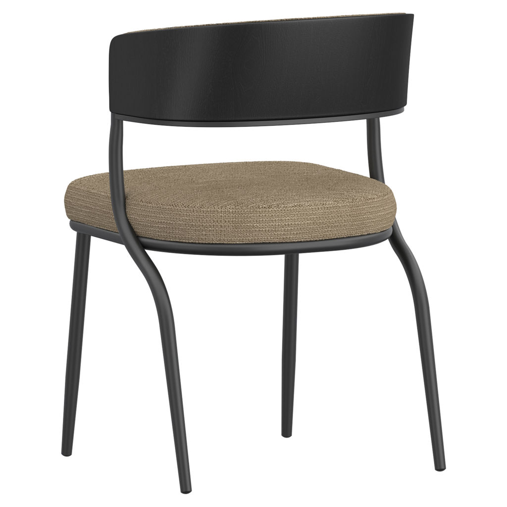 The curved bentwood seat back provides ergonomic support with a touch of natural warmth, while the seat cushion, upholstered in a soft, textured performance fabric, ensures lasting comfort.