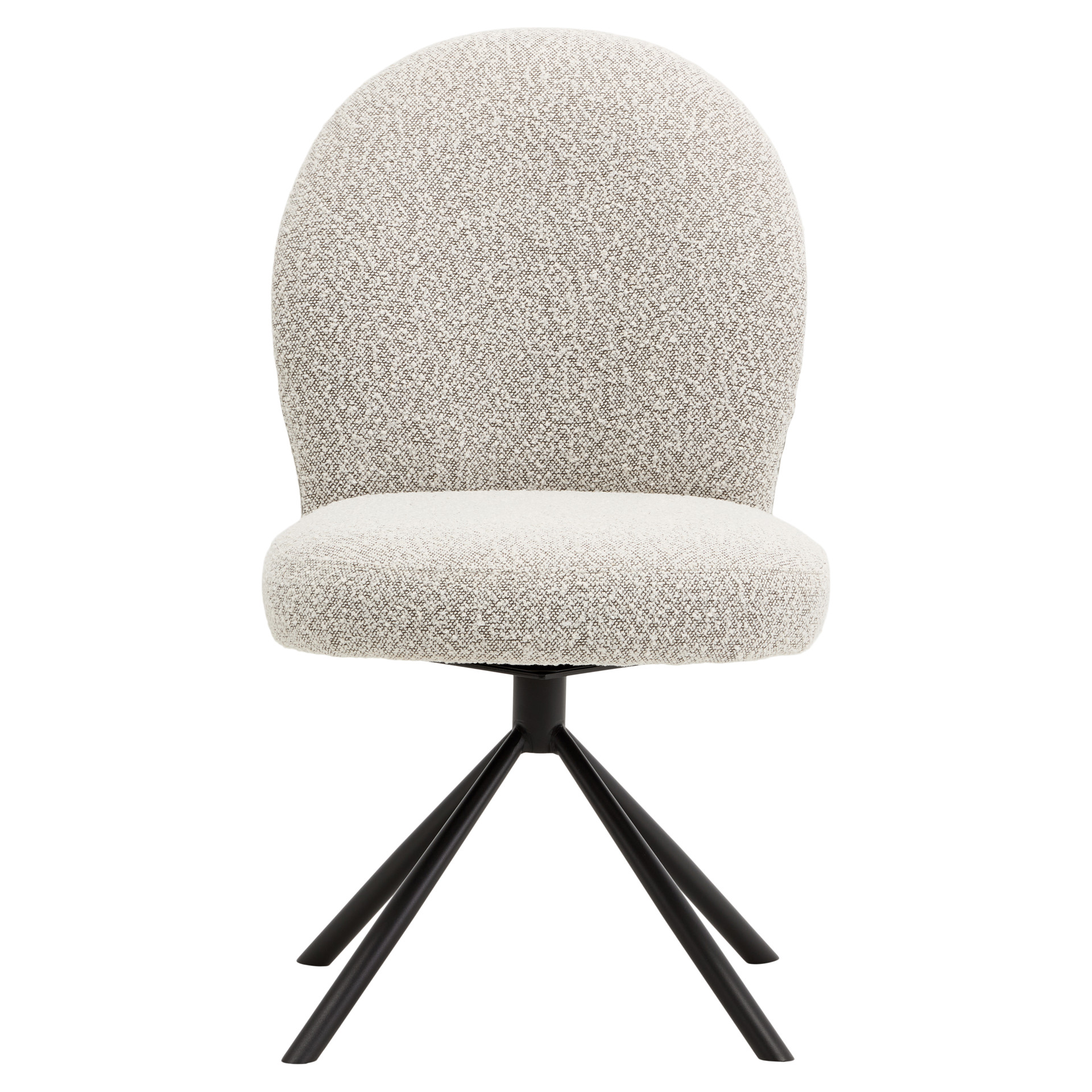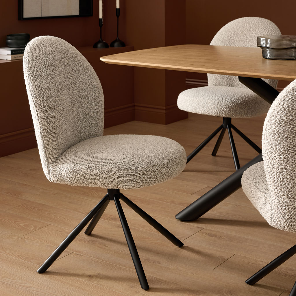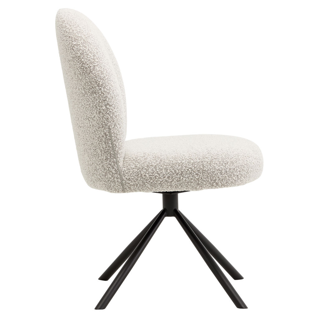 Combine comfort, elegance, and functionality with the Lawton swivel chair, featuring a sleek and contemporary design. Its rounded, inviting silhouette encourages lingering around the table for long, convivial meals. The soft gray bouclé fabric upholstery adds warmth and texture to your space, while the ergonomic backrest gently envelops you for optimal support.