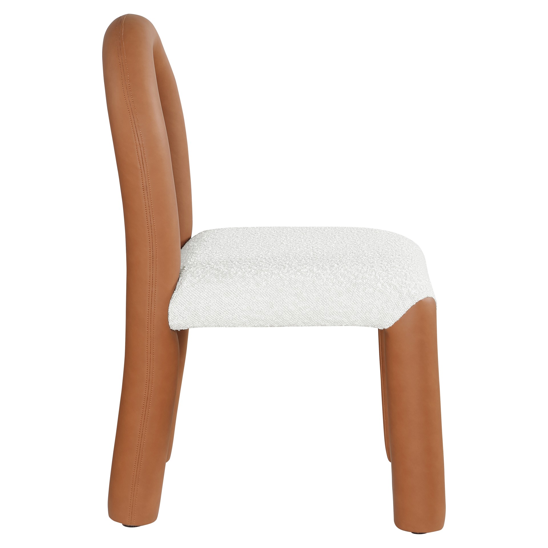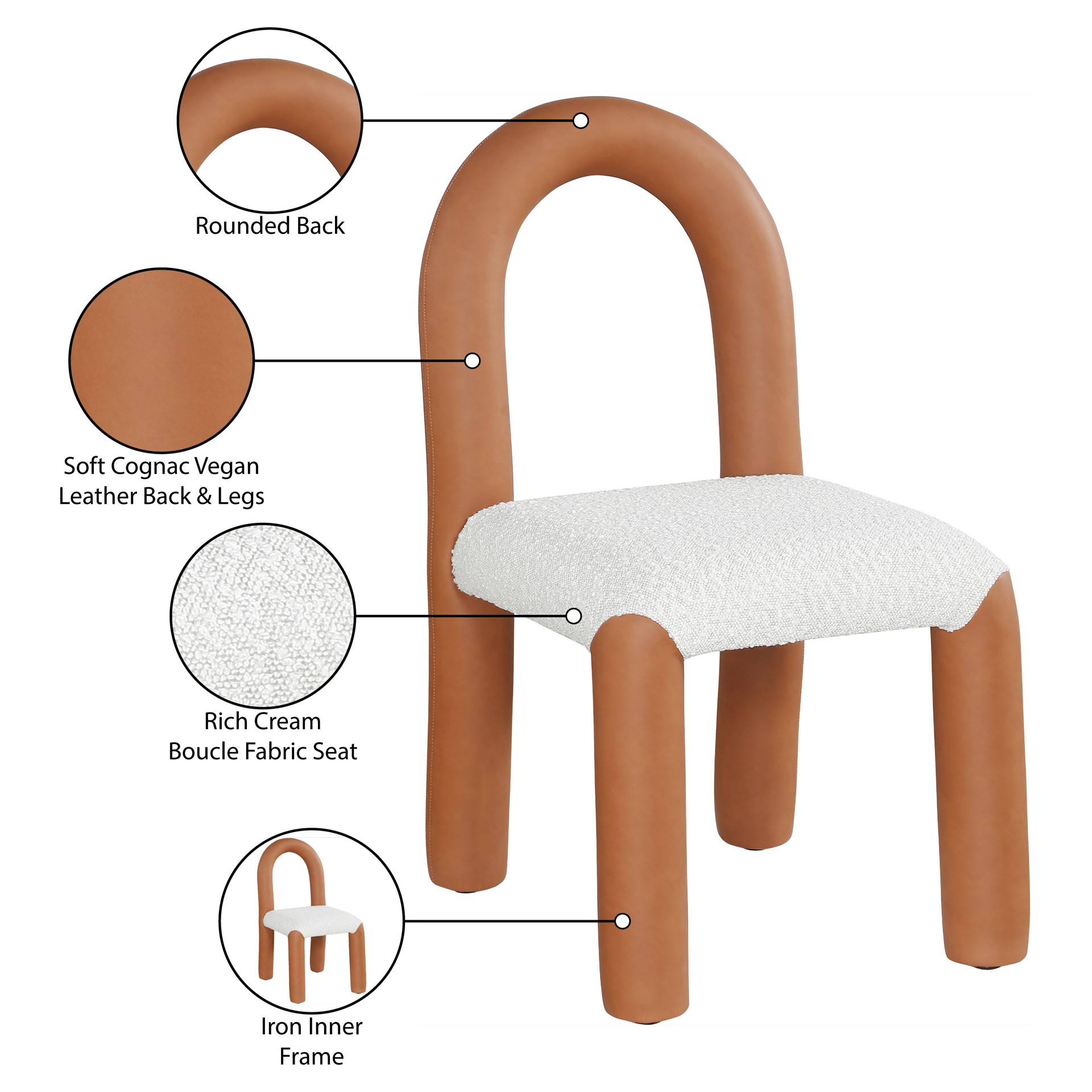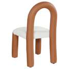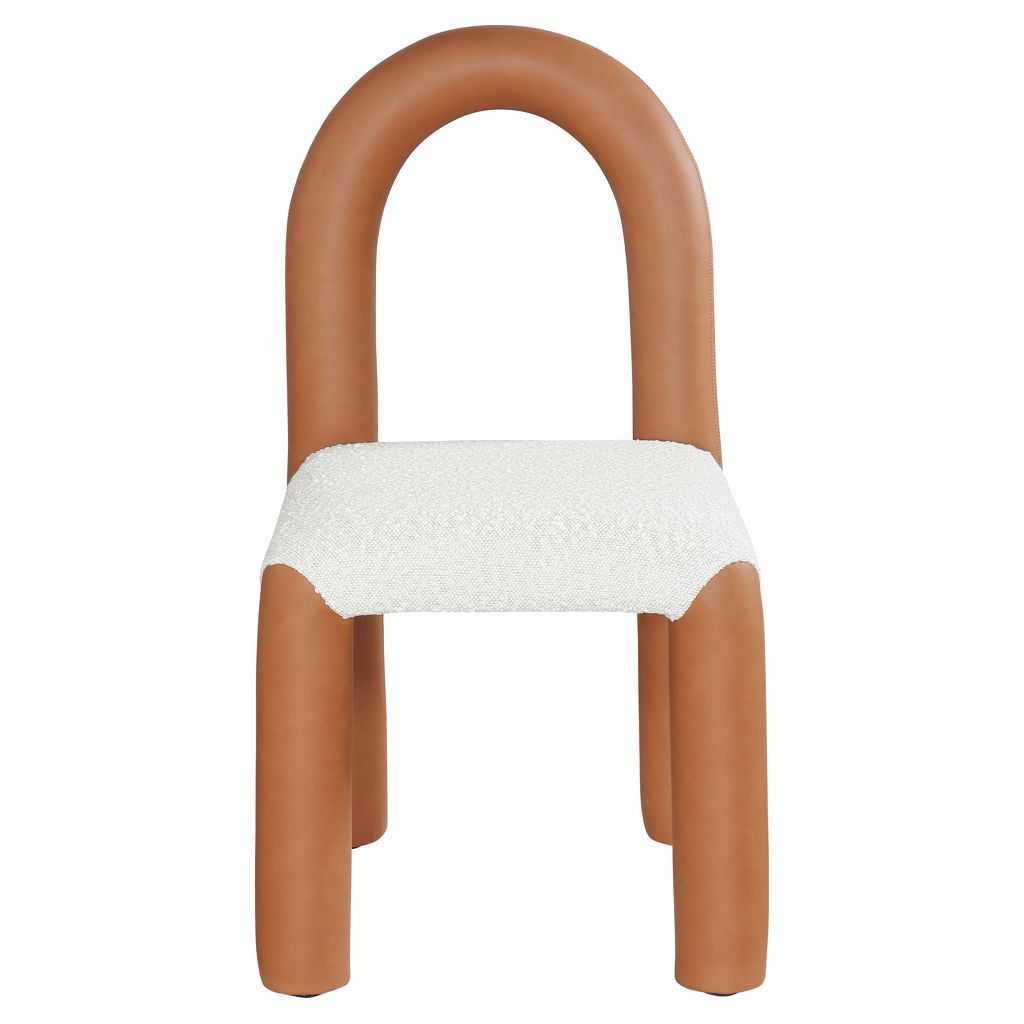 Indulge in the allure of the vegan leather and boucle fabric Amari Dining Chair by Meridian Furniture. Its captivating design and luxurious cognac vegan leather and boucle fabric finish elevate any space with effortless elegance.